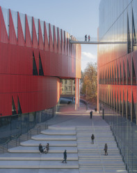 Jenže arénu netvoří jen ona okrouhlá budova, ke které se soustředí největší pozornost. Ve skutečnosti jde o soubor čtyř staveb – slovy architektů rovnou „kampus“. Dvě z nich tu stály už dříve: tréninková hala a další provozní objekt, obě z tohoto století. Nově k nim podle návrhu Chybik + Kristof přibyly dvě další – samotná multifunkční aréna a formálně příbuzná věž u křižovatky, která obsahuje tělocvičnu, posilovnu, hotel, hospodu i fanshop. Výhodou takto komponovaného areálu je, že se jednotlivé stavby dají prakticky obejít. Nevzniká tu tedy bariéra, jakou byl dřívější val.