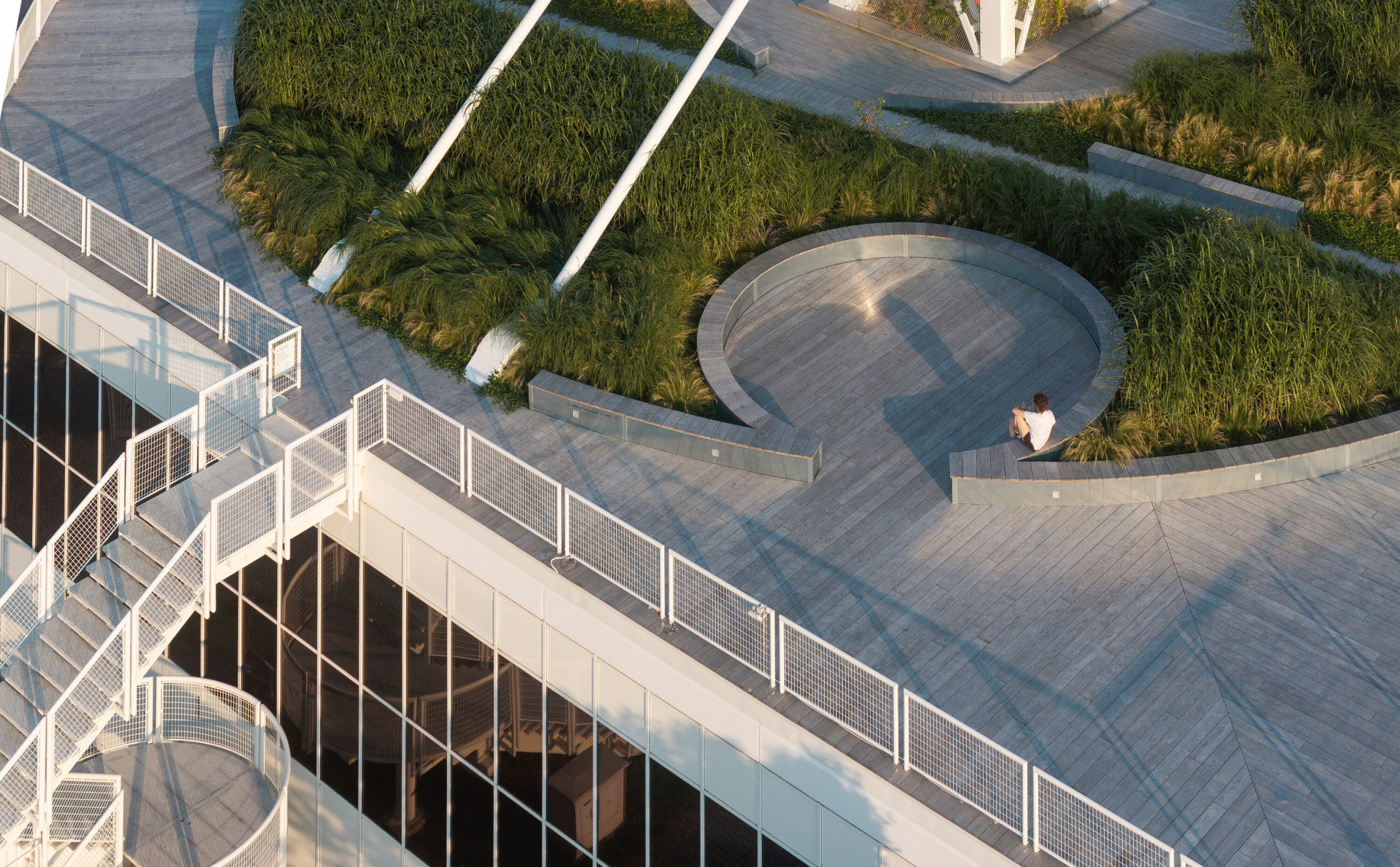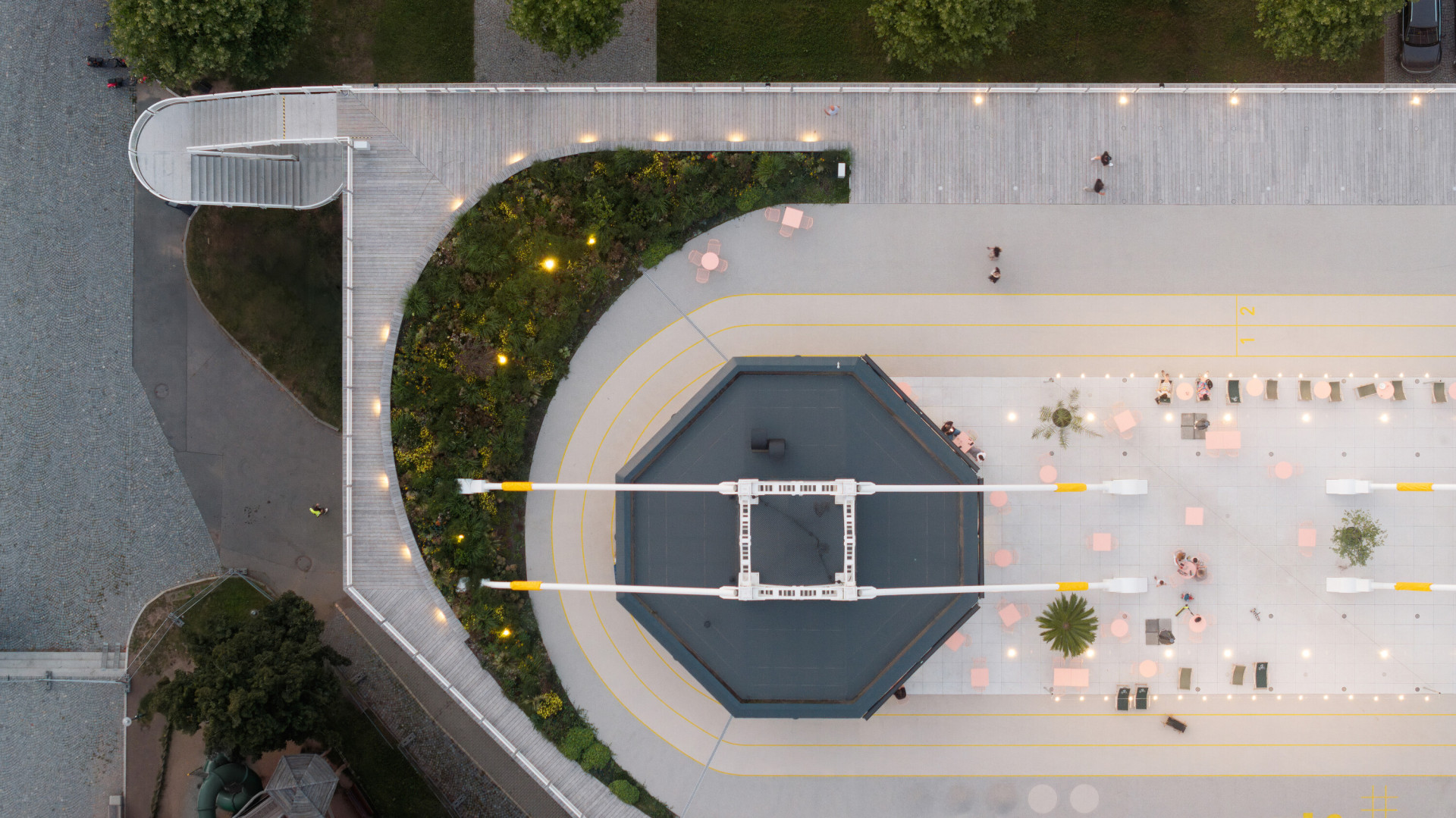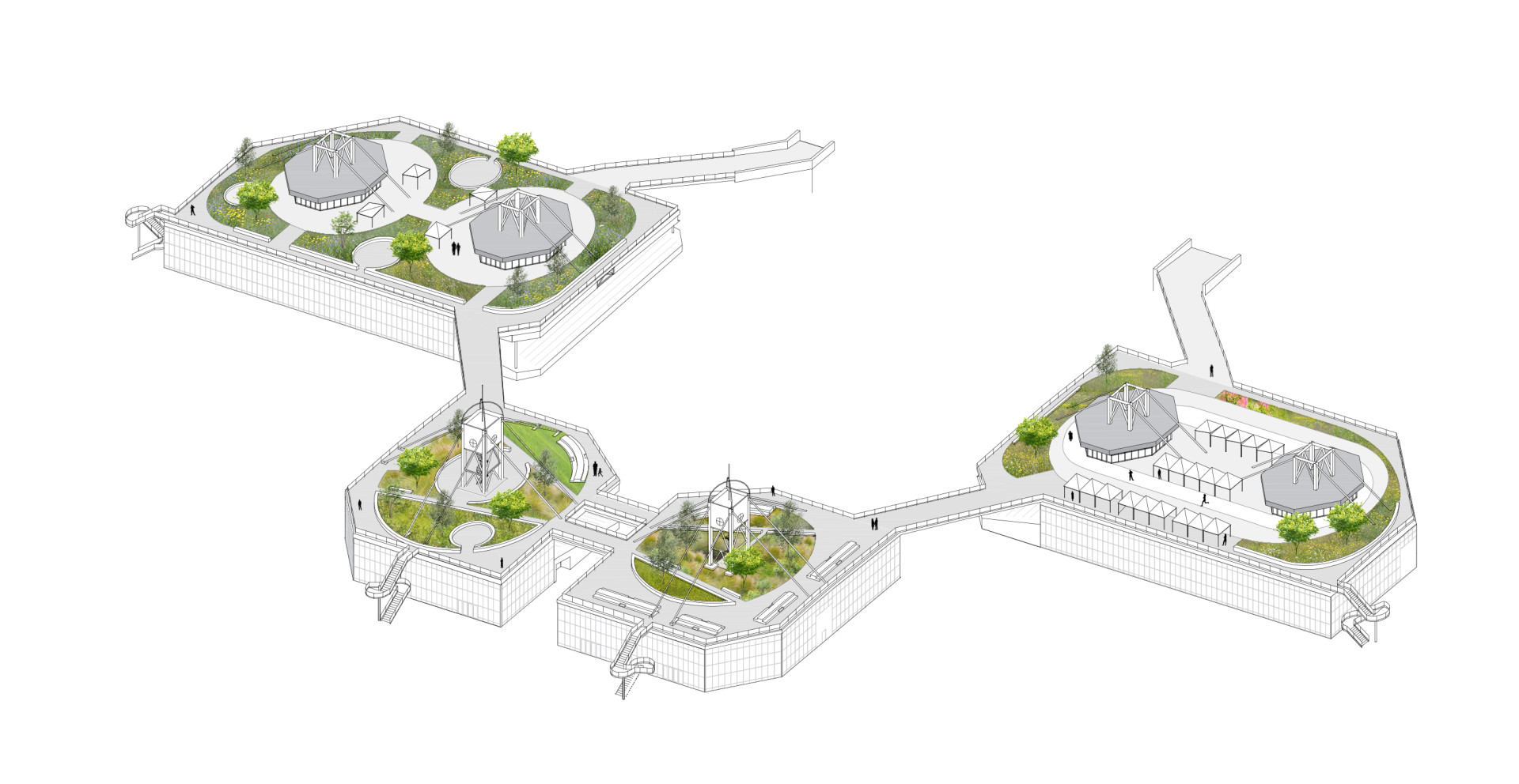 Největším lákadlem pavilonů jsou veřejně přístupné zelené střechy. Nachází se na nich mexické bistro, dá se tu jen tak procházet nebo posedět a dívat se, jak opravují sousední Průmyslový palác. Původně přitom měly střechy povrch z betonu, dokonce se na ně dalo vjet autem.