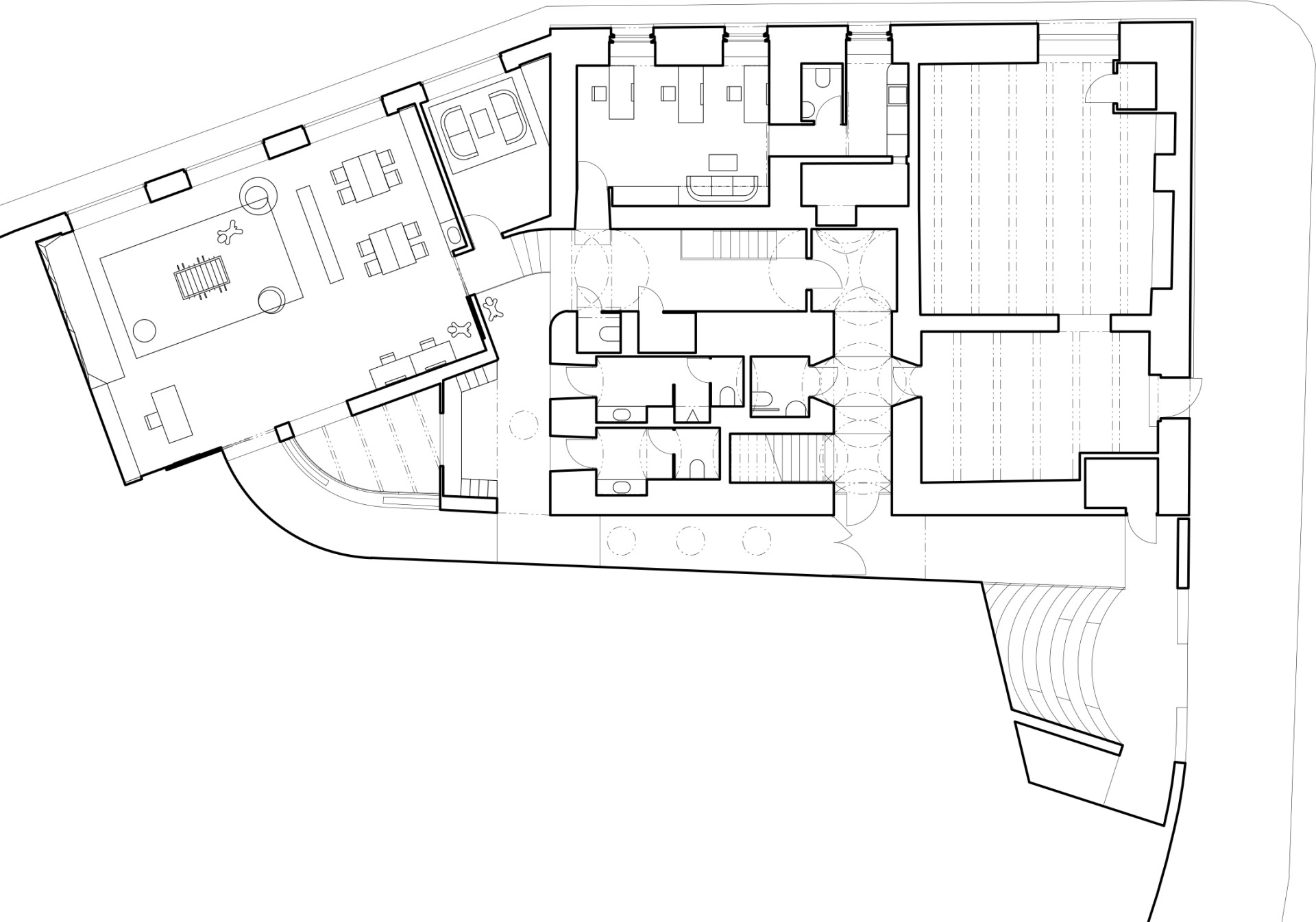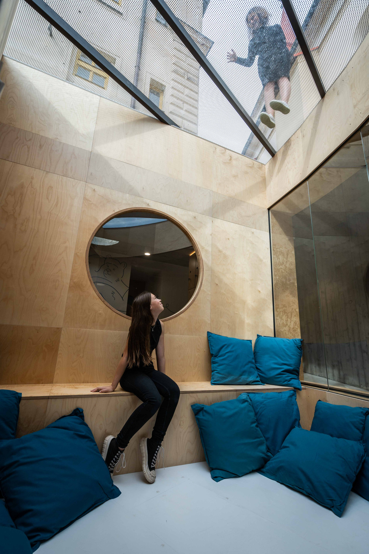 Příchozí projde novou podzemní chodbou do haly se šatnou, a pak pokračuje dále. Centrum nabízí menší místnosti, kde si mohou návštěvníci promluvit se sociálním pracovníkem. Je tu i počítačový koutek, relaxační místnost, část na pohyb s lezeckou stěnou i venkovní plácek. Světlo dovnitř přivádí kromě oken také velký světlík.