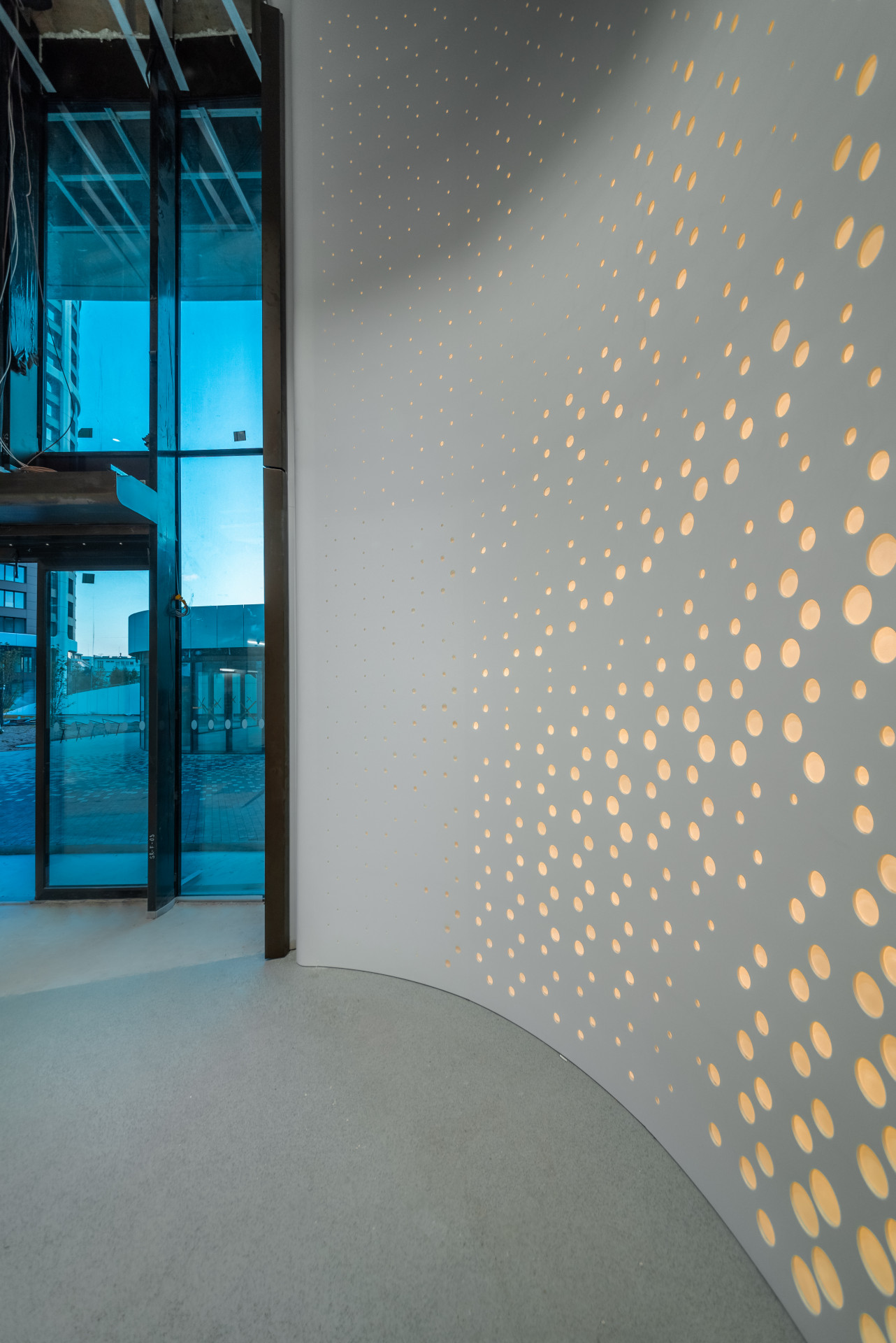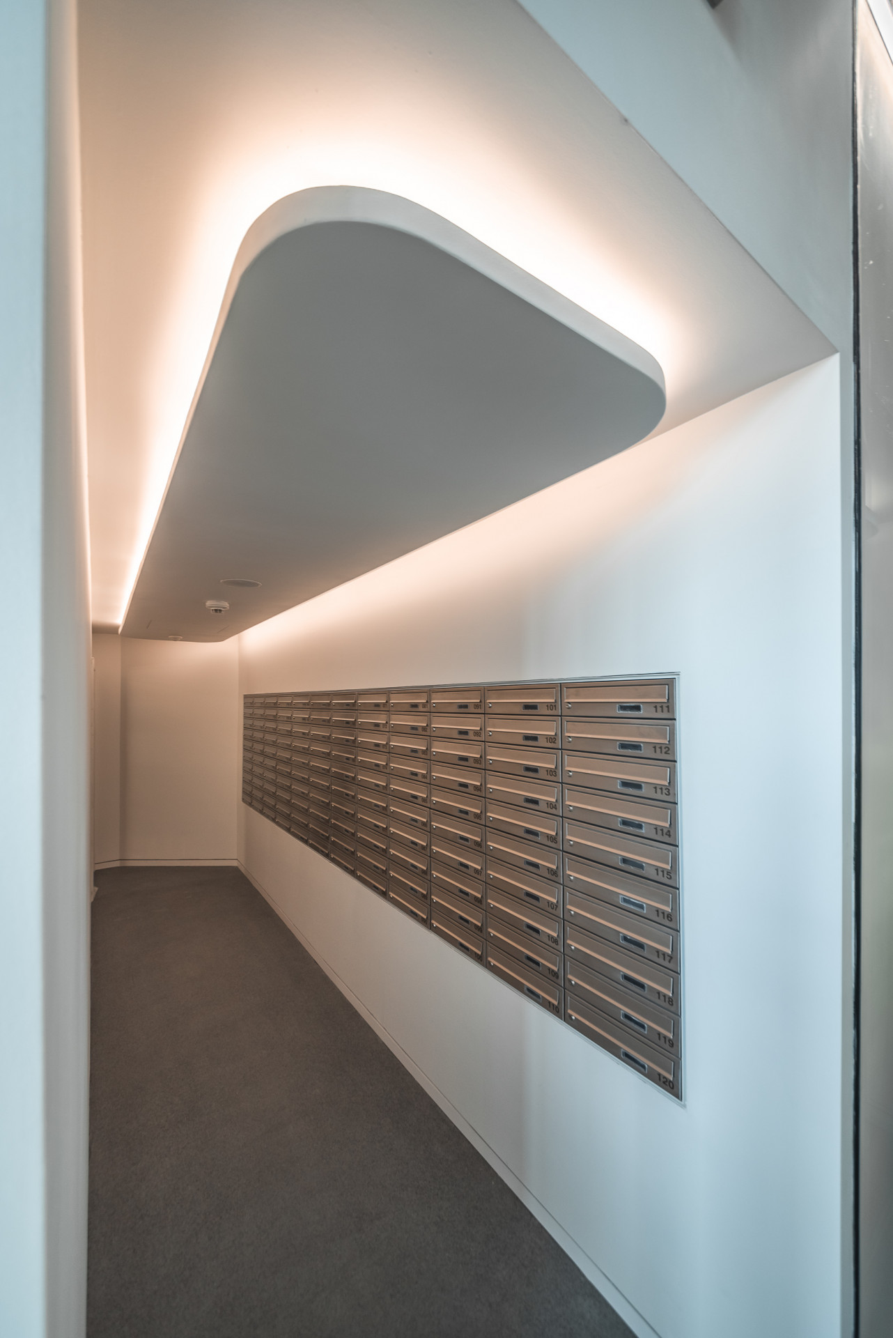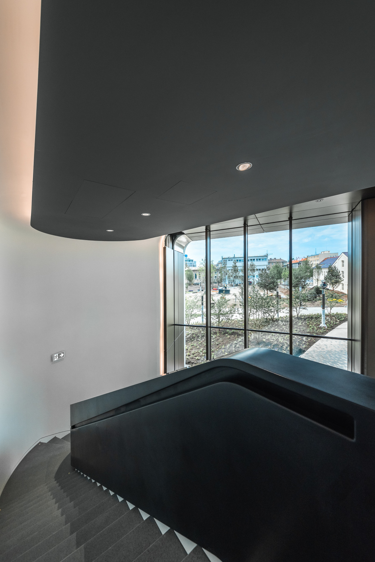 Světlé barvy převažují i ve společných vnitřních prostorech. Zde využívali architekti také dlaždice značky RAKO, která pokrývají až 8 000 m2. „Stavba obytných věží se začala připravovat spolu s uvedením dlaždic RAKO v té době v novém formátu 120 x 60 cm. Zajímavostí byla výroba soklů na zakázku, které požadoval investor v co nejmenší výšce z důvodu technických omezení na stavbě. Dodali jsme tedy sokly, jejichž výška byla jen 6 cm, což samozřejmě s ohledem na délku 120 cm byla docela výzva. Sokly se jako standardní výrobek prodávají jen do délky 80 cm o výšce 9,5 cm,“ vysvětluje technický expert značky RAKO, L'udovít Bulla. Pro provozně náročné komunikační prostory schodišť a společných prostor vybrali autoři dlažbu EXTRA v tmavě šedém odstínu. Dlaždice zaujmou svým matným povrchem docíleným technologií digitálního tisku a speciální glazuře. Samozřejmými technickými parametry splňující technické normy pro schodiště jsou požadovaná protiskluznost a otěruvzdornost.