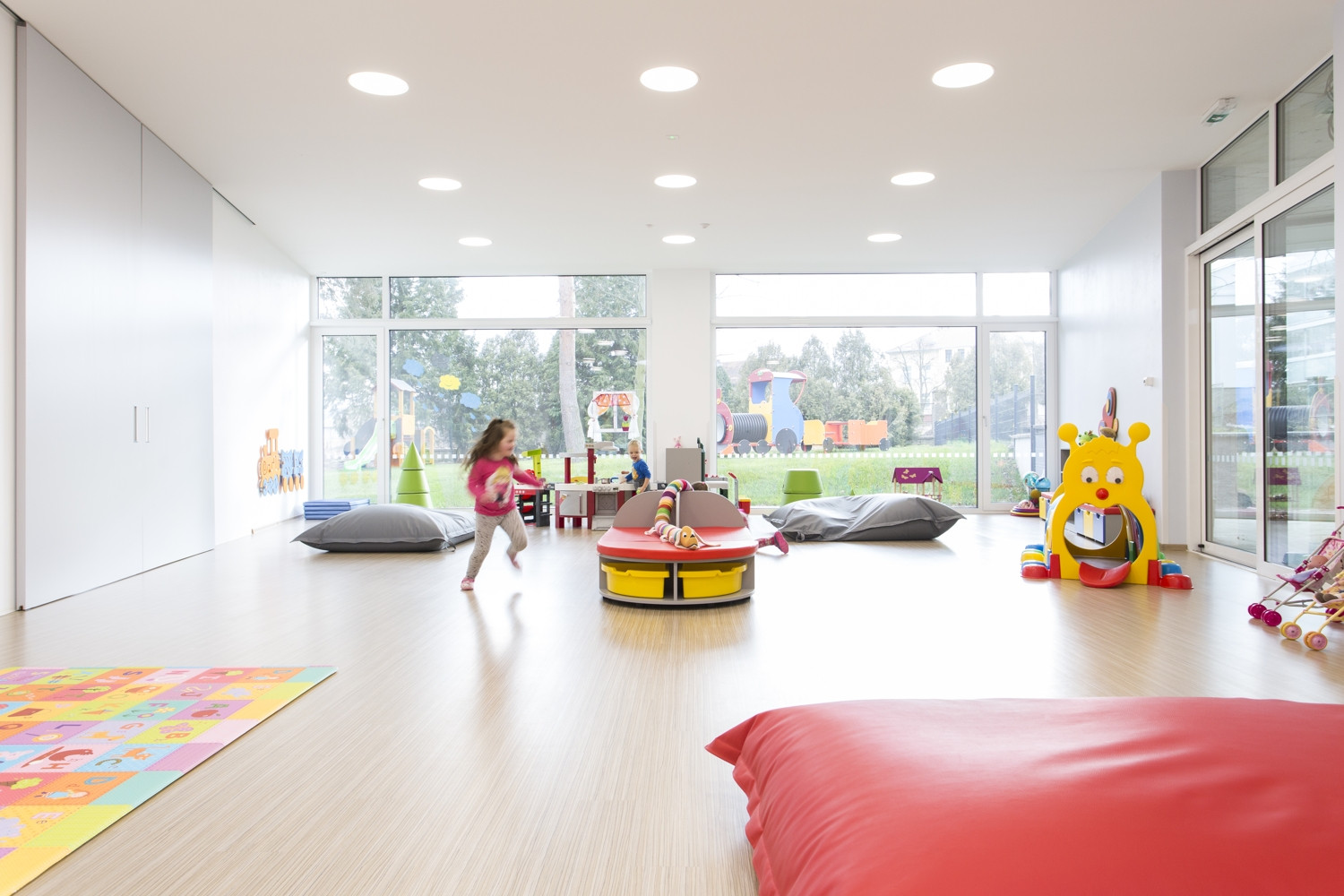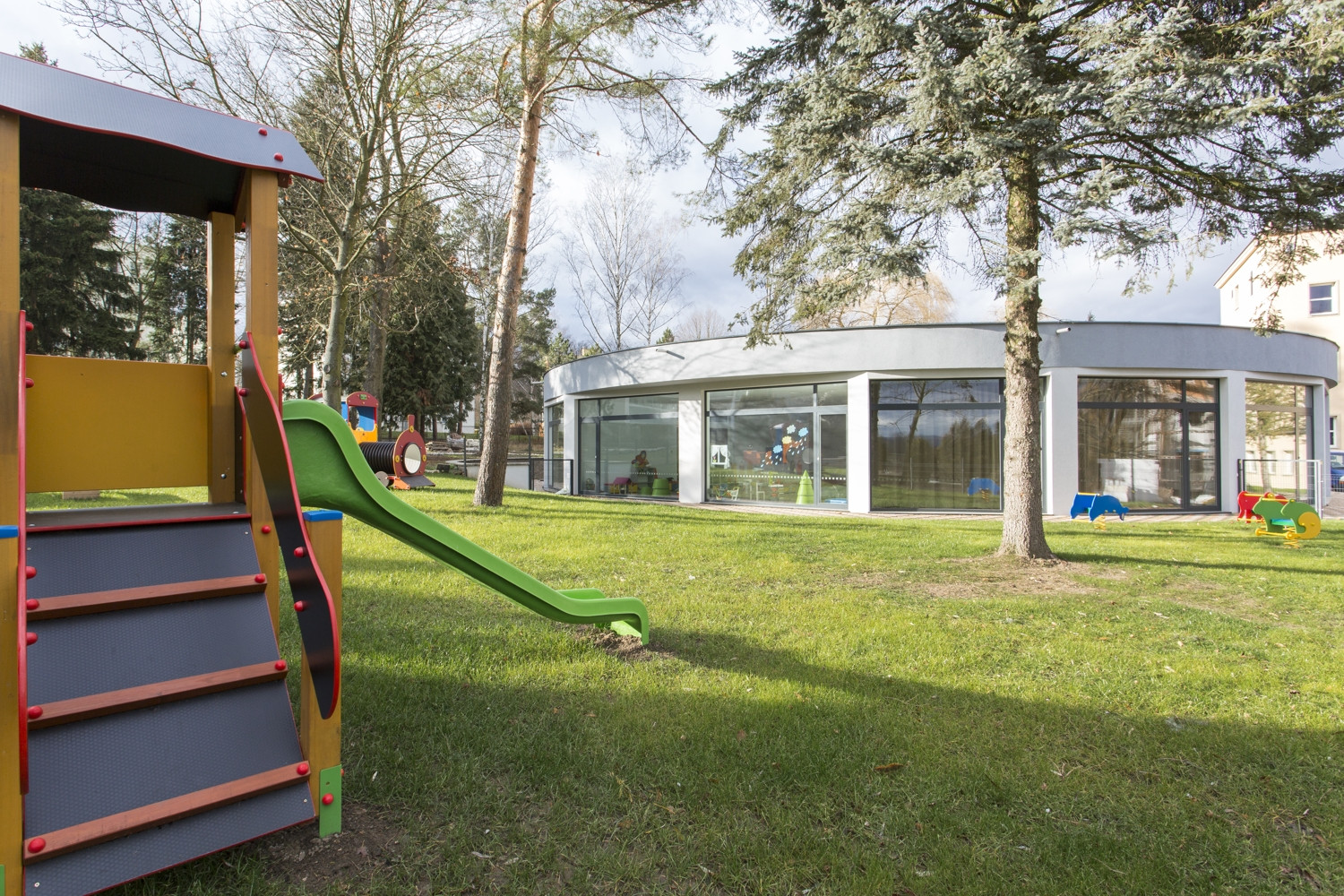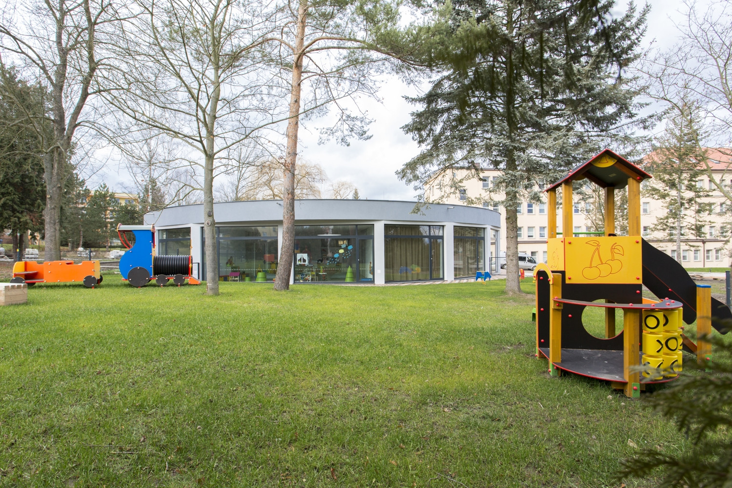 Krychle, kruhový zářez do jejího středu, hravá améba a nakonec nepravidelná pěticípá hvězda vepsaná do kruhu. I tak by se dal v bodech shrnout vývoj tvaru mateřské školy Hvězda, kterou do středočeského města Hořovice navrhl před čtyřmi lety architekt Petr Tuček. Školka se nachází nedaleko hořovického zámku, v jižním cípu areálu místní nemocnice, obklopená parkovou zelení. Ideovou inspirací se Tučkovi staly centrální stavby, jako například Letohrádek Hvězda na pražské Bílé Hoře, který funguje na principu soustředných kružnic, po nichž lze objekt obejít jak vnitřními prostory, tak vně po jeho obvodu.