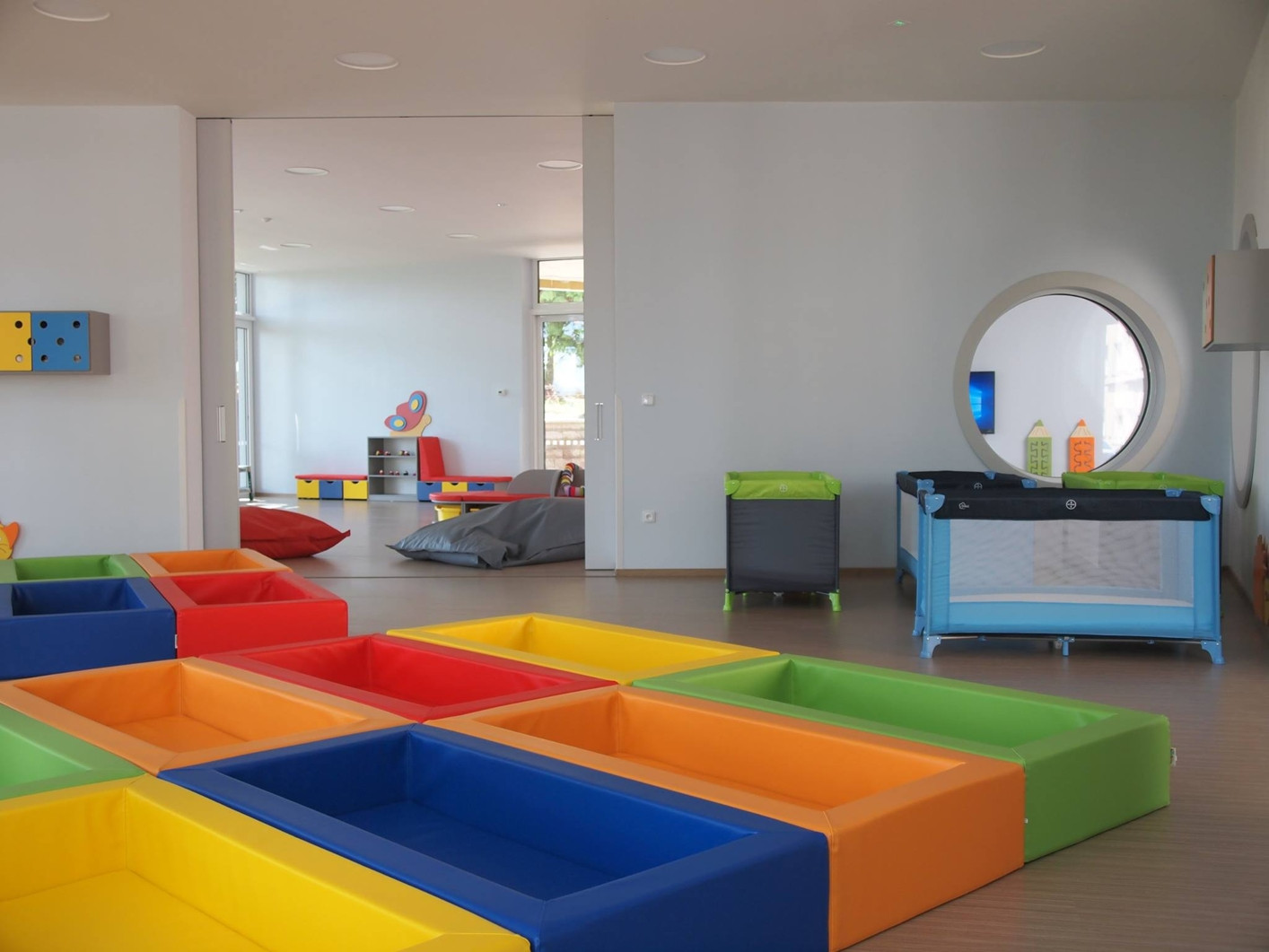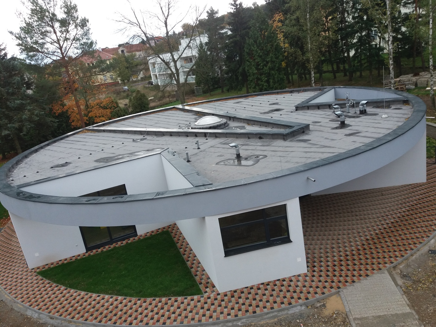 Po materiálové stránce se školka skládá z klasické zděné konstrukce s železobetonovým kruhovým zastřešením. Bíle omítané stěny střídá prostorné prosklení umožňující výhled do okolního parku. Poměrně netradiční materiál se však objevuje v interiéru, přesně na okenním otvoru ze vstupní haly do herny. K jeho použití vedly rodičovského zkušenosti samotného autora návrhu. Daným materiál představuje speciální folie, která ovšem propouští světlo pouze jedním směrem. Díky tomu má tak rodič přehled o svém dítěti i při odchodu, zatímco z druhé strany folie funguje jako zrcadlo.