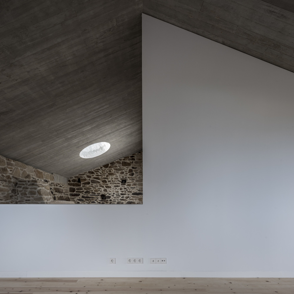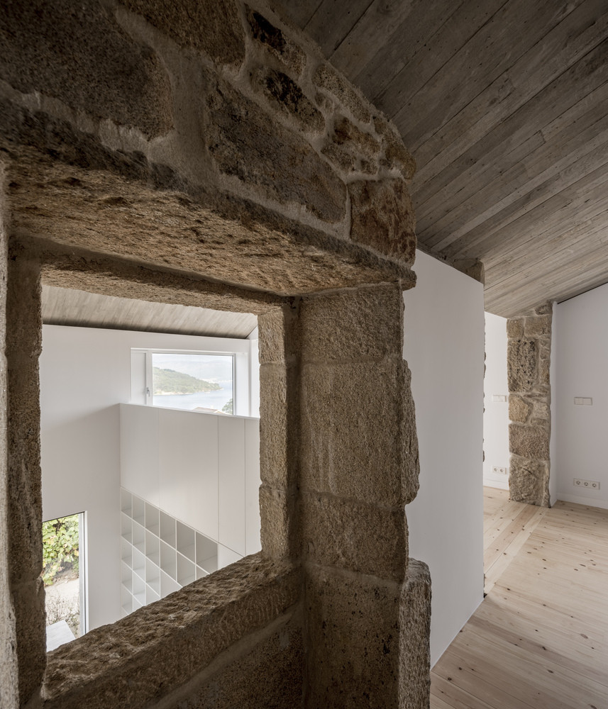 Se stejným respektem, s jakým autoři pojali betonovou dostavbu, přistoupili i k řešení interiéru. Ten drží původní členění včetně různých výškových úrovní. I zde se pak projevuje přiznaná materialita konstrukcí. Kámen zachovaných stěn doplnily vedle pohledového betonu bílé konstrukce fungující taky jako vestavěný nábytek a dřevo z místních borovic, které v podobě podlah a schodů prostupuje celým vnitřním prostorem. Společně se dřevem nyní sjednocuje interiér také denní světlo, které do útrob domu vpouštějí mimo jiné tři kruhové střešní světlíky připomínající okna v lodích kajutách. Ale tomu se asi není proč divit – vždyť jsme u břehů oceánu ve staré rybářské vesnici.
