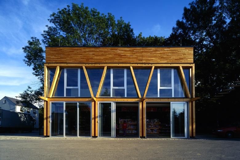 Zastřešení výdejních stojanů pohonných hmot je oproti zažitým zvyklostem řešeno ze dřeva za pomoci ocelovým lanem předpjatých dřevěných trámů s rozponem 10 metrů, které jsou vsazené s dilatací a možností pnutí v ocelové příhradovině vzniklé nastavením dvojice ocelových U profilů. Dochází tak k výrazně vyšší prostorové tuhosti jinak subtilní ocelovo dřevěné konstrukce. Střechou prorůstá strom, který je zalévaný dešťovou vodou svedenou ze zastřešení.