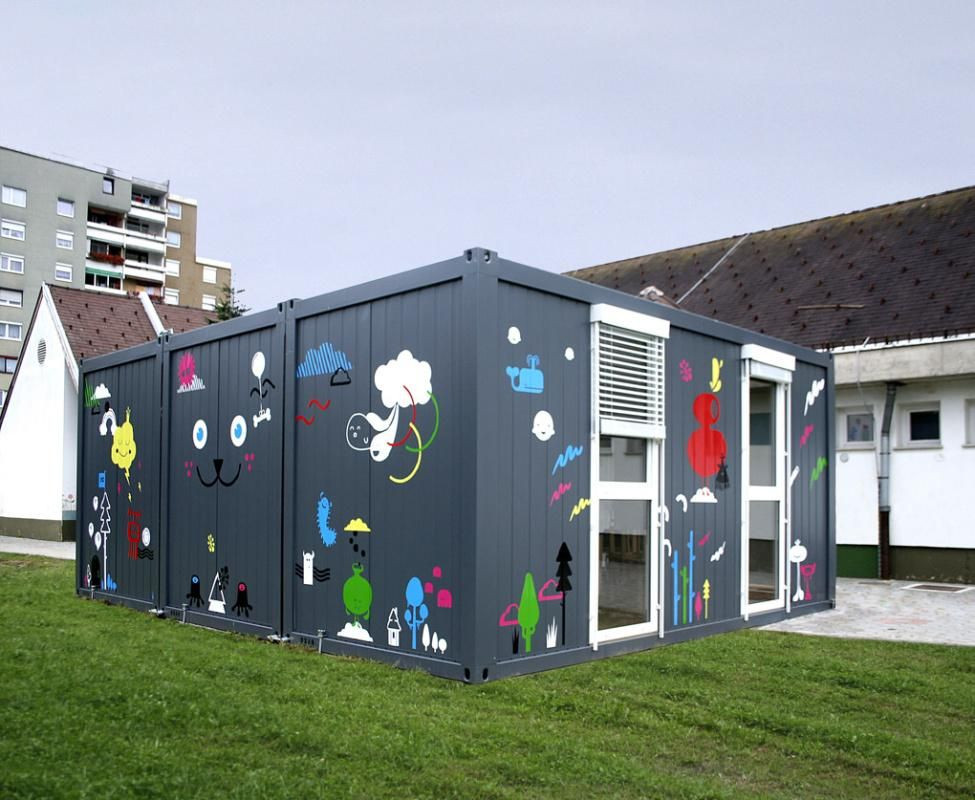V malém Slovinském městečku poblíž hranic s Rakouskem se musely školky vypořádat s náhlým zvýšením počtu malých dětí. Původní záměr byl rozšířit stávající školky novými přístavbami. To byl však plán na delší dobu. V té době tedy úřady přistoupily k efektivnímu řešení použitím ISO kontejnerů, jejichž výhodou je rychlost a nízká cena.