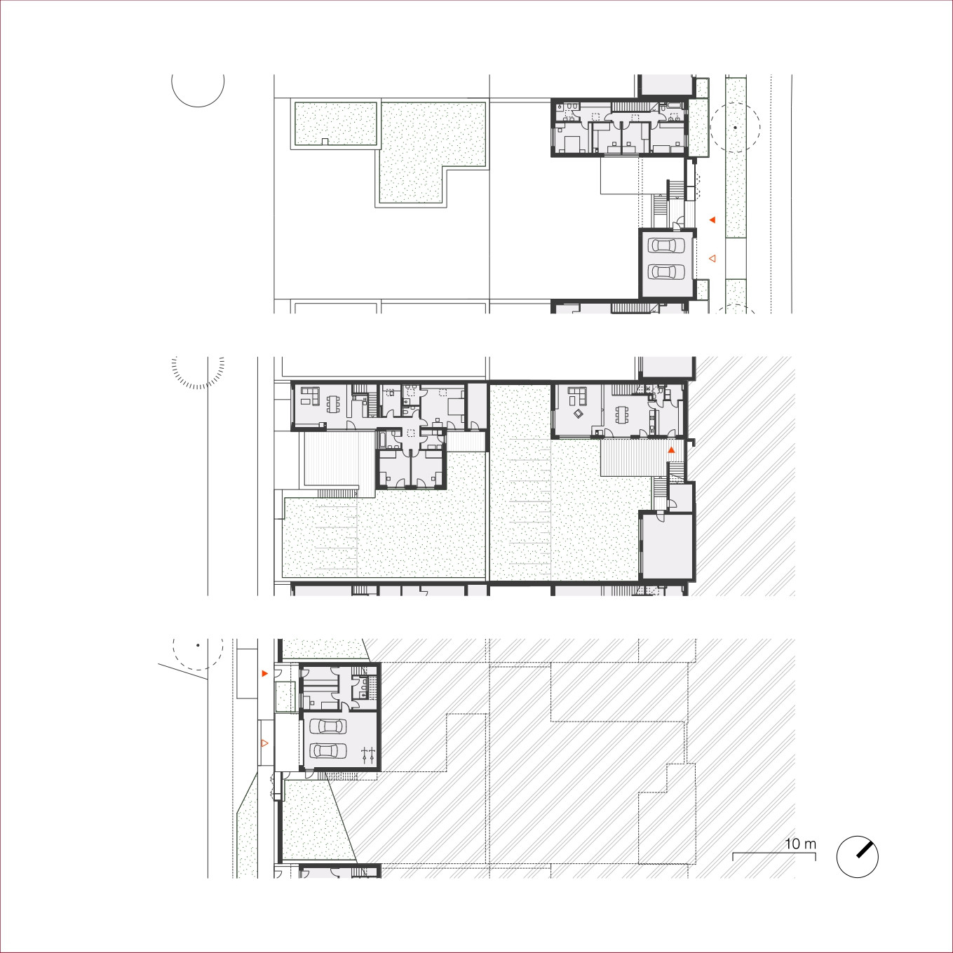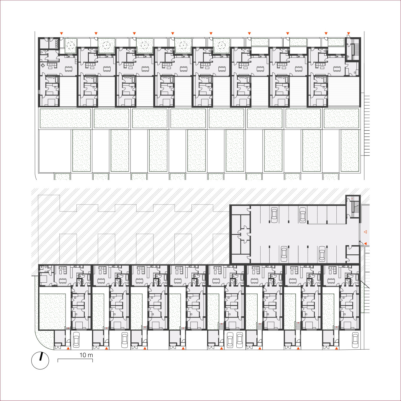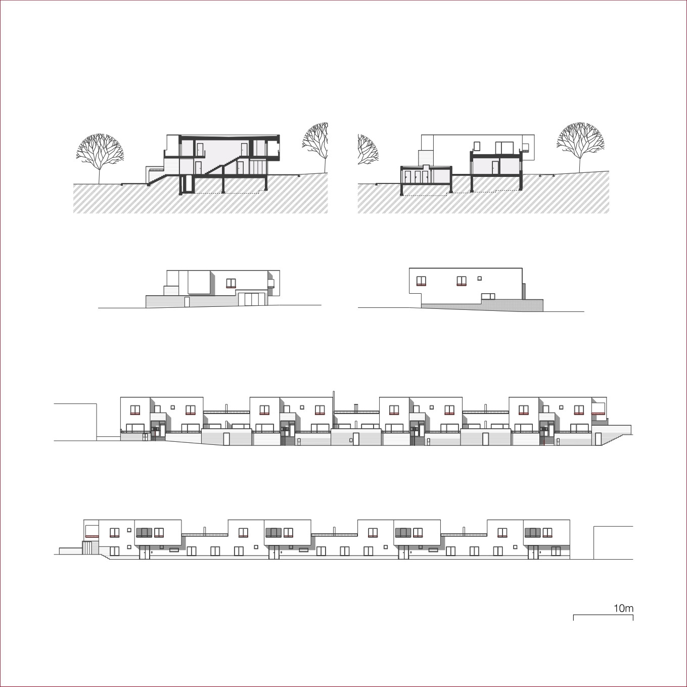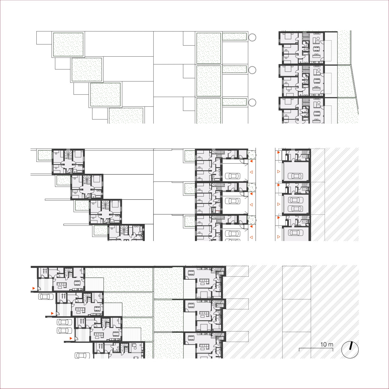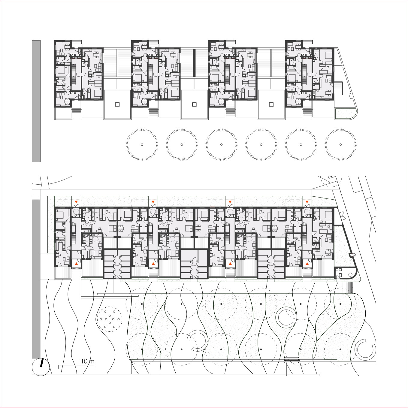 Okolo veřejného „srdce“ čtvrti se rozvíjí celkem padesát sedm řadových rodinných domů různých typů. Jejich uspořádání sleduje morfologii terénu, čímž vzniká přirozeně působící obytný soubor – kompaktní a zároveň vzdušný.
