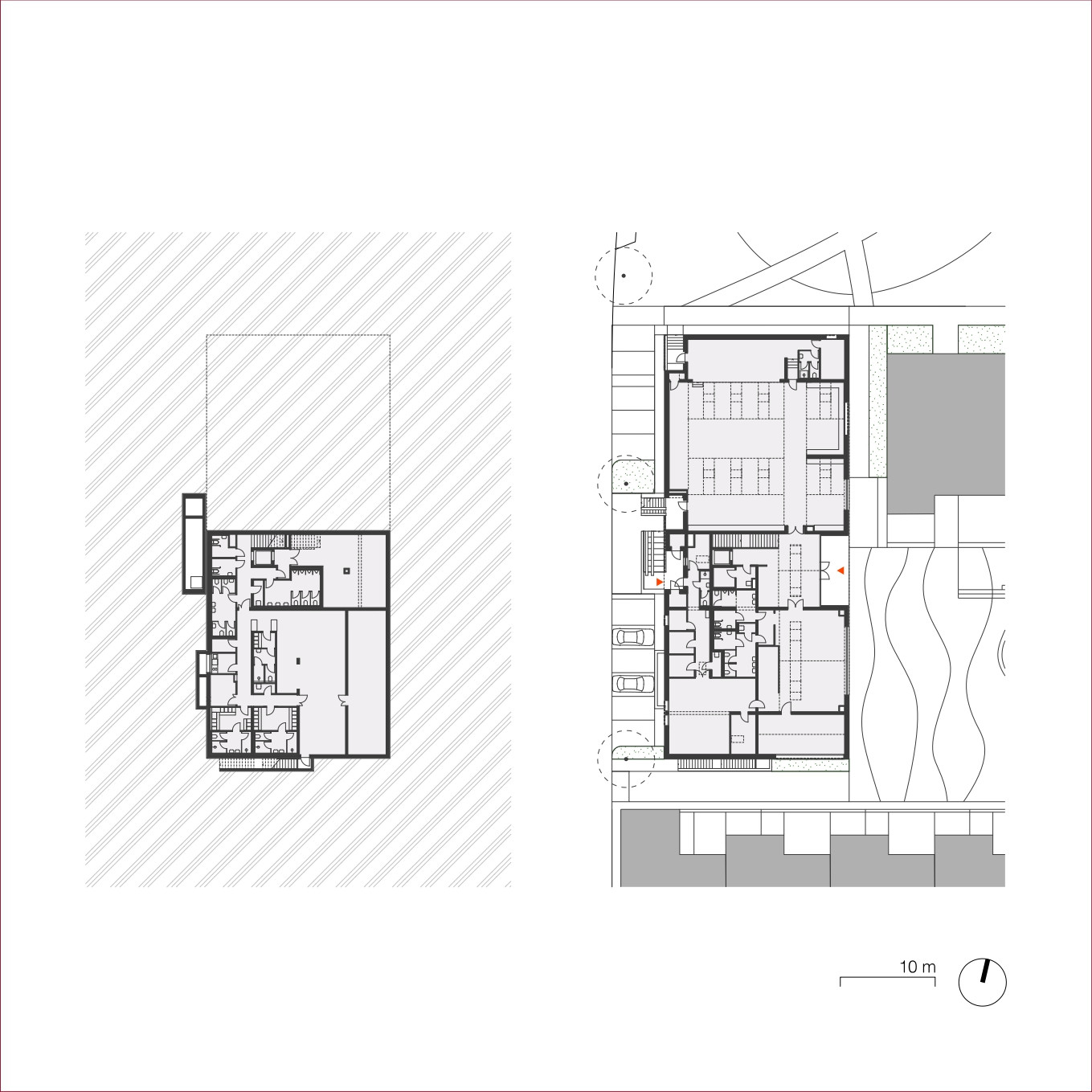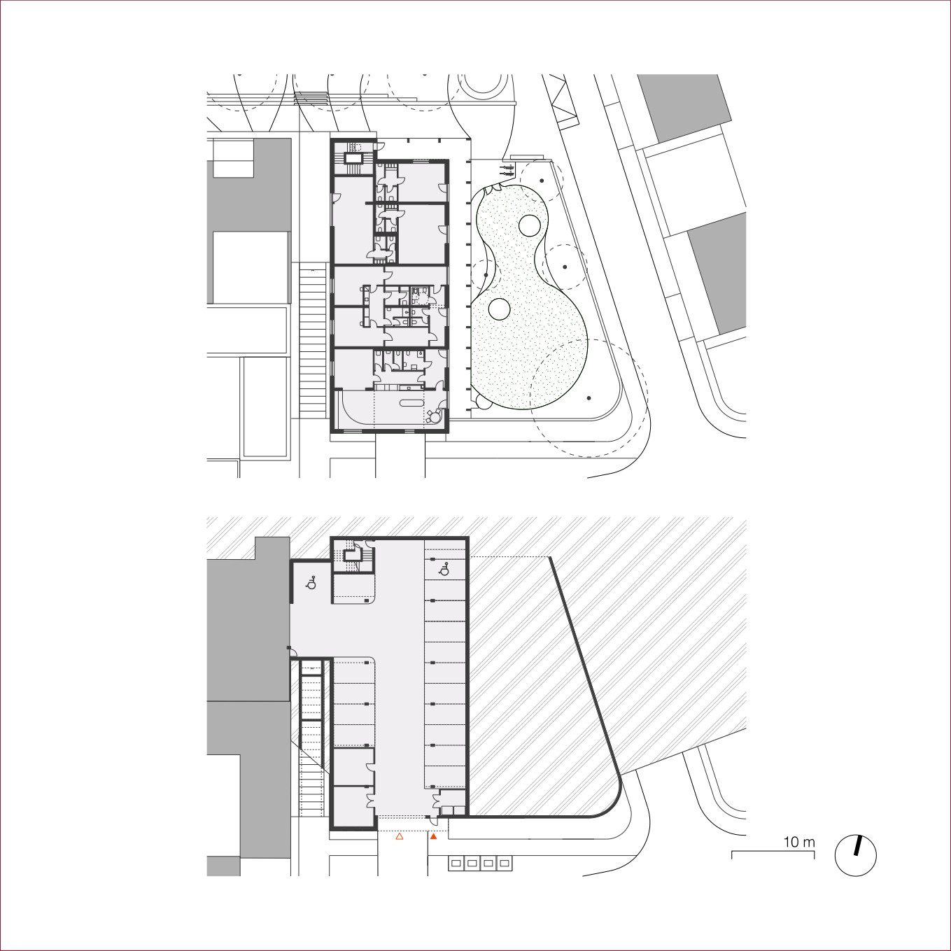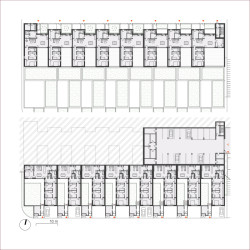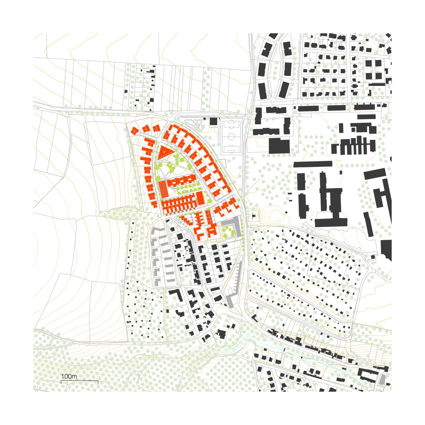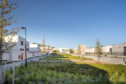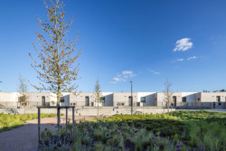 Jádrem nové čtvrti jsou dvě veřejná prostranství – náměstí a park. Náměstí tvoří přirozené centrum života: obklopuje jej komunitní centrum s multifunkčním sálem a restaurací, dům služeb s ordinací, mateřským centrem a obchodem, a také bytový dům s obecními byty. Park se nachází jen kousek odtud, na jeho okraji stojí nová mateřská škola, částečně zapuštěná do svahu.