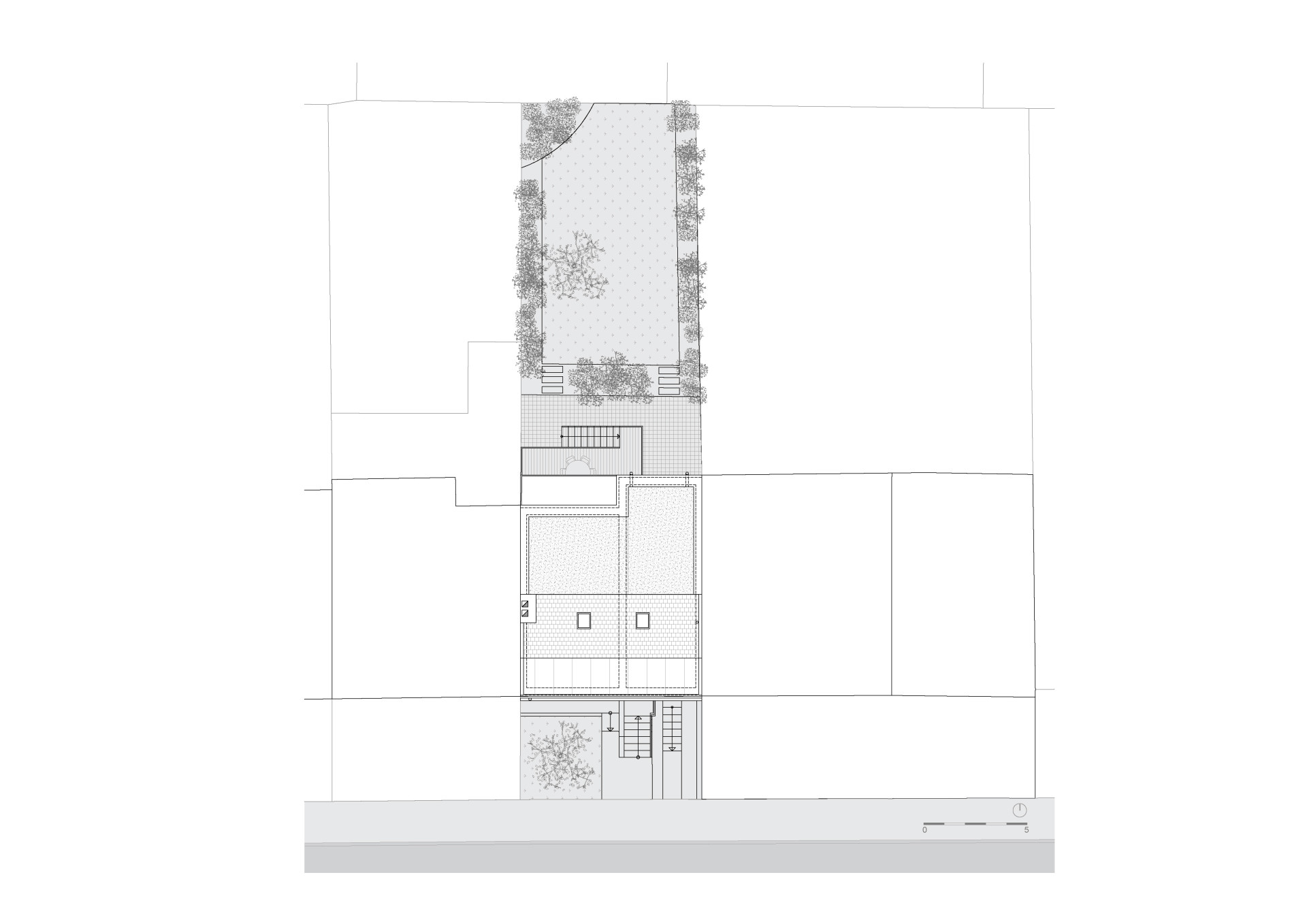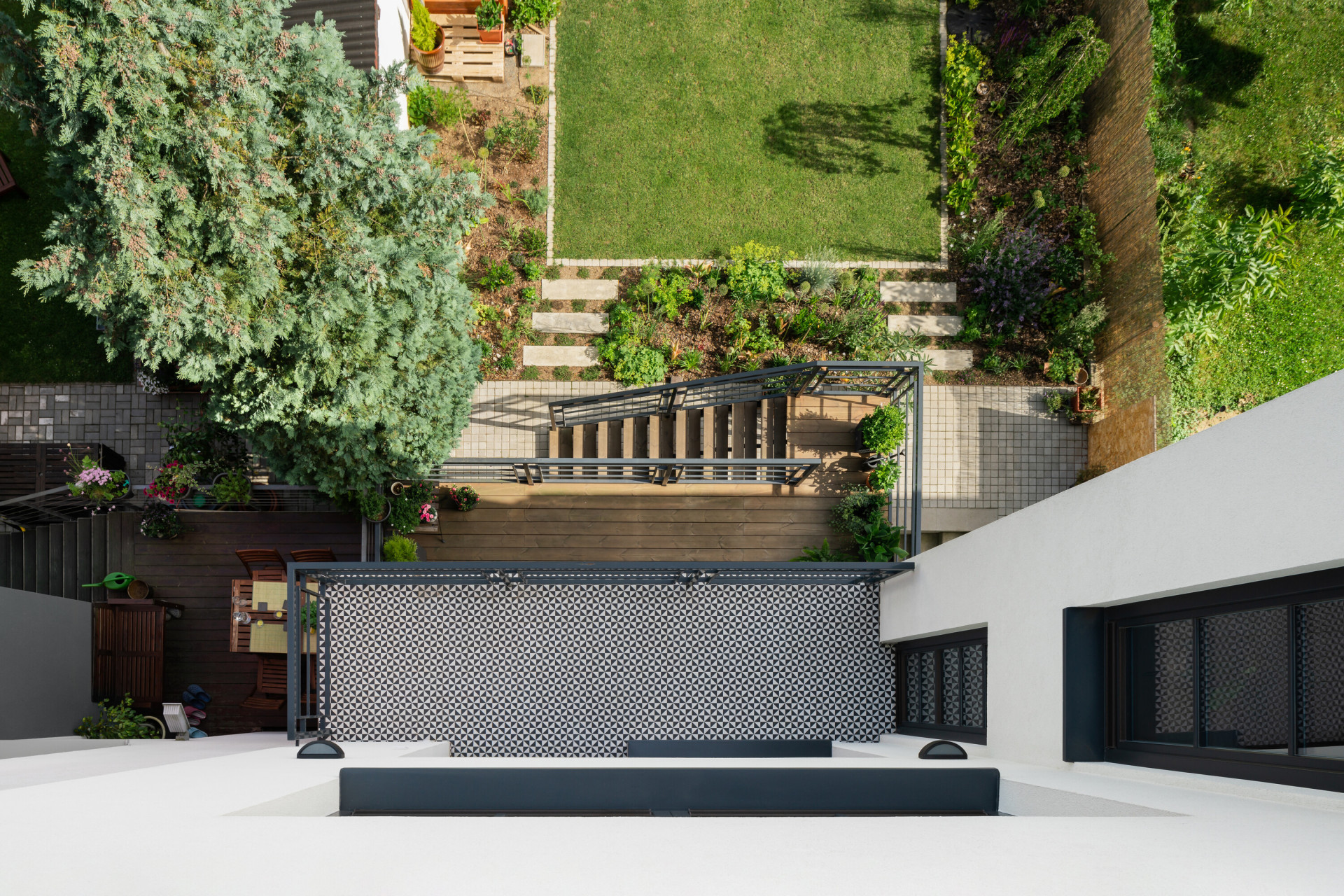 Dům, který si rodina koupila, byl sám o sobě kvalitní a velkorysý, potřeboval však nemalý zásah v interiéru a celkovou rehabilitaci, aby odpovídal potřebám života ve 21. století. Jednou z hlavních proměn interiéru se stalo schodiště. To původní, slovy autorů „jemně depresivní ocelové schodiště zazděné v tmavém koutě domu“, potřebovalo razantní změnu.