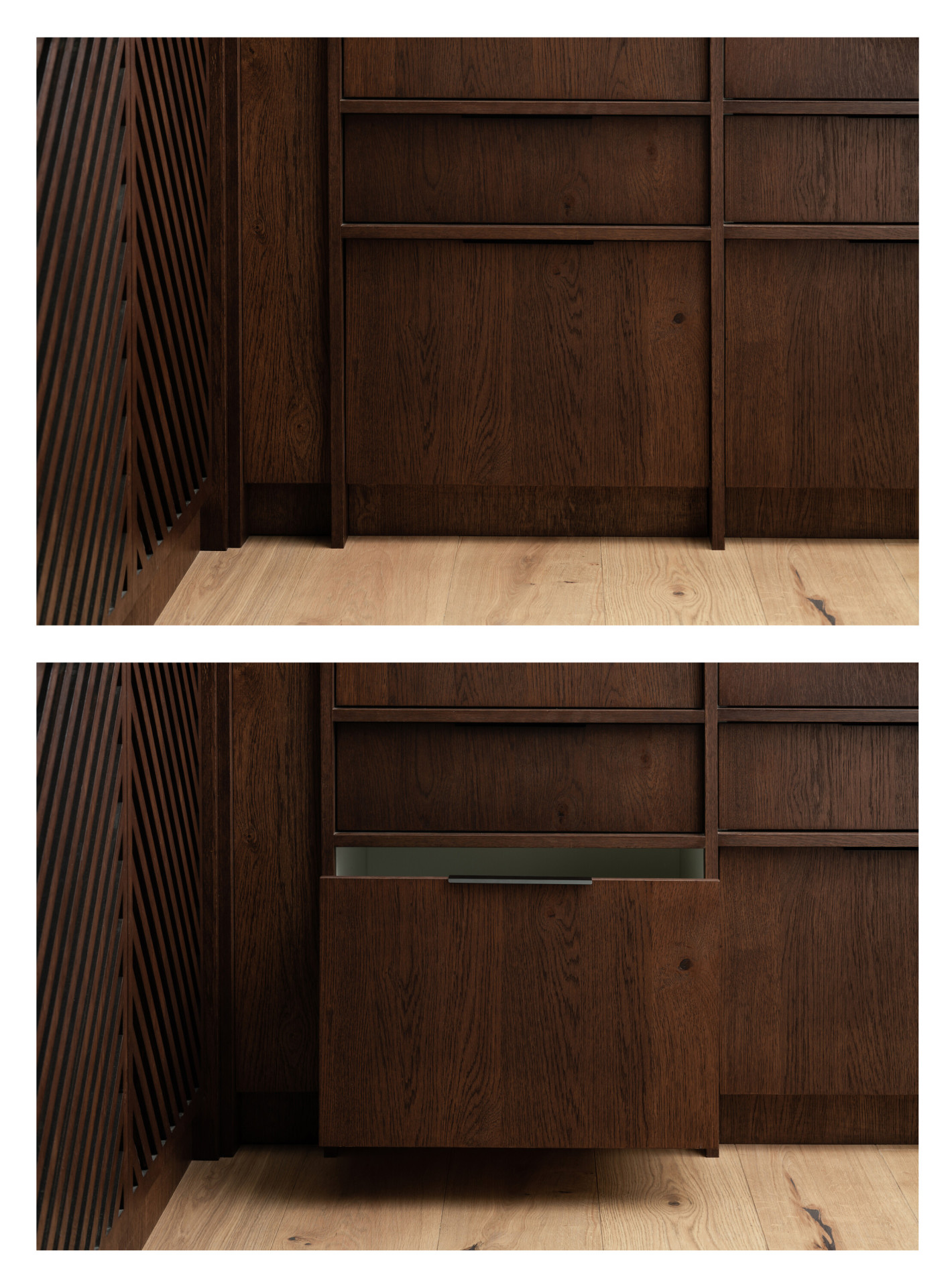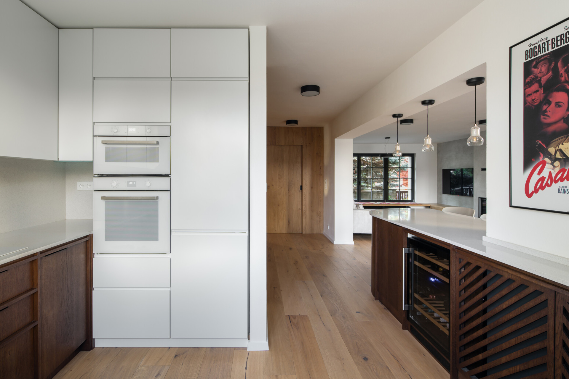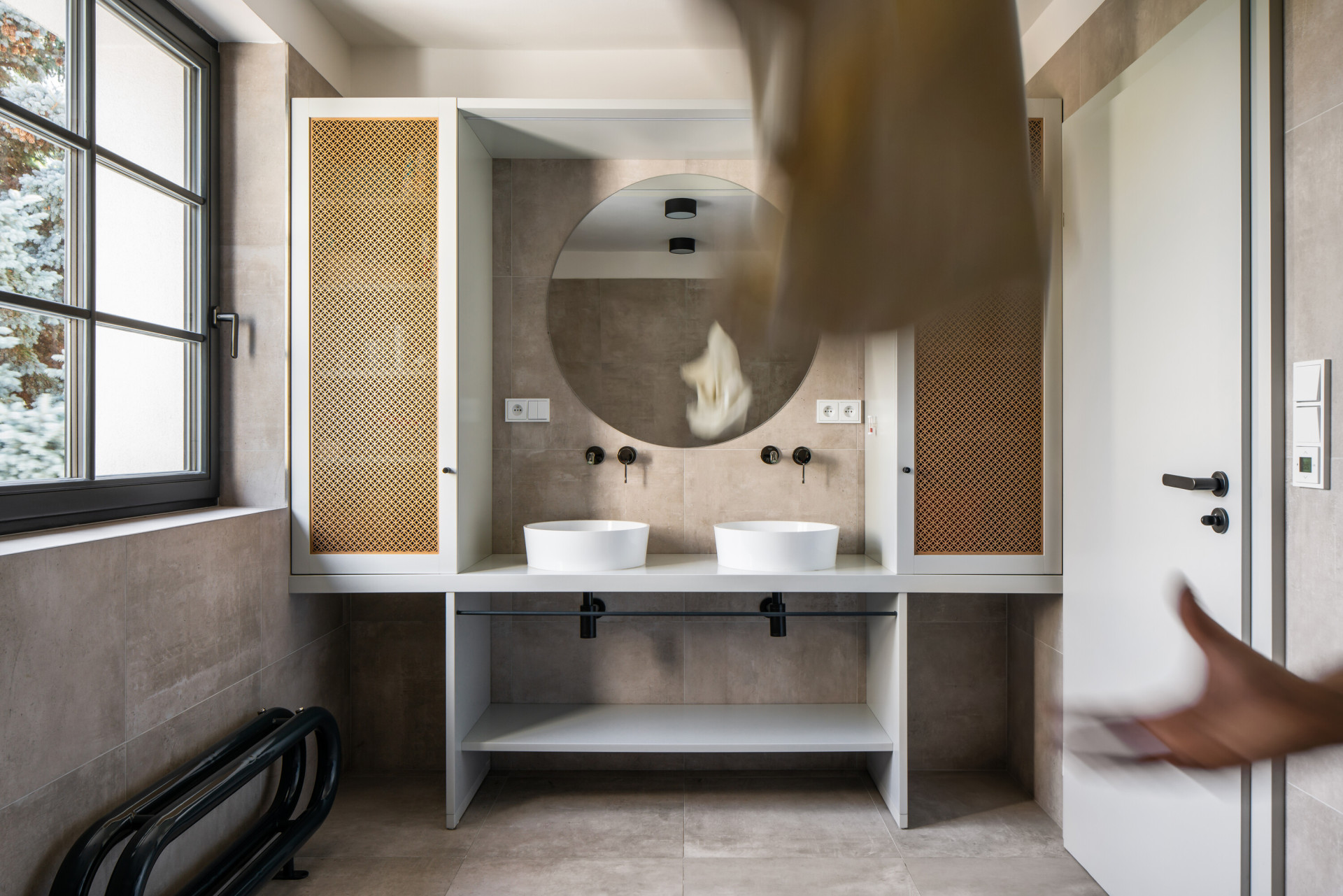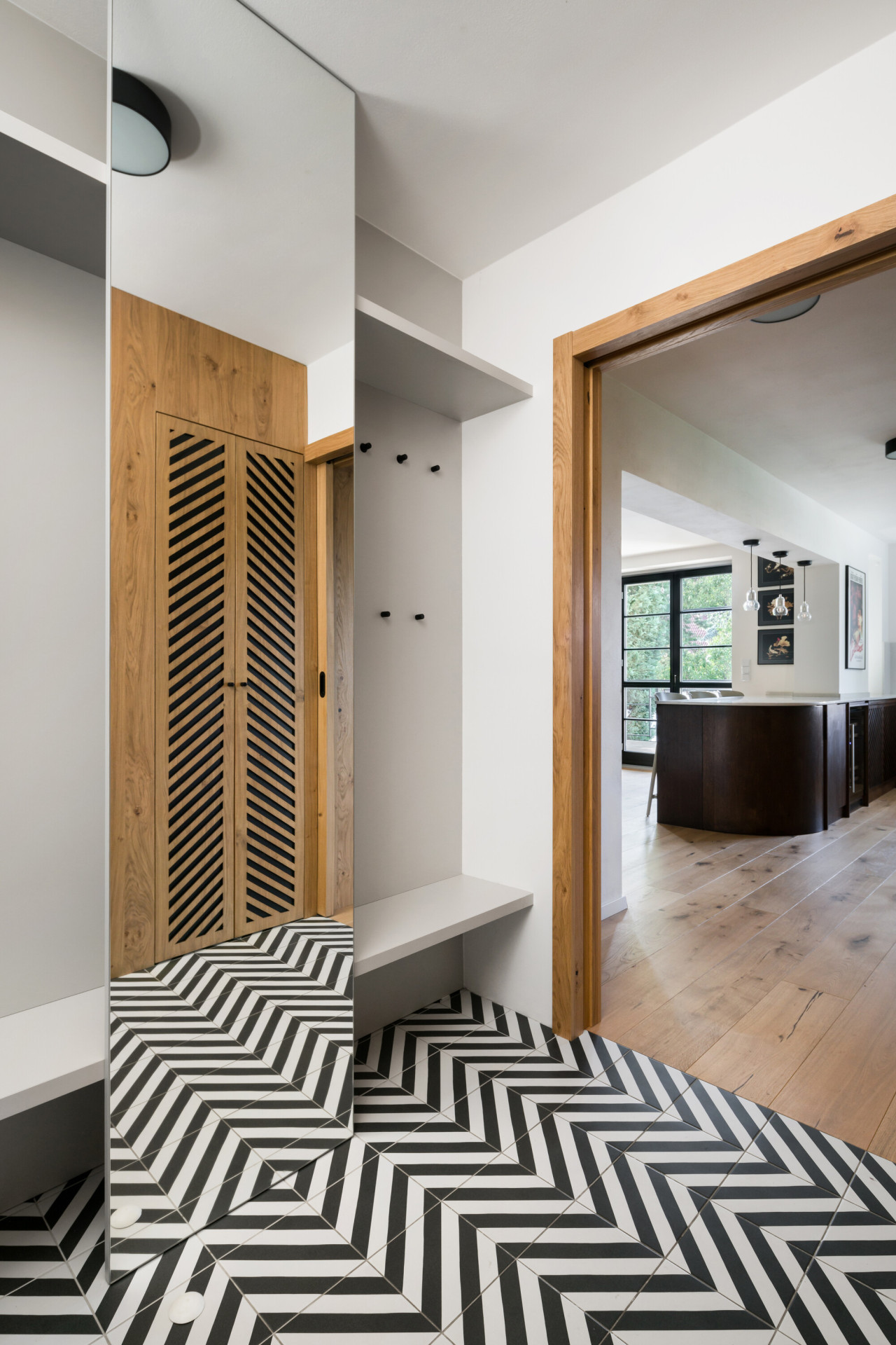 Hlavním materiálem rekonstrukce interiéru se stalo, stejně jako u schodiště, dřevo v proměnlivých odstínech. Spojujícím znakem dřevěných prvků se stal dekor v podobě zrcadlově se opakujících diagonálních perforací ve dřevě a důmyslně provedený řemeslný detail. Tento dekor se neopakuje pouze na schodišti, ale také na černobílé podlaze v koupelně a chodbě.