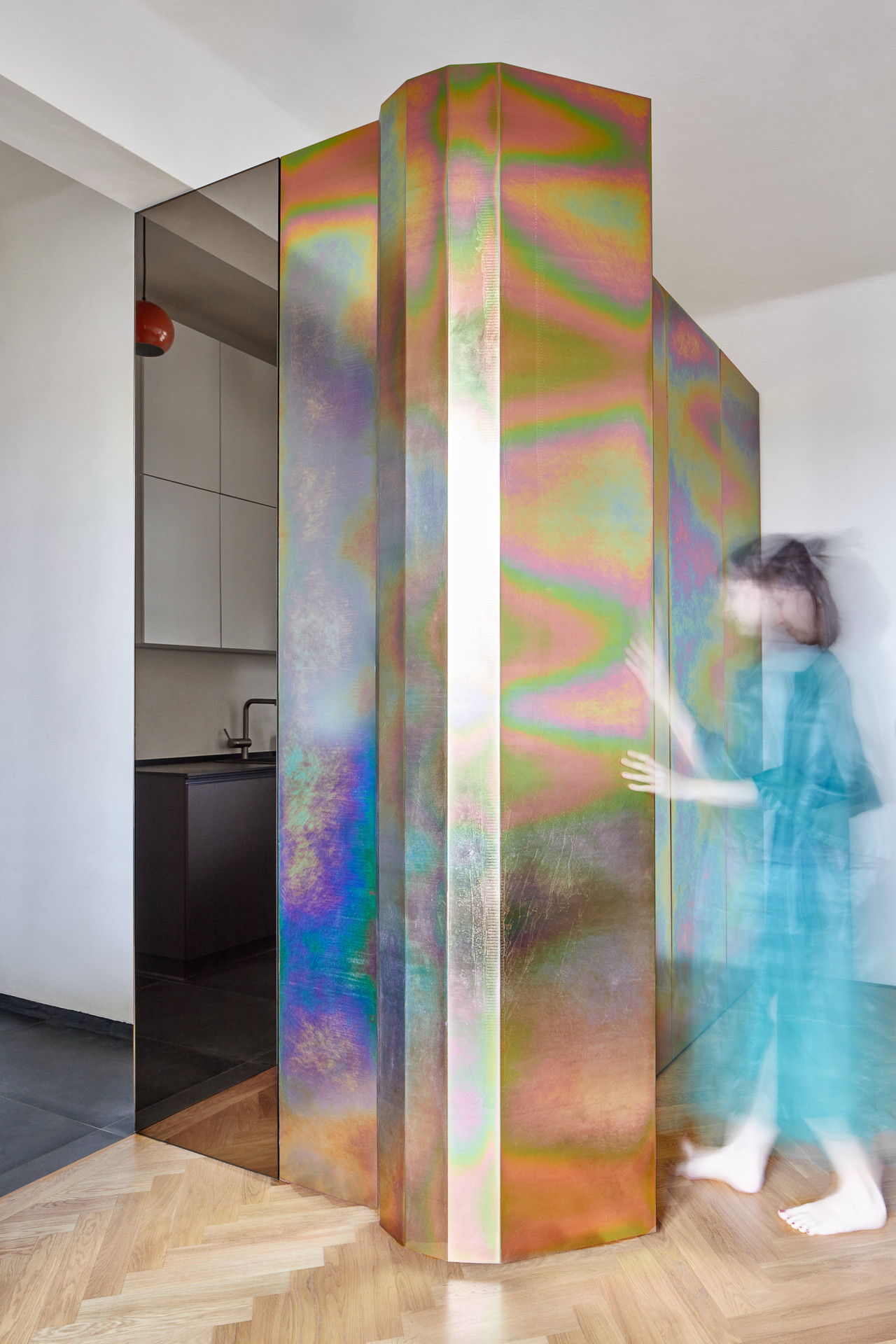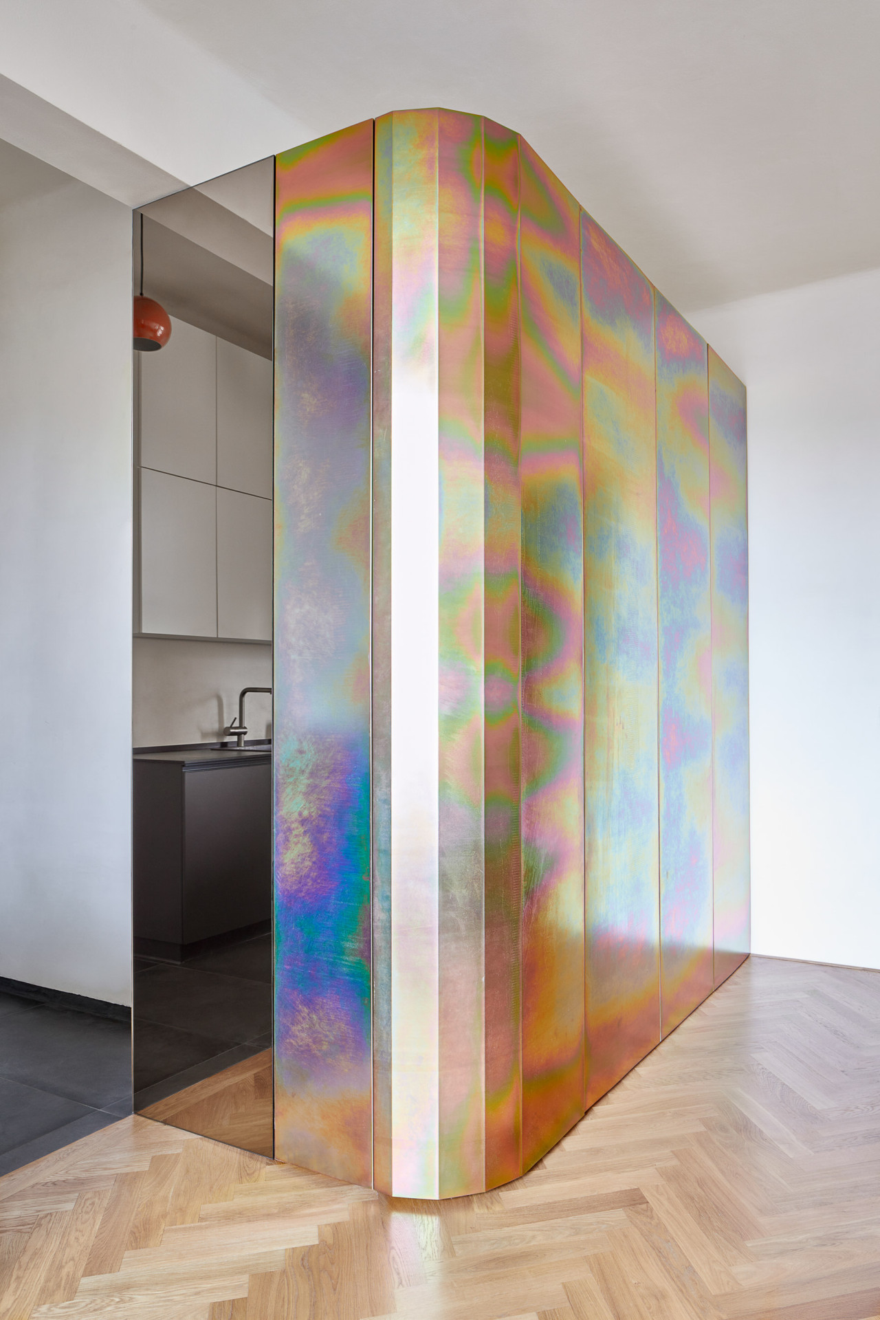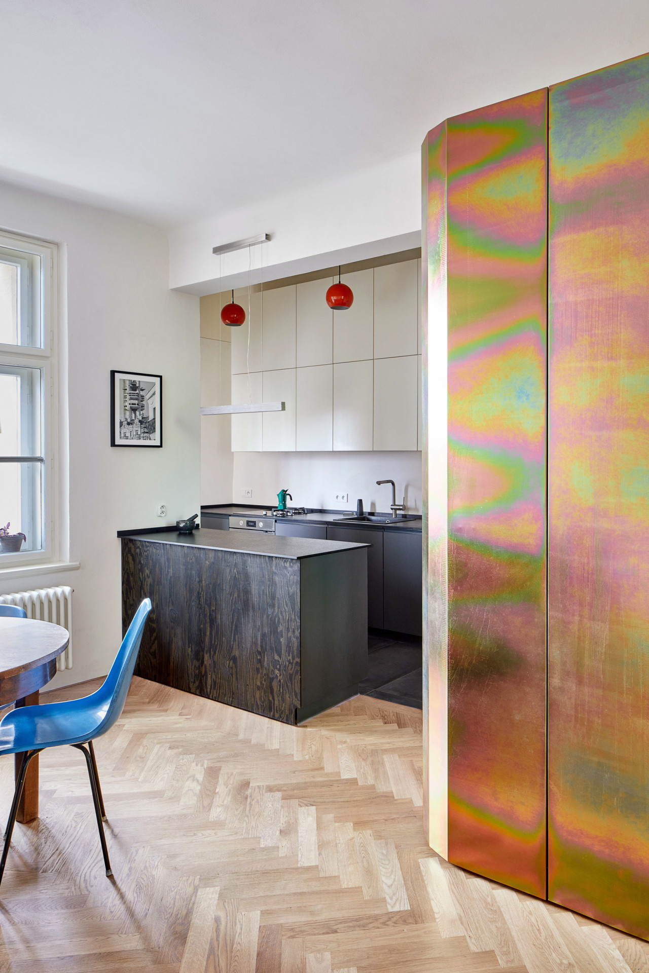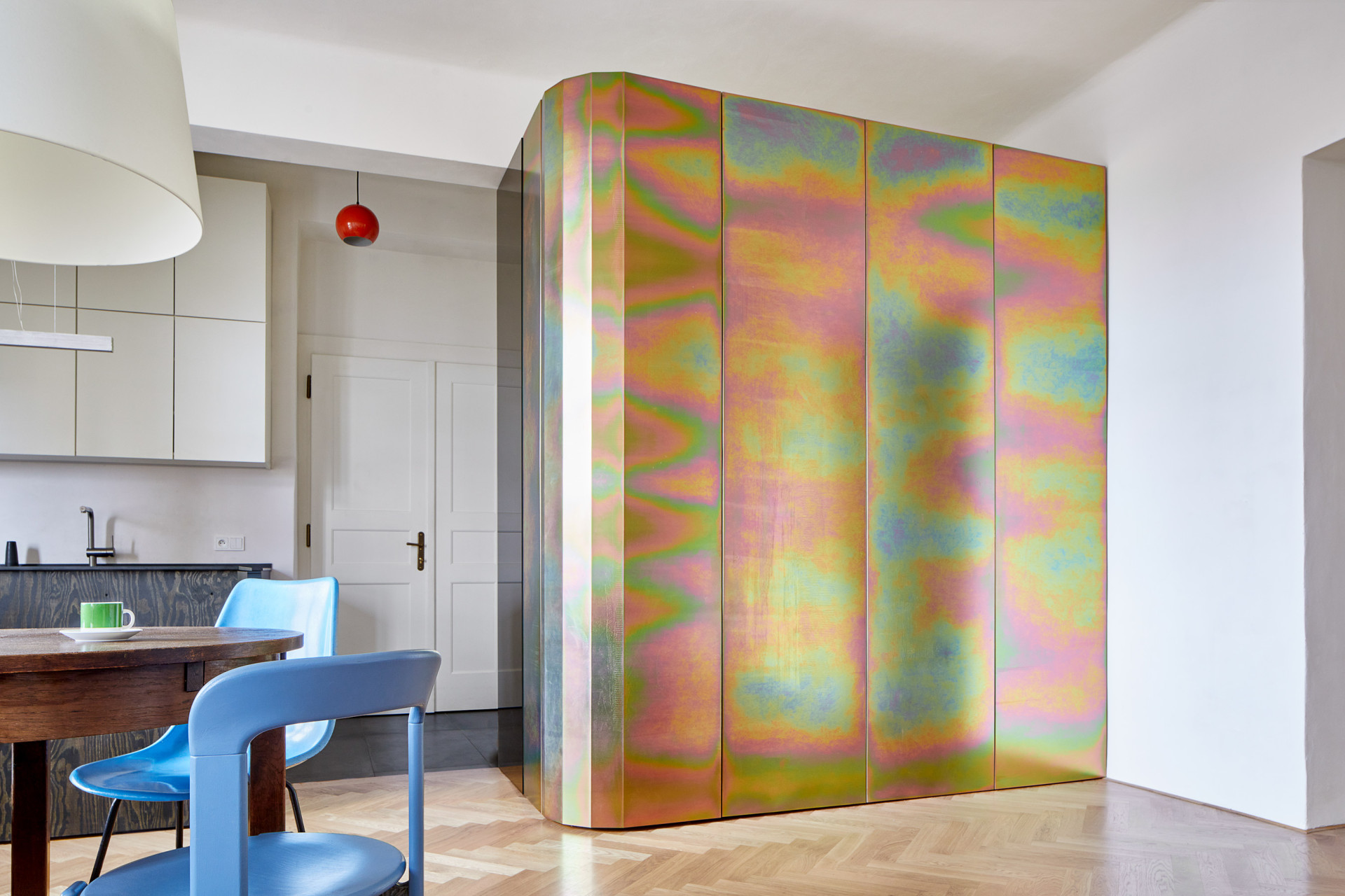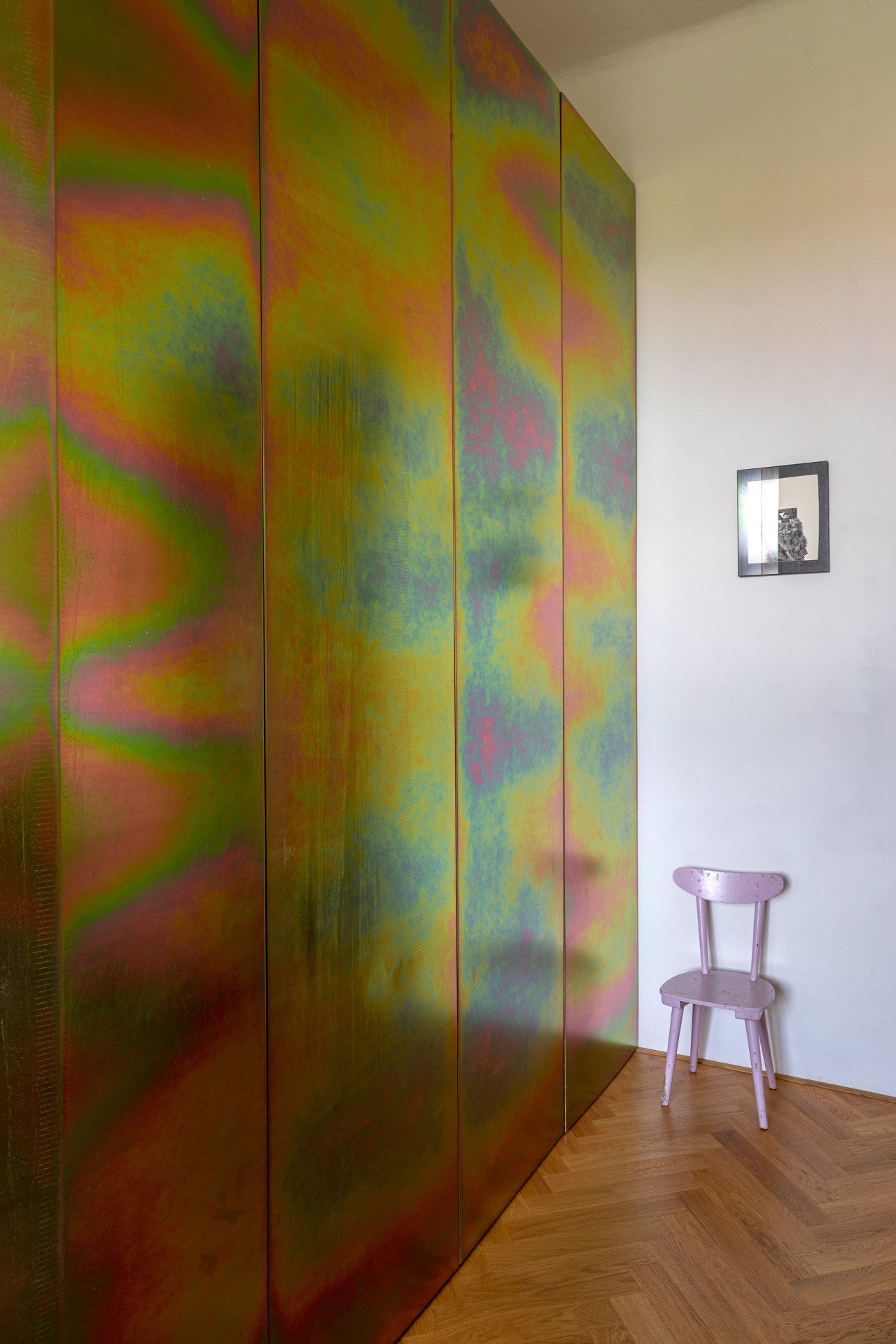 Výtvarným experimentem je řešení dvířek šatní skříně v obývacím pokoji, která jsou z galvanicky pozinkovaného plechu. „Zdálo by se, že po čase tato paráda omrzí a bude působit spíše rušivým dojmem. Opak je ale pravdou. Pohled na plechovou stěnu je velmi uklidňující. Barevně ladí s dřevěnou podlahou a odrazivost plechů prosvětluje jinak tmavý roh bytu,“ vysvětlují svou volbu autoři.