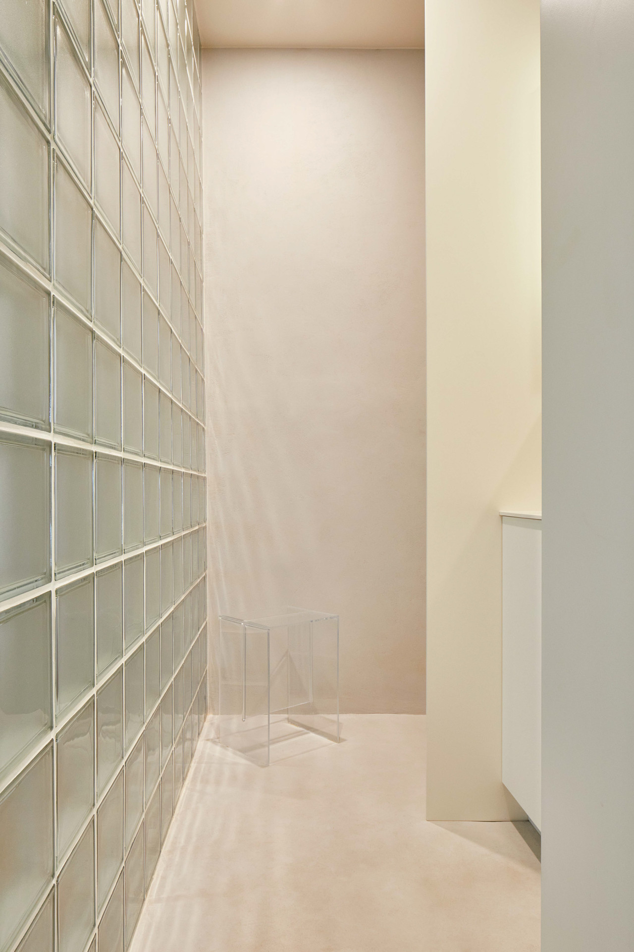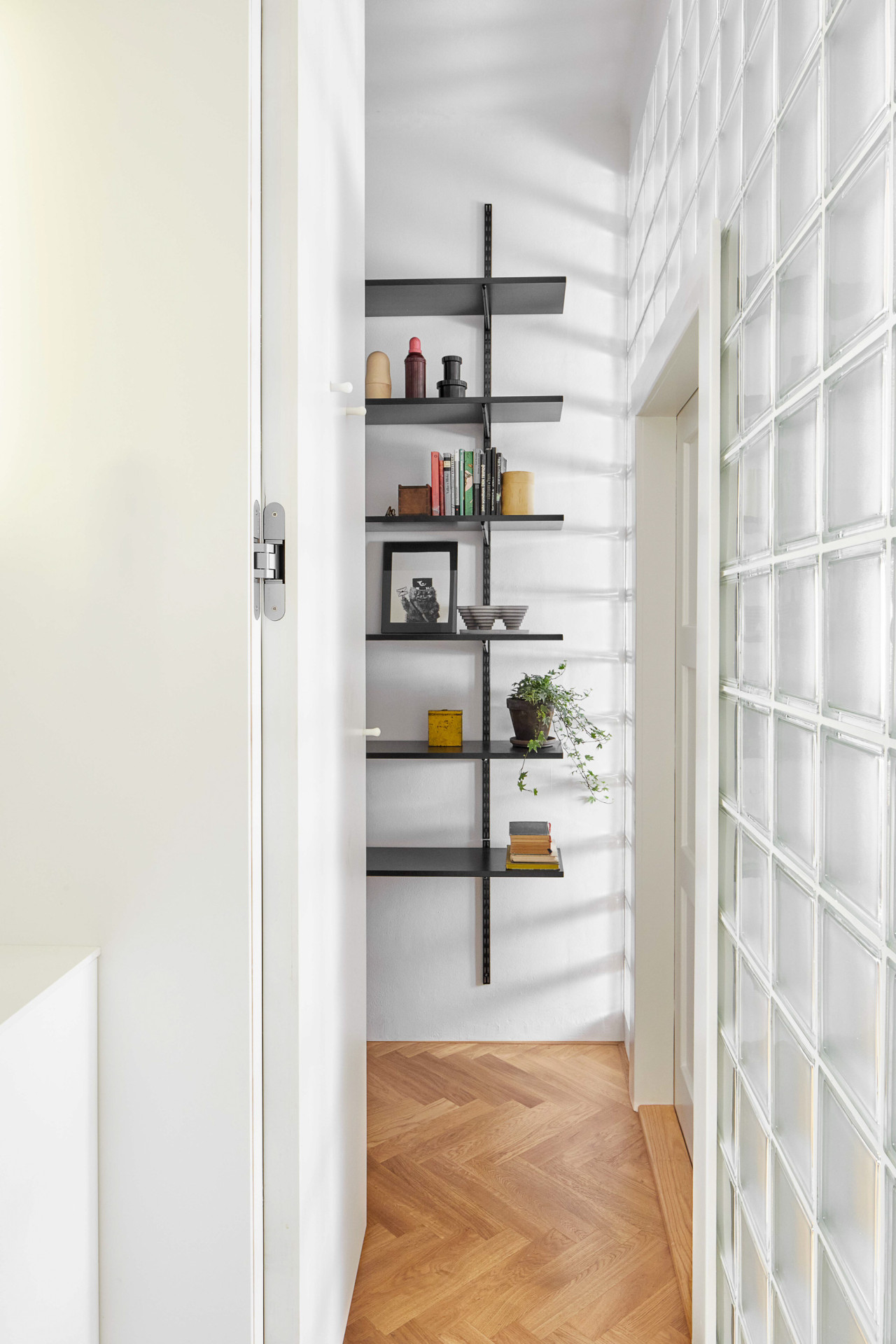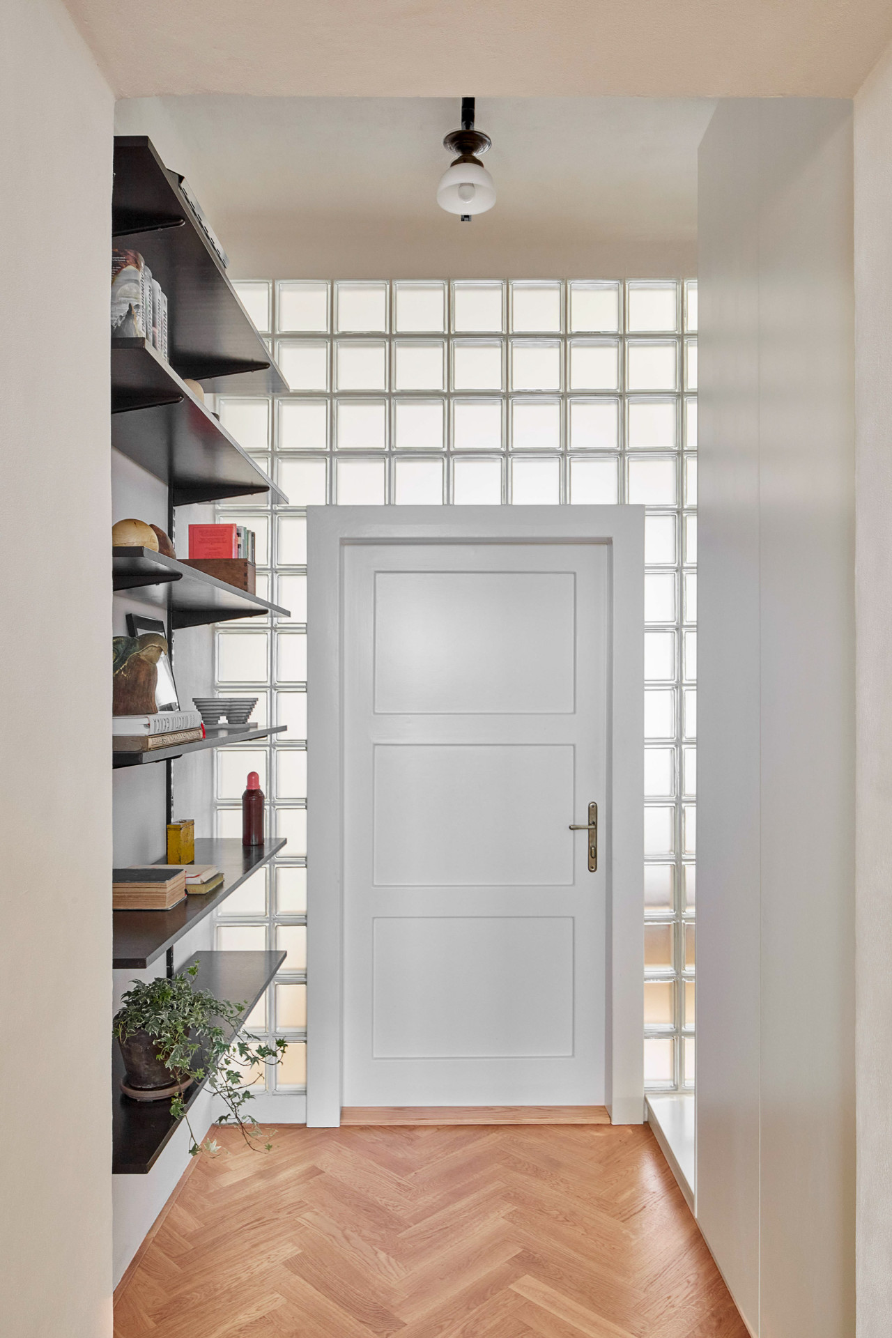 „V celku se tak byt jeví jako citlivá kombinace původního historického interiéru se současným a lehce experimentálním charakterem nově vložených prvků,“ pokračují architekti a architektky. Vedle klasických nových příček do bytu umístili jednu z luxfer, která odděluje ložnici od koupelny, do té se tak i přesto, že je ve středu dispozice, dostává denní světlo.