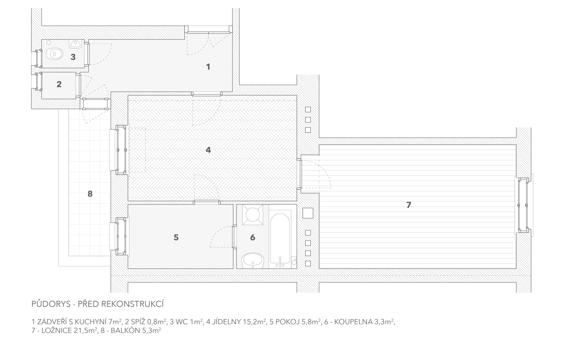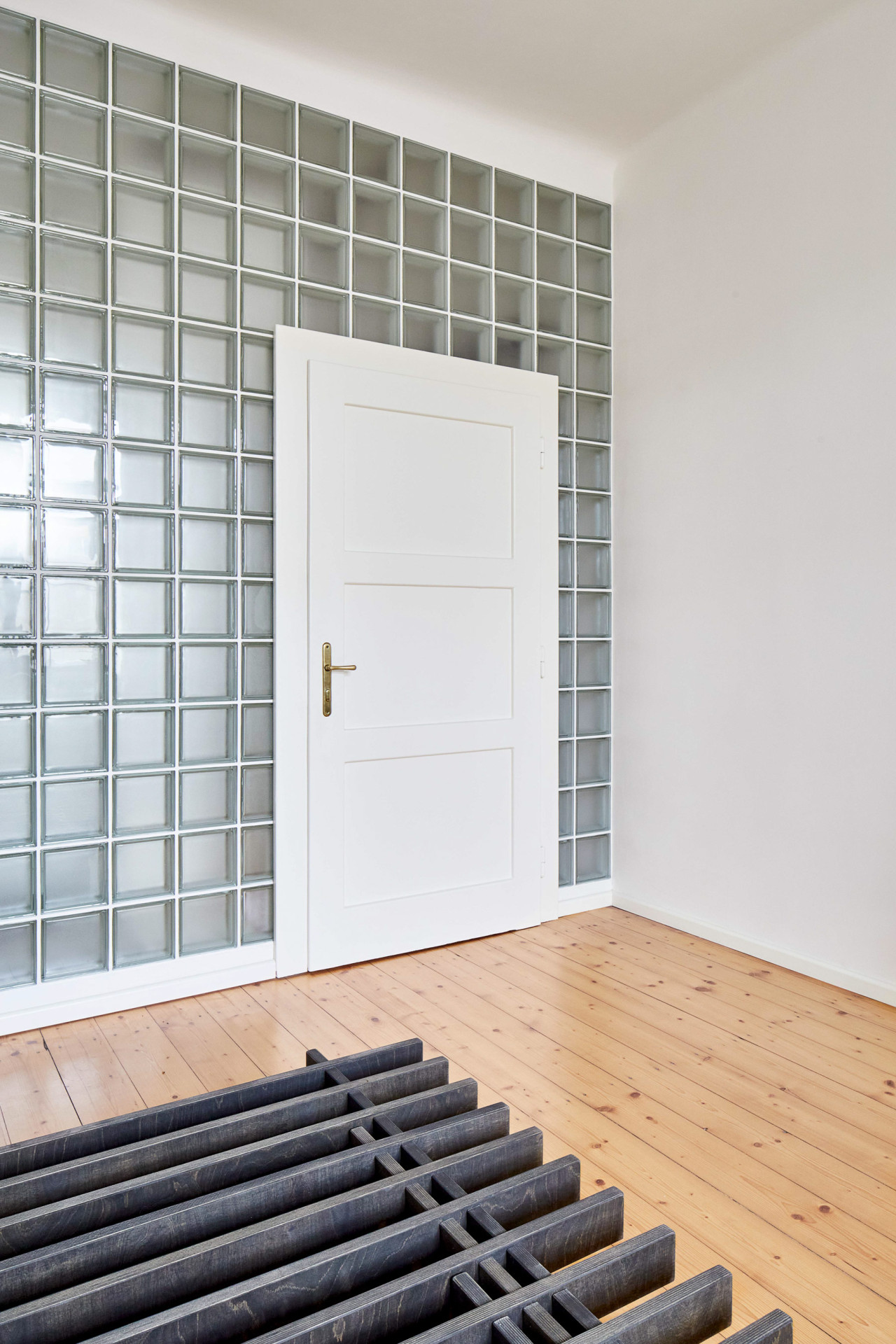 „Originální kazetové dřevěné dveře se v bytě bohužel nedochovaly. Získali jsme ale obdobné staré dveře i s obložkami z jedné demolice v Brně a osadili je přímo do skleněné příčky mezi knihovnou a ložnicí a dále i na WC,“ říkají autoři. Původní je pak třeba prkenná podlaha v ložnici nebo dlažba na WC, která je seskládaná z fragmentů dlaždic, která v bytě už také byly.