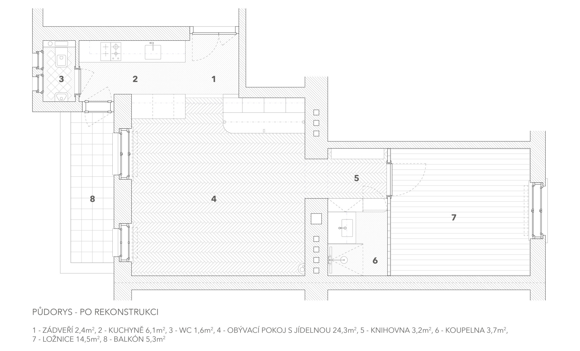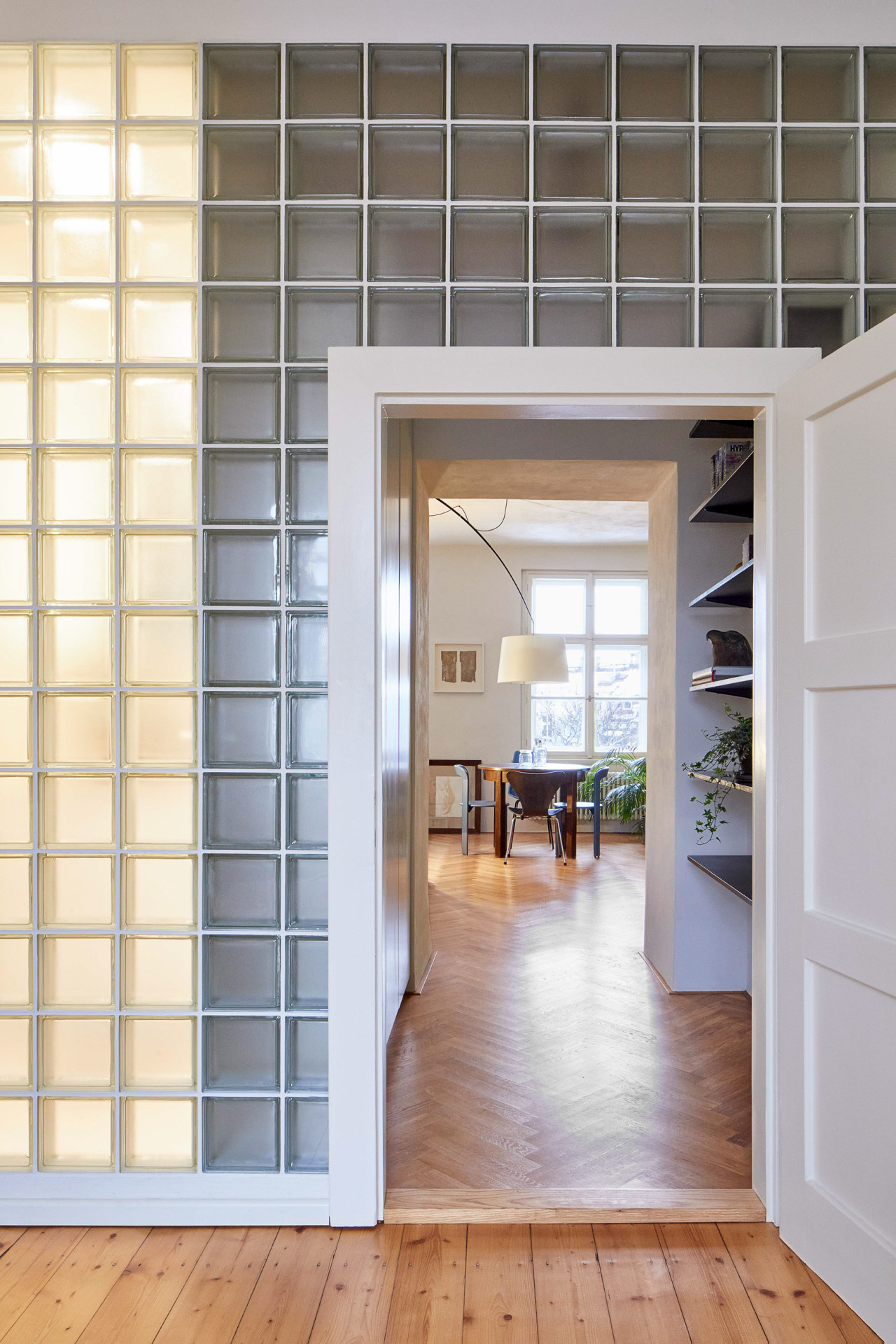 Ve zrekonstruovaném bytě v Nuslích se přirozené světlo dostane úplně všude. Dřívější dispoziční řešení, které to neumožňovalo, bylo zásadně změněno. Původně několik menších pokojů se proměnilo v jeden velký, který obsahuje obývací pokoj, kuchyň, jídelnu ale třeba i prostornou šatní skříň. Další místnosti jsou pak odděleny tak, aby do nich paprsky proniky třeba přes stěnu ze skleněných tvárnic.