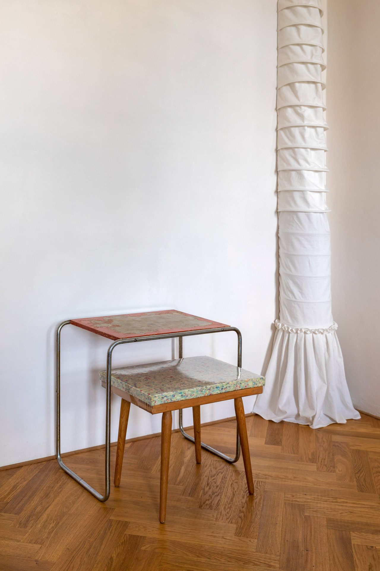 Plech šatní skříně na sobě nese viditelné nedokonalosti, práce s nimi se pro rekonstrukci stala také typickou. V rohu obývacího pokoje například zůstalo přiznané potrubí z koupelny. „Rozhodli jsme se jej nezazdít do šachty, ale zakrýt na míru ušitou a umělecky provedenou turnýrou. Nejen že zabírá méně místa v obýváku než klasicky vyzděná nebo sádrokartonová šachta, ale mění jinak rušivý prvek dispozice v originální umělecké dílo,“ dodávají autoři.