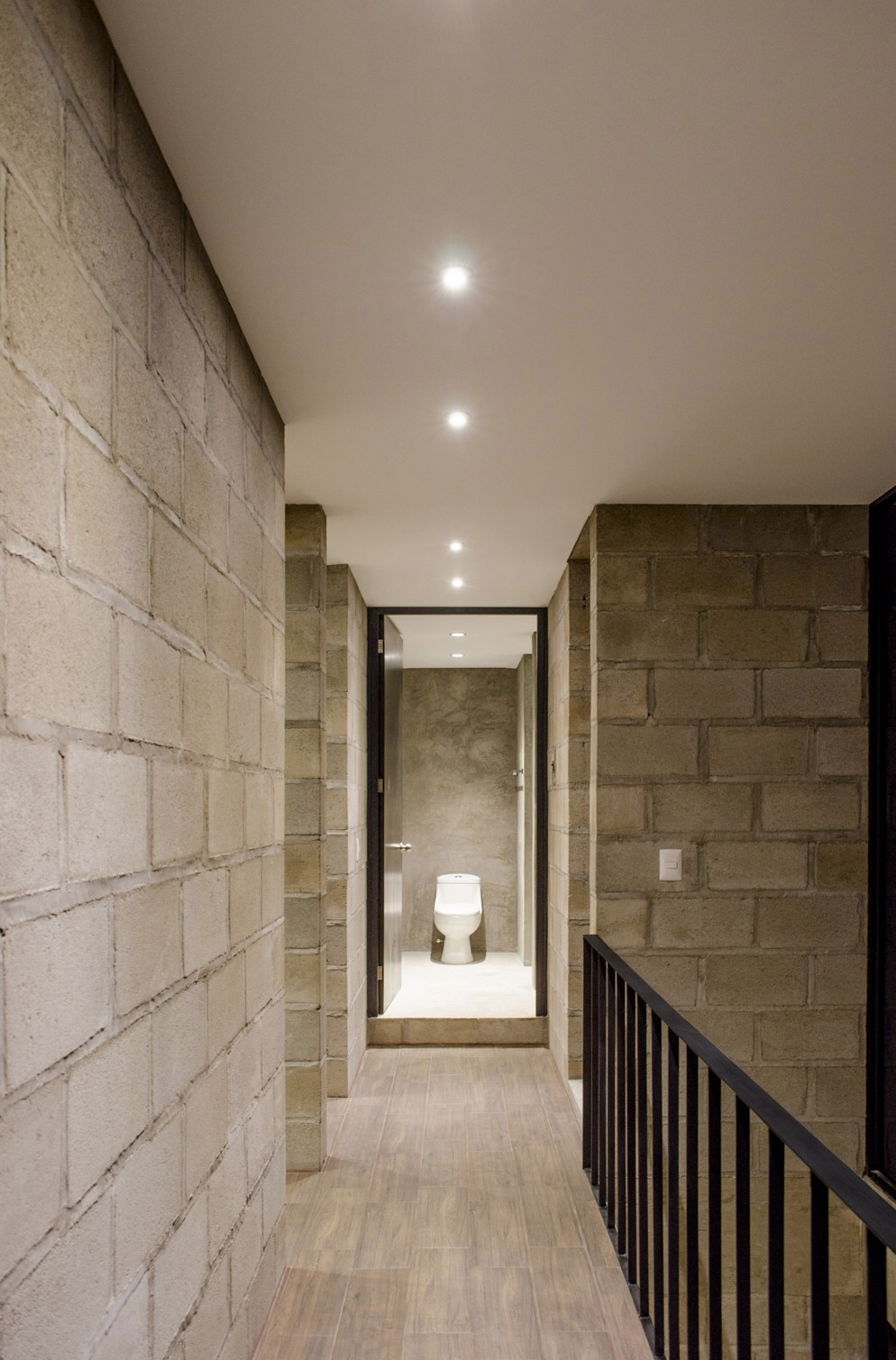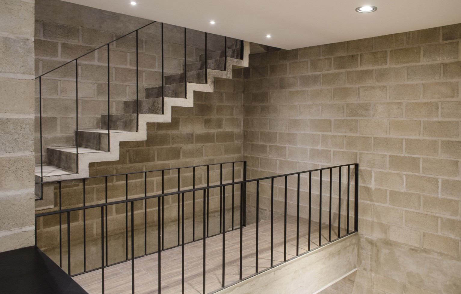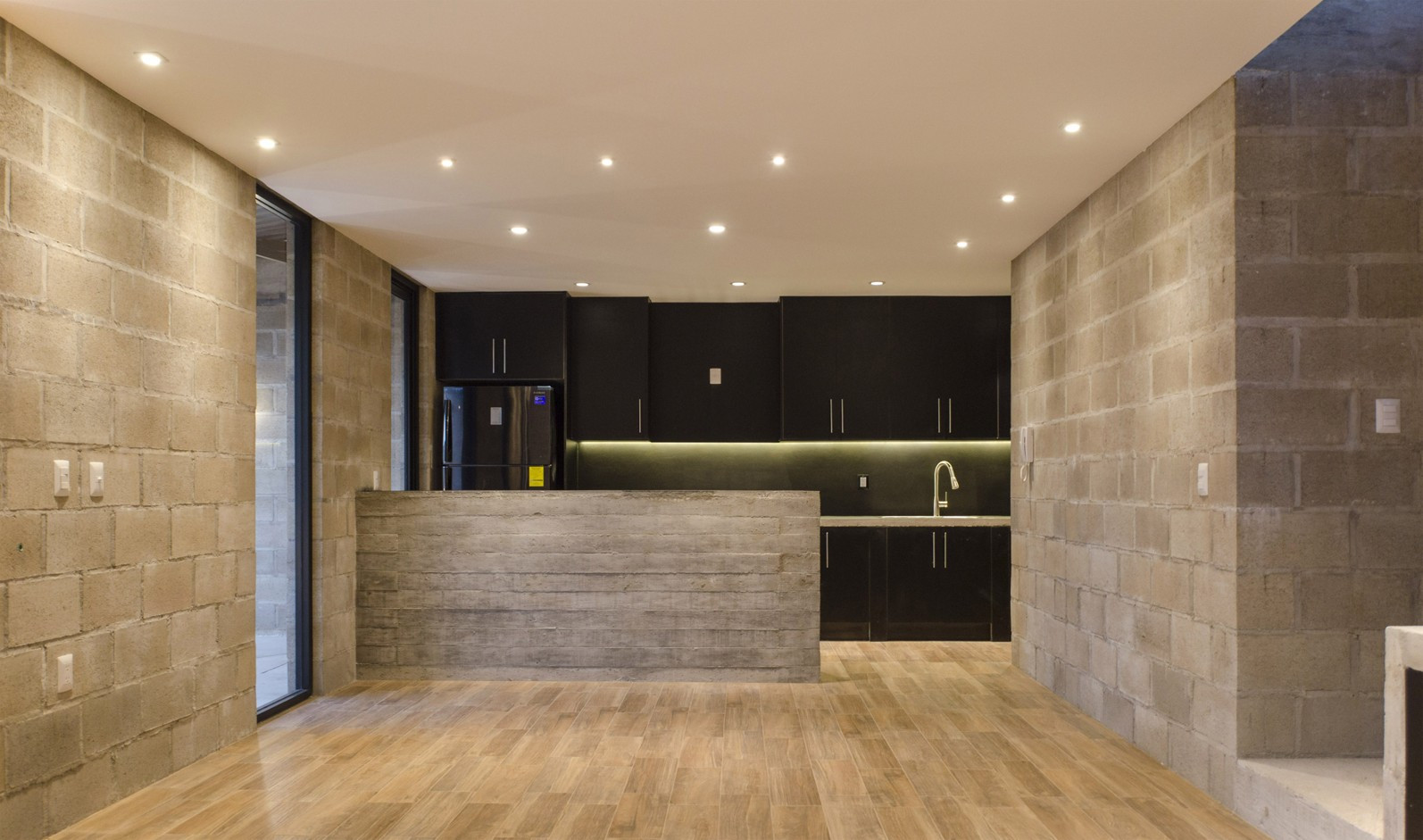 Stejně jako dominantní materiál vytváří charakter exteriéru, podepisuje se i do atmosféry interiéru, kde je navíc doplněn minimalistickými doplňky z černého kovu. Pravidelný rastr skladby betonového zdiva, střídání hrubých tvárnic s vrstvami malty působí industriálním a lehce nedokonalým dojmem. „Nedokončená“ betonová stavba láká k tomu, aby ji uživatel dotáhl do konce a vtiskl jí tak vlastní atmosféru podle vlastních preferencí.