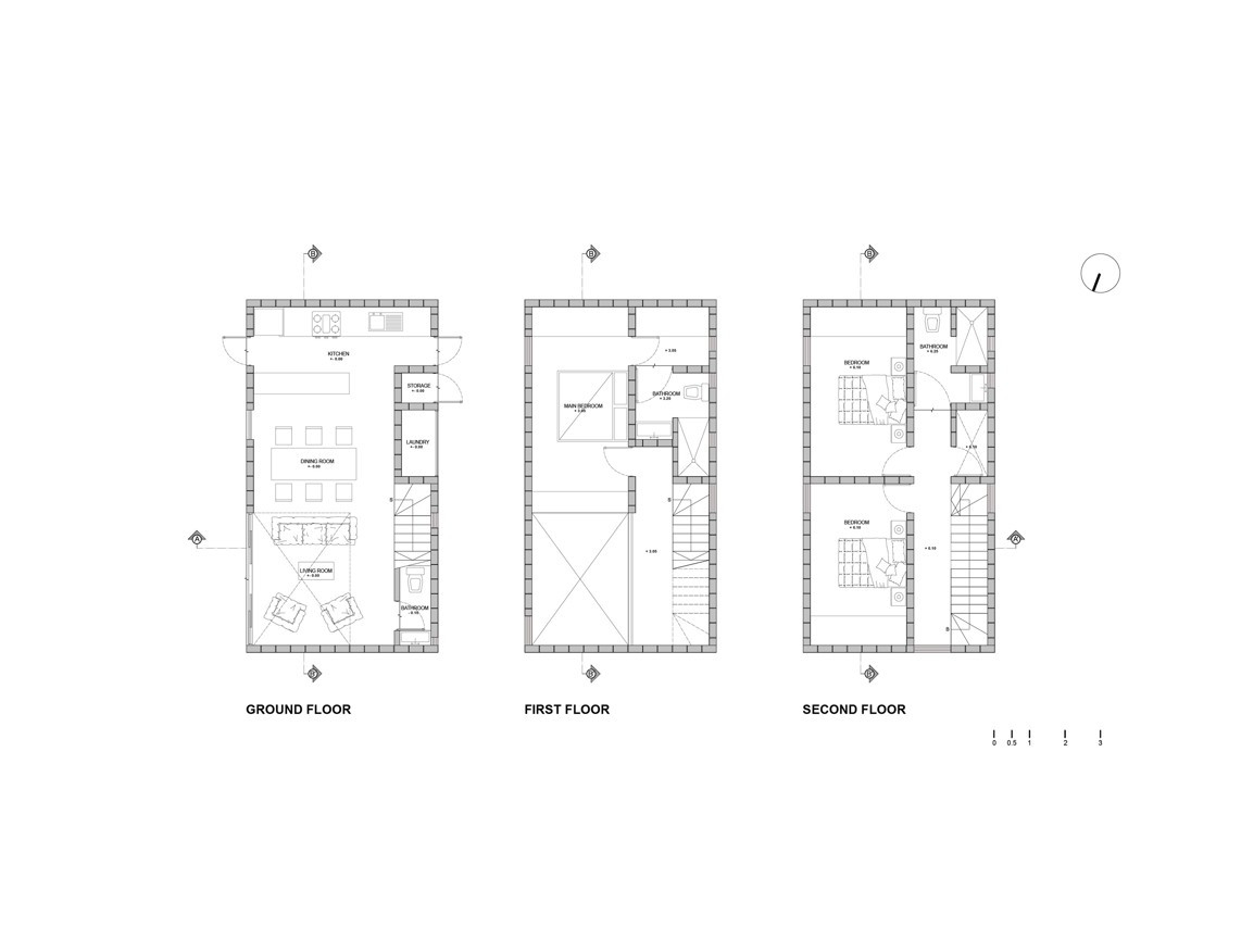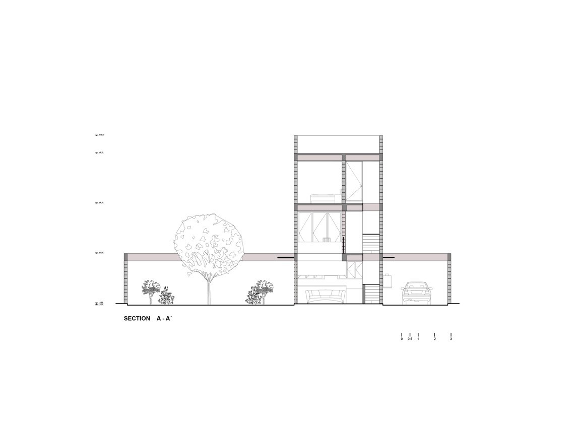 Na zahradu, kterou do ulice obehnává vysoká zeď rovněž z betonových tvárnic, navazuje hlavní obytný prostor v přízemí domu s kuchyní a jídelnou. Funkčně je dům rozdělen do dvou os – horizontální a vertikální – vycházejících ze společenských a soukromých potřeb majitelů. Právě horizontální osa, zaměřující se na naplnění společenských a rekreačních aktivit, představuje dispozici přízemí, kde jeden rekreační a společný prostor plynule navazuje na jiný. Zahrada přechází v obývací pokoj, ten se zase mění v jídelnu a kuchyň. Vertikální osa naproti tomu cílí na soukromí každého z uživatelů – dvě vyšší patra jsou jednoduše dělena na samostatné ložnice a koupelny.