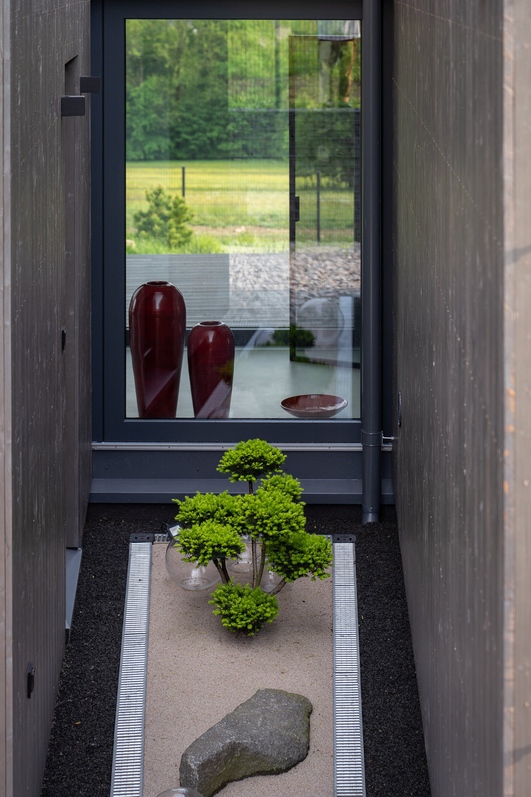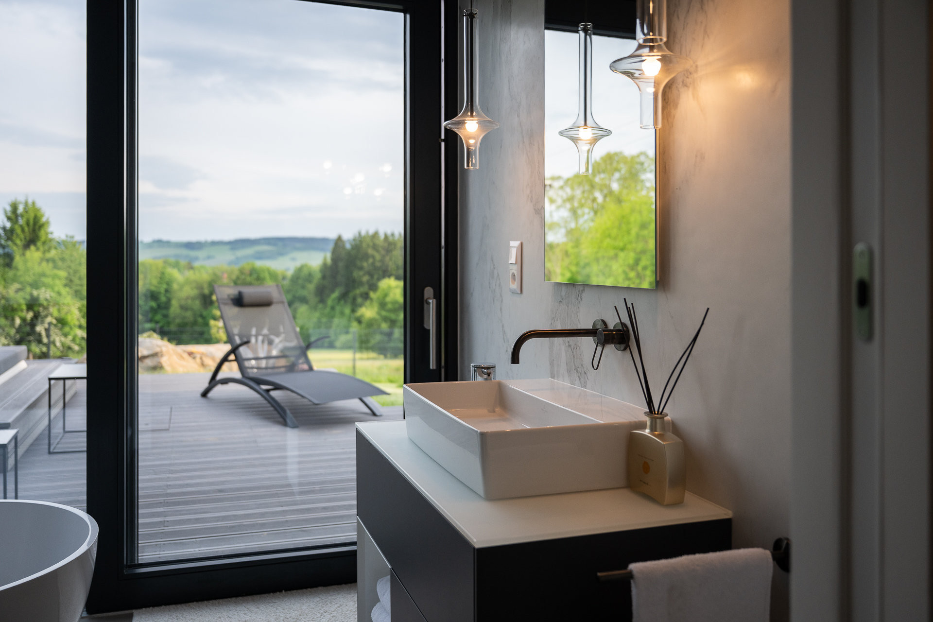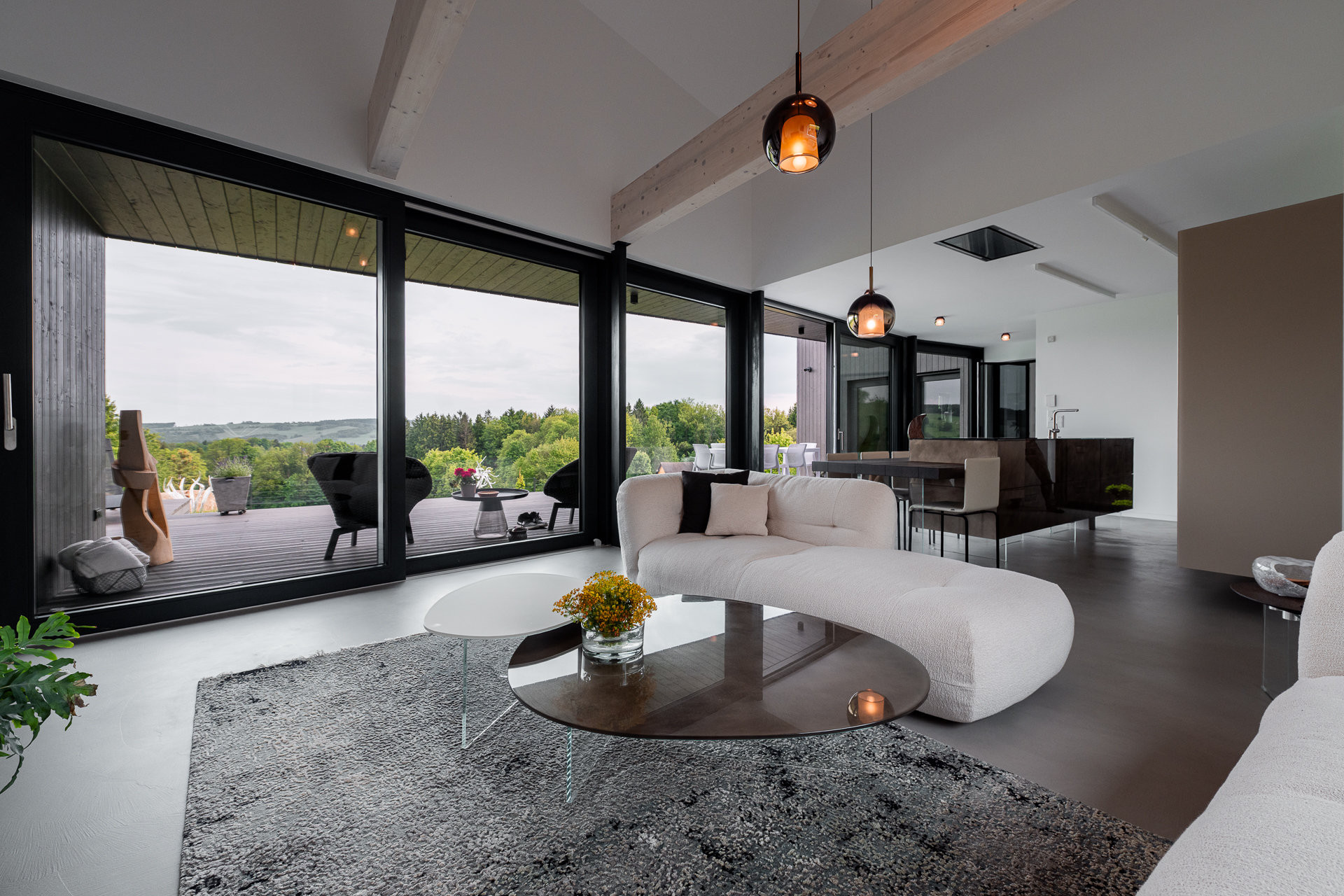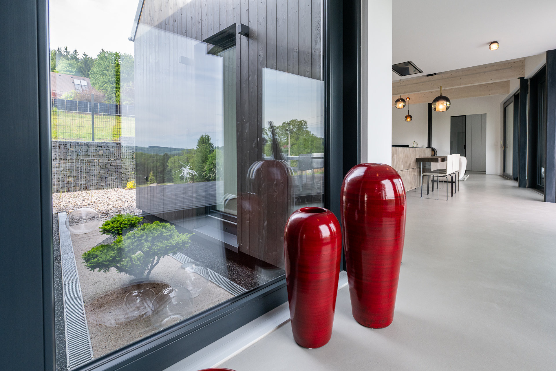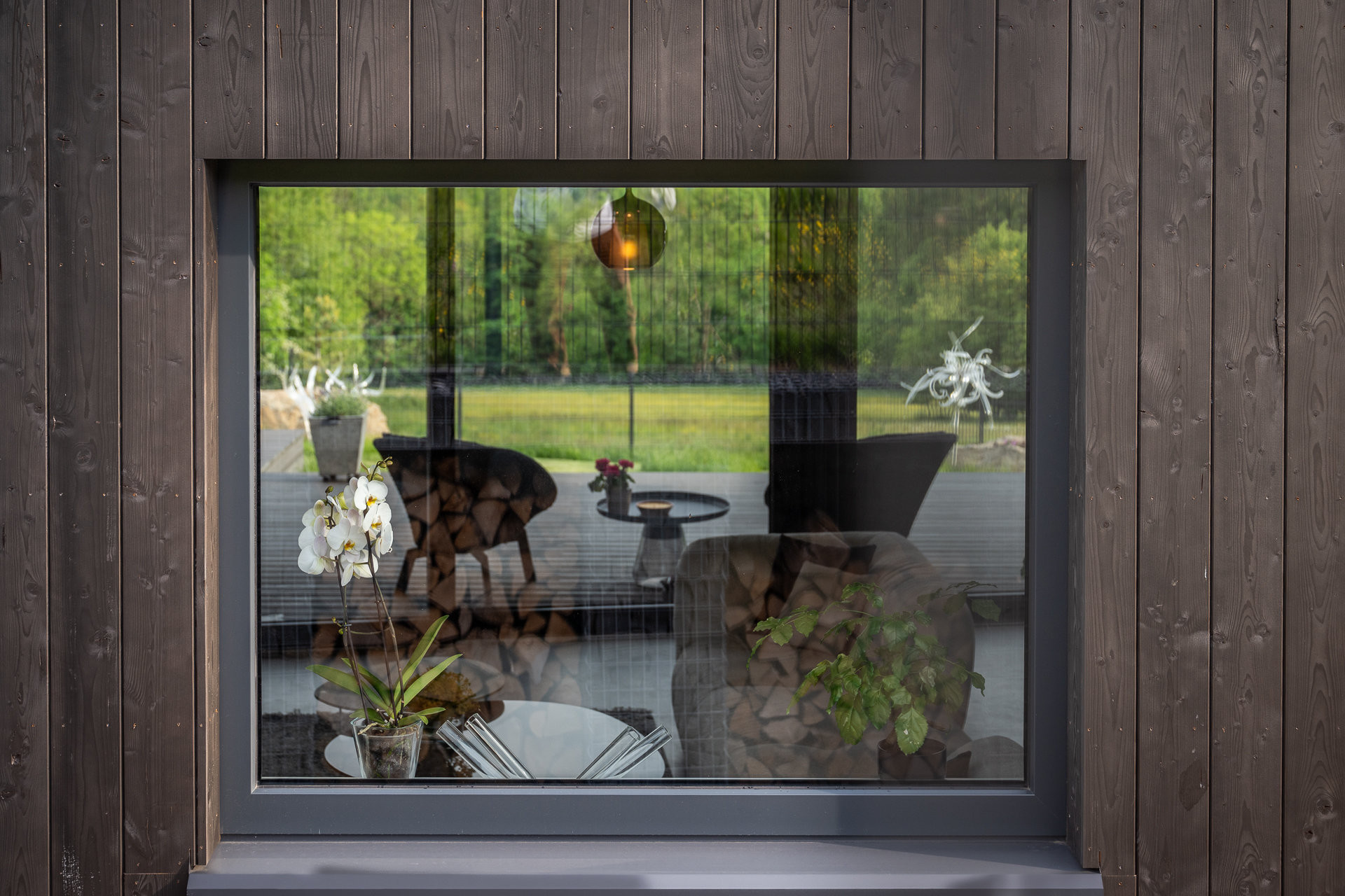 Studii domu navrhlo architektonické studio Labor 13, projekt dopracovali přímo ve VESPER HOMES. Na první pohled vás osloví elegantní modřínová fasáda v tmavém nátěru, která dokonale splývá s okolní přírodou a zároveň přináší nadčasovou krásu. Velkoformátové HS portály propojují interiér s exteriérem a umožňují každodenní kontakt s přírodou. Za nimi se nabízejí dechberoucí výhledy do údolí. Při ranní kávě i večerním posezení mohou majitelé pozorovat proměňující se přírodu.