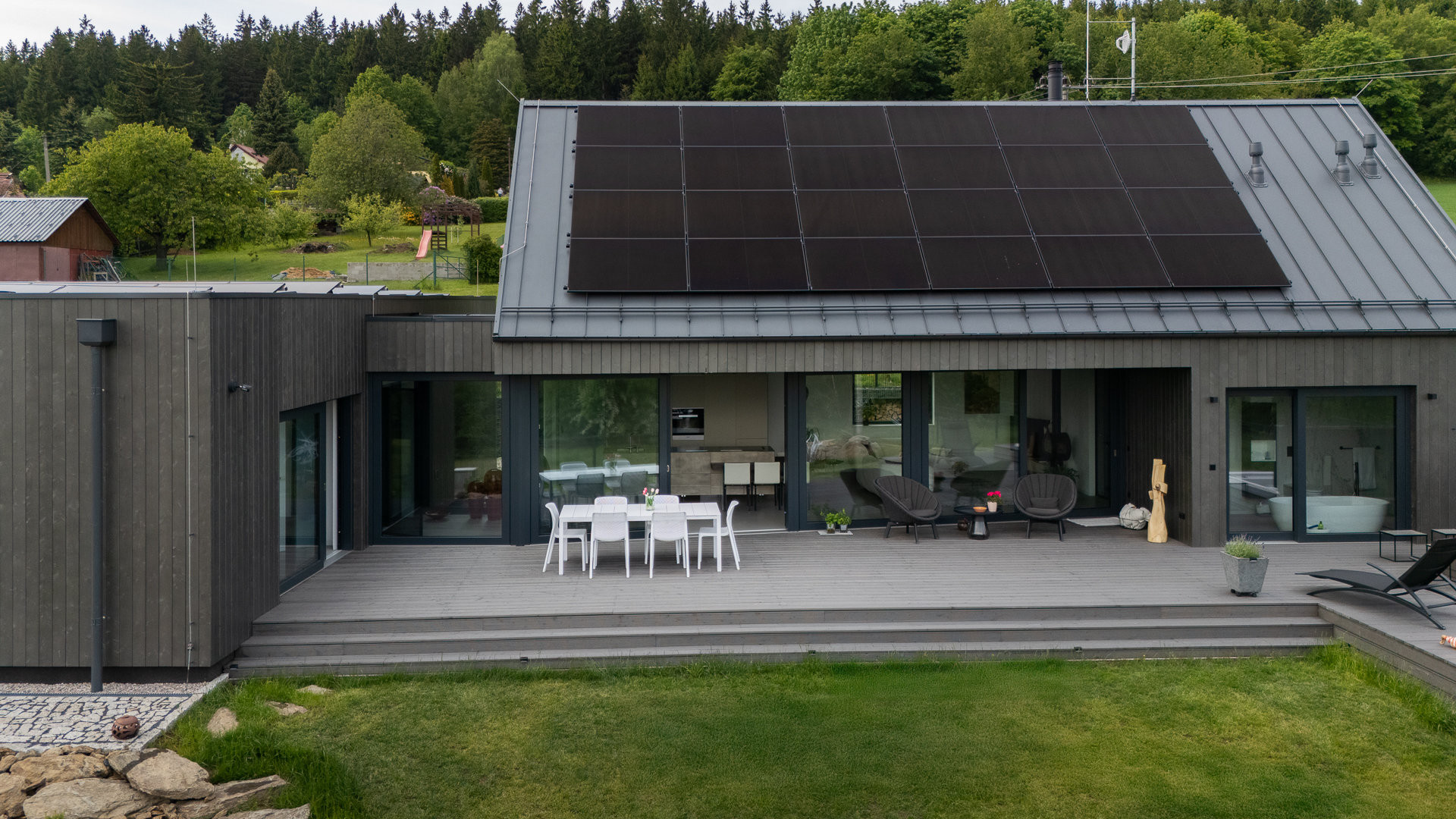 Srdcem domu je prostorný obytný prostor, který plynule přechází na velkorysou dřevěnou terasu, kde už čeká luxusní vířivka. Ať už si majitelé užívají odpočinek s rodinou, nebo pořádají večírek s přáteli pod hvězdami, tato terasa je nikdy neomrzí.