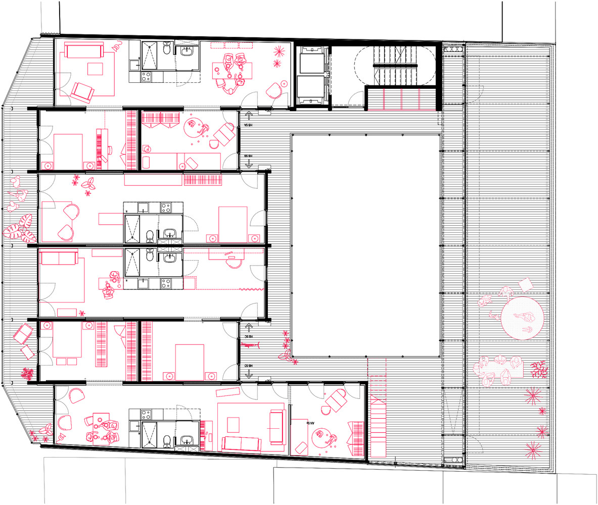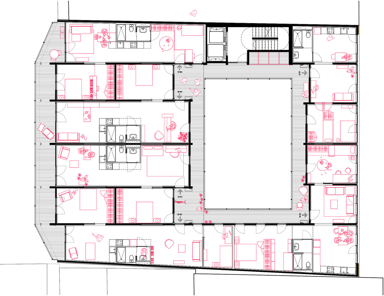 „Cílem projektu bylo nově definovat program kmunitního bydlení a zároveň vytvořit udržitelnou stavbu, do jejíhož centra by byla zahrnuta účast uživatelů,“ popisují hlavní myšlenku celé realizace architekti. „Projekt se nachází na veřejném pozemku určeném pro sociální bydlení s nájemní smlouvou na 75 let.“ Nynější obyvatelé tak v bytech mohou strávit celý život, navíc mají status družstevníků, takže se o budovu i sami starají.