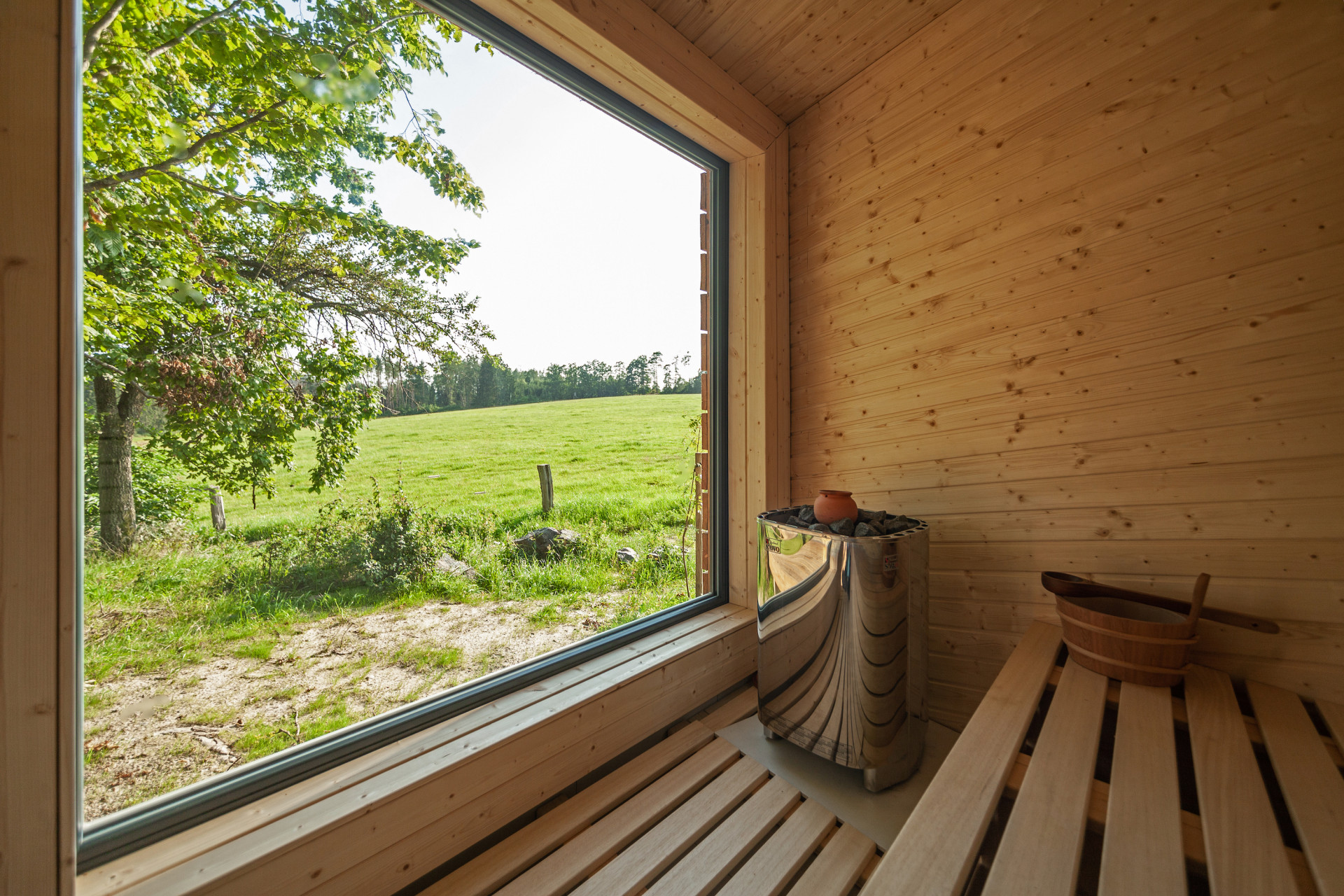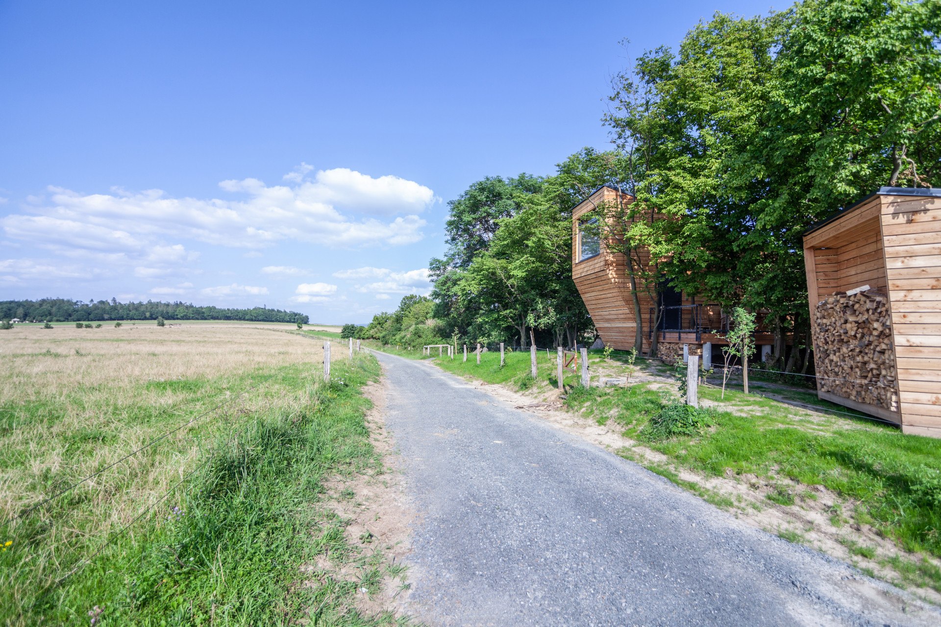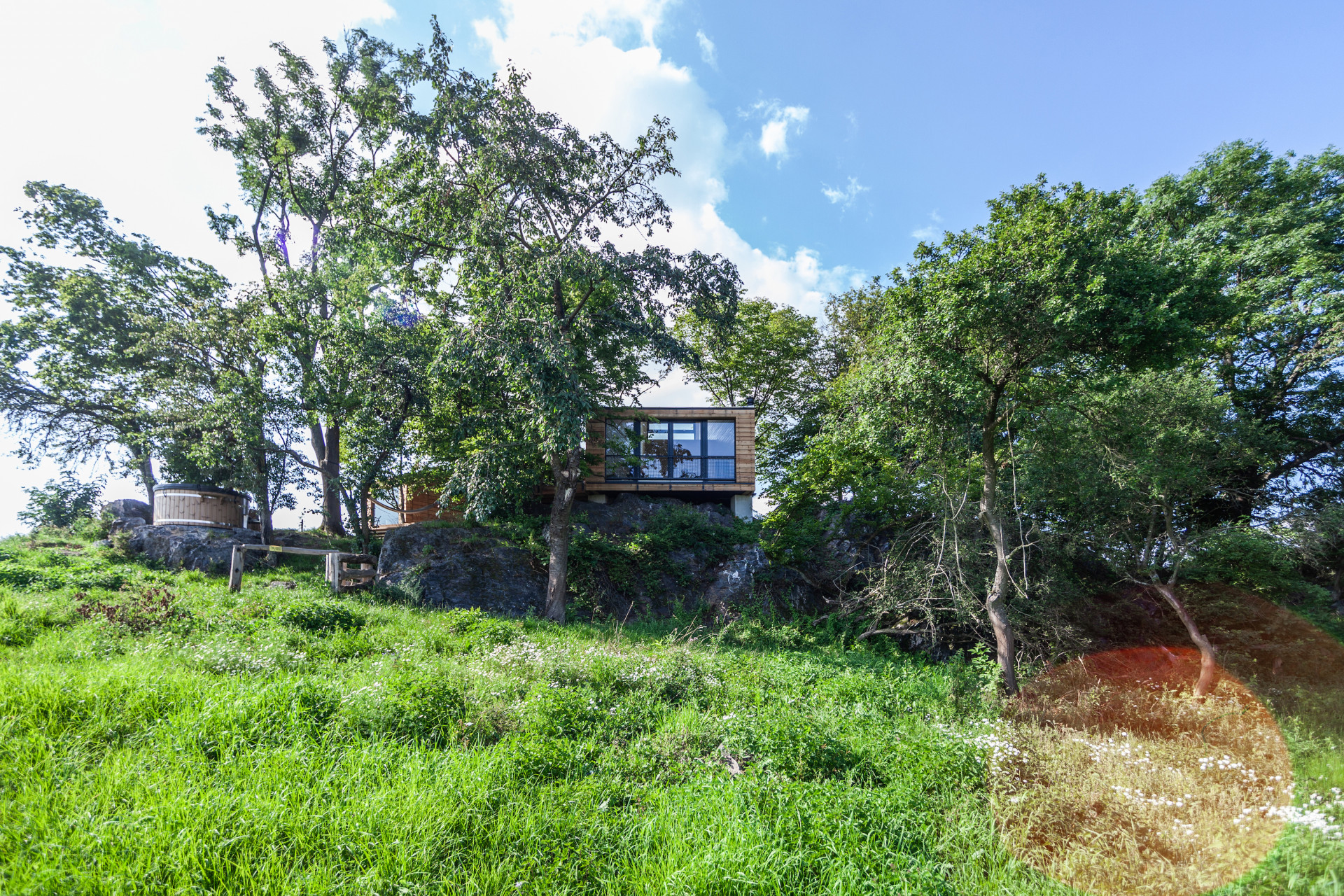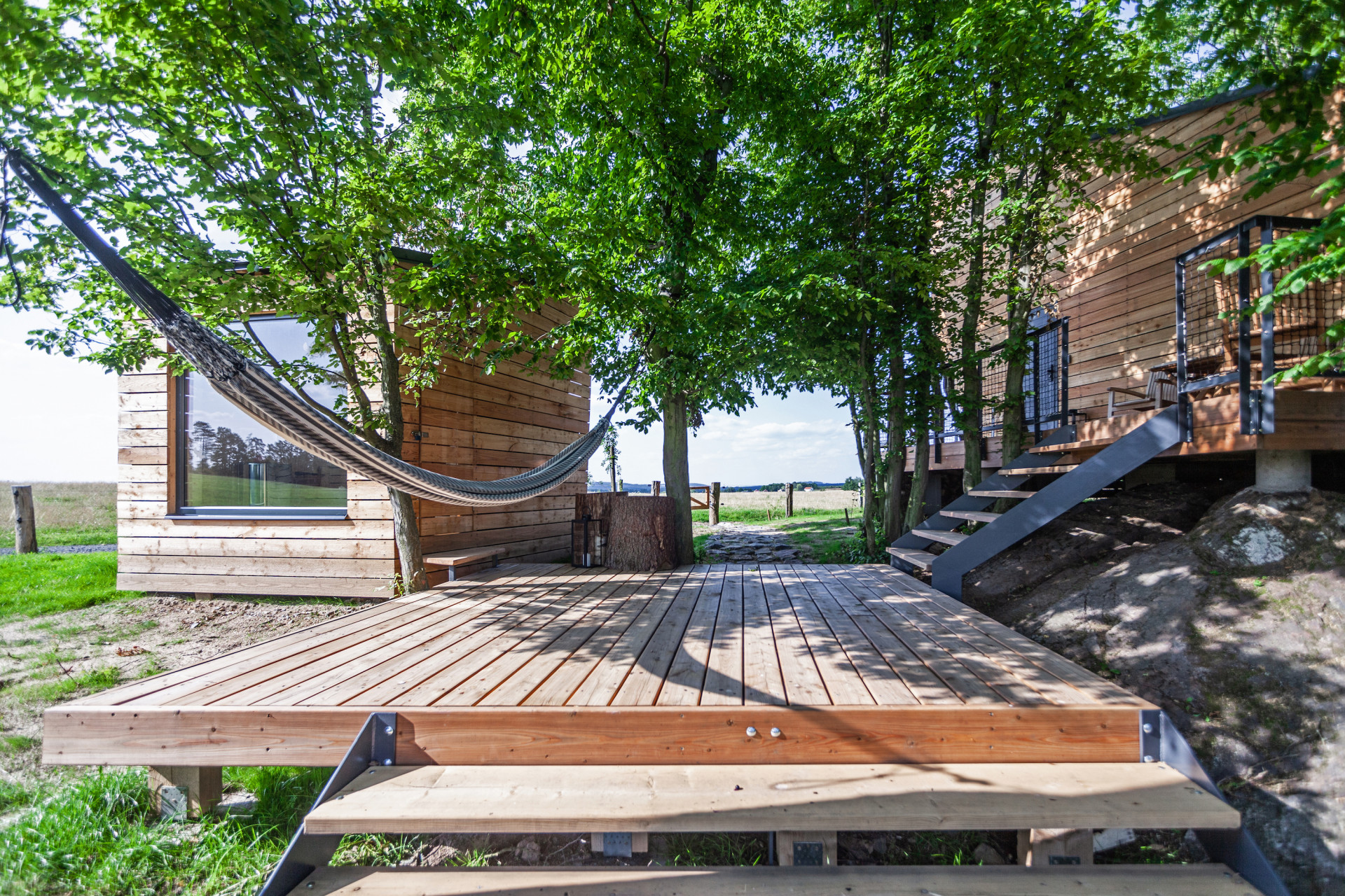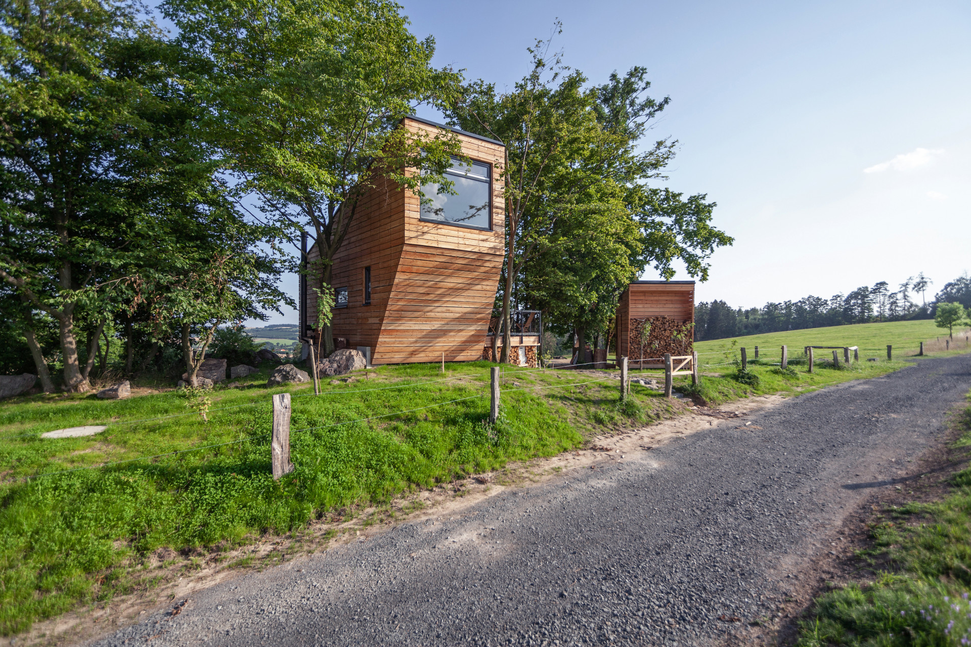 Z útulny je možné sestoupit na terasu a poté pokračovat do samostatně stojící sauny nebo pro dřevo do dřevníku. Stromy obklopující útulnu napomáhají nejen přirozenějšímu zasazení v krajině, ale také poskytují příjemný stín za horkých letních dnů.