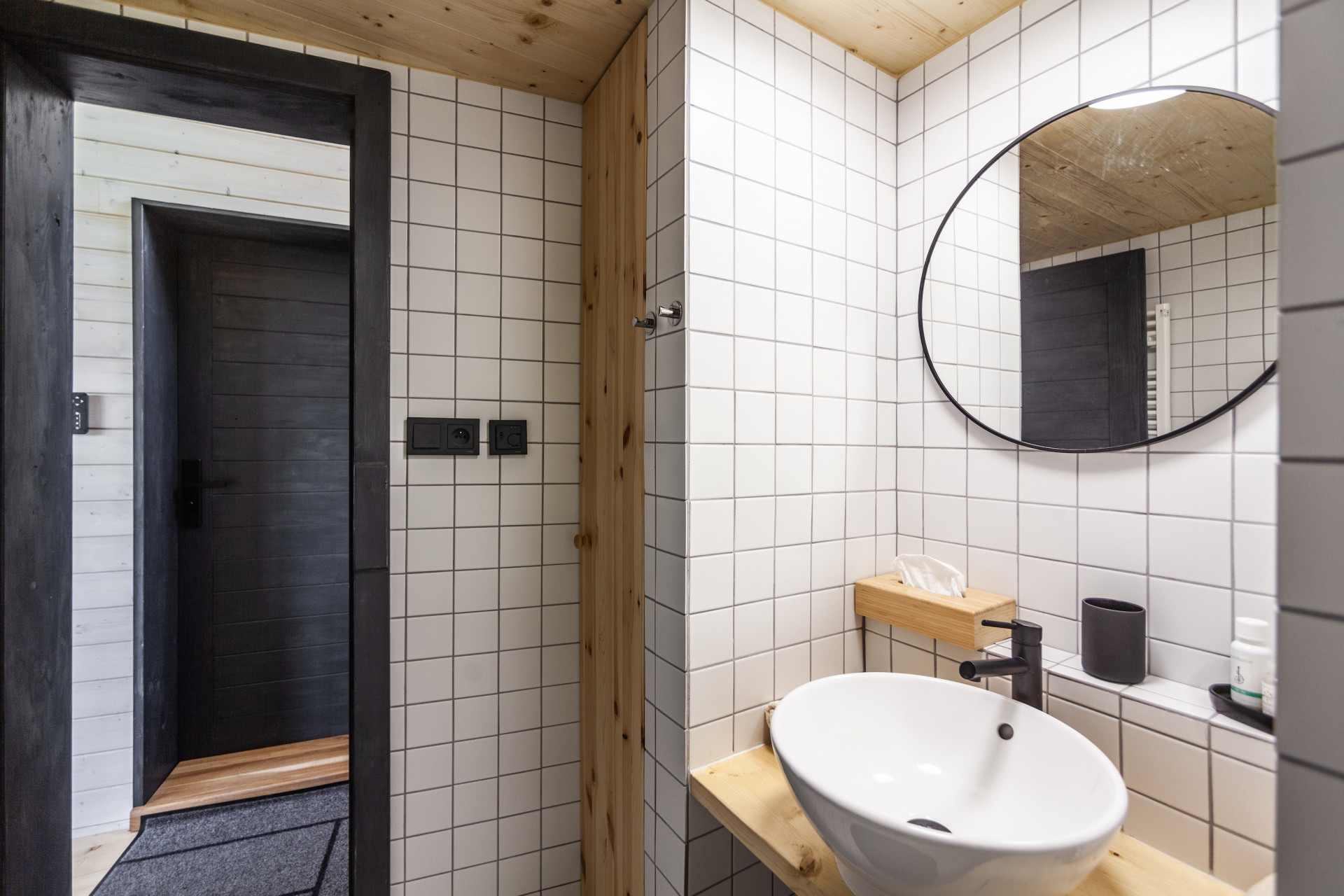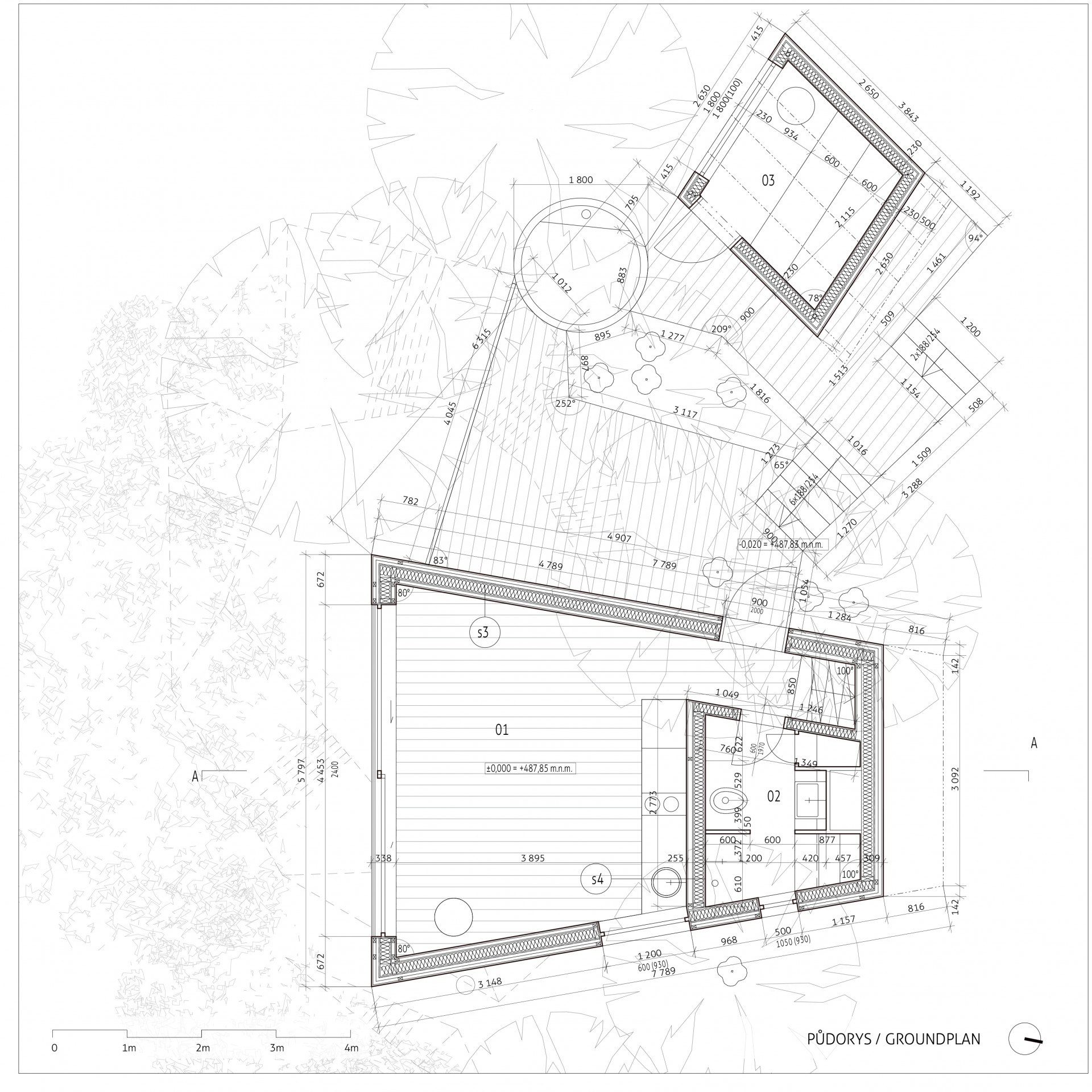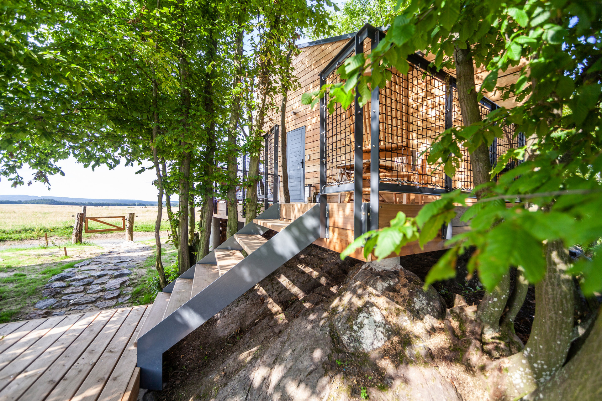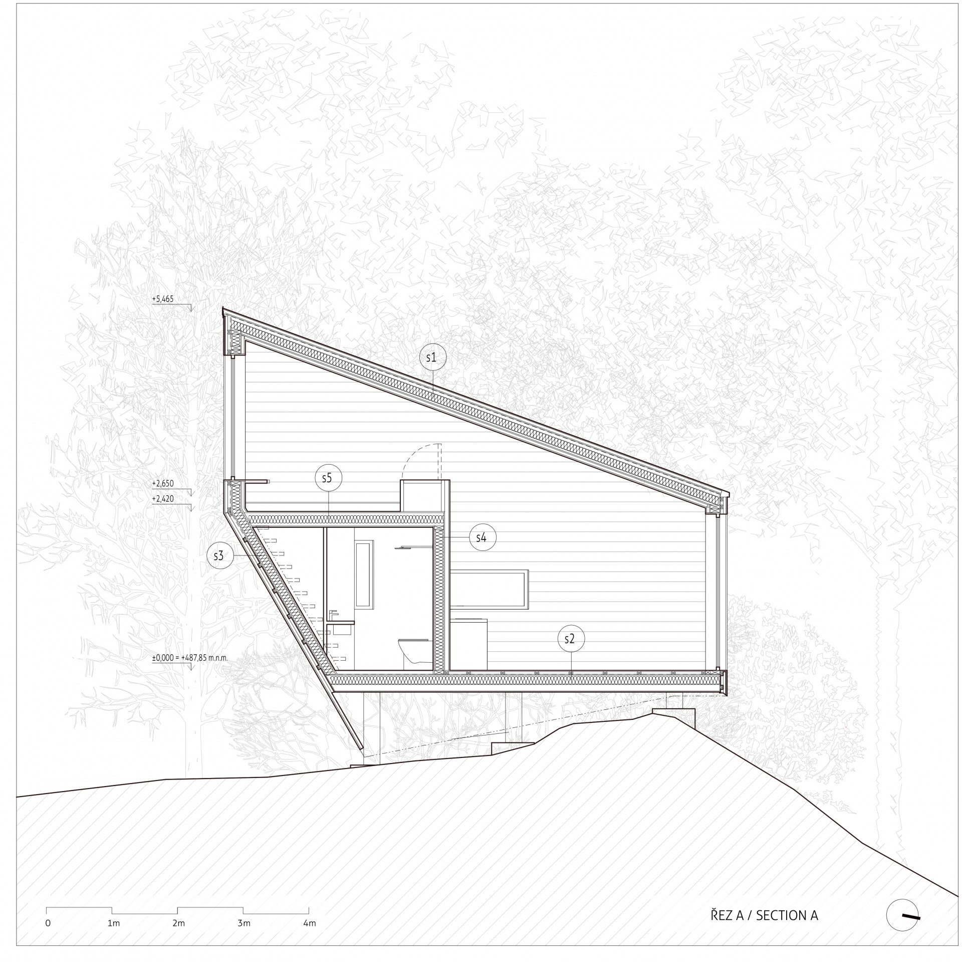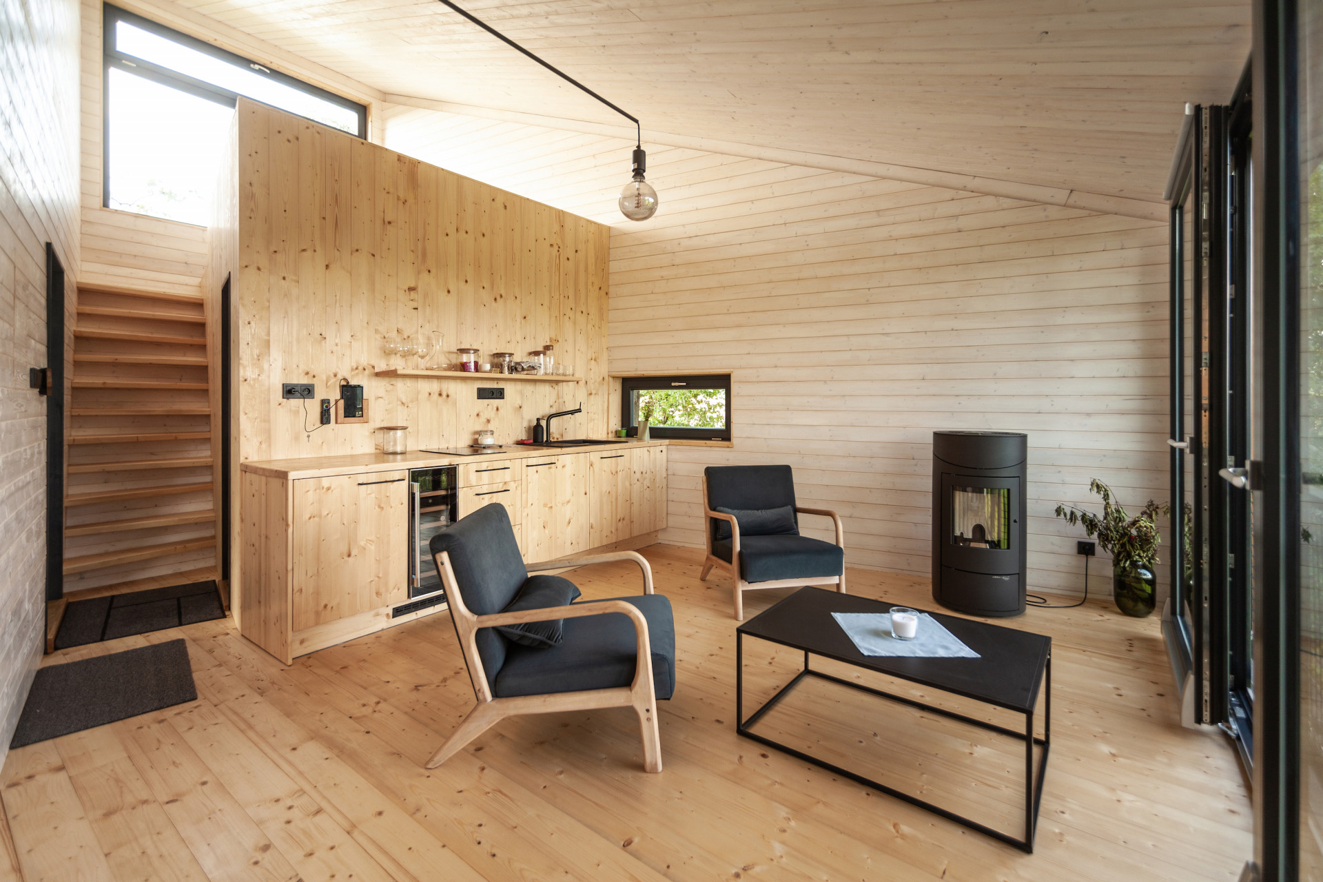 Z útulny je možné sestoupit na terasu a poté pokračovat do samostatně stojící sauny nebo pro dřevo do dřevníku. Stromy obklopující útulnu napomáhají nejen přirozenějšímu zasazení v krajině, ale také poskytují příjemný stín za horkých letních dnů.