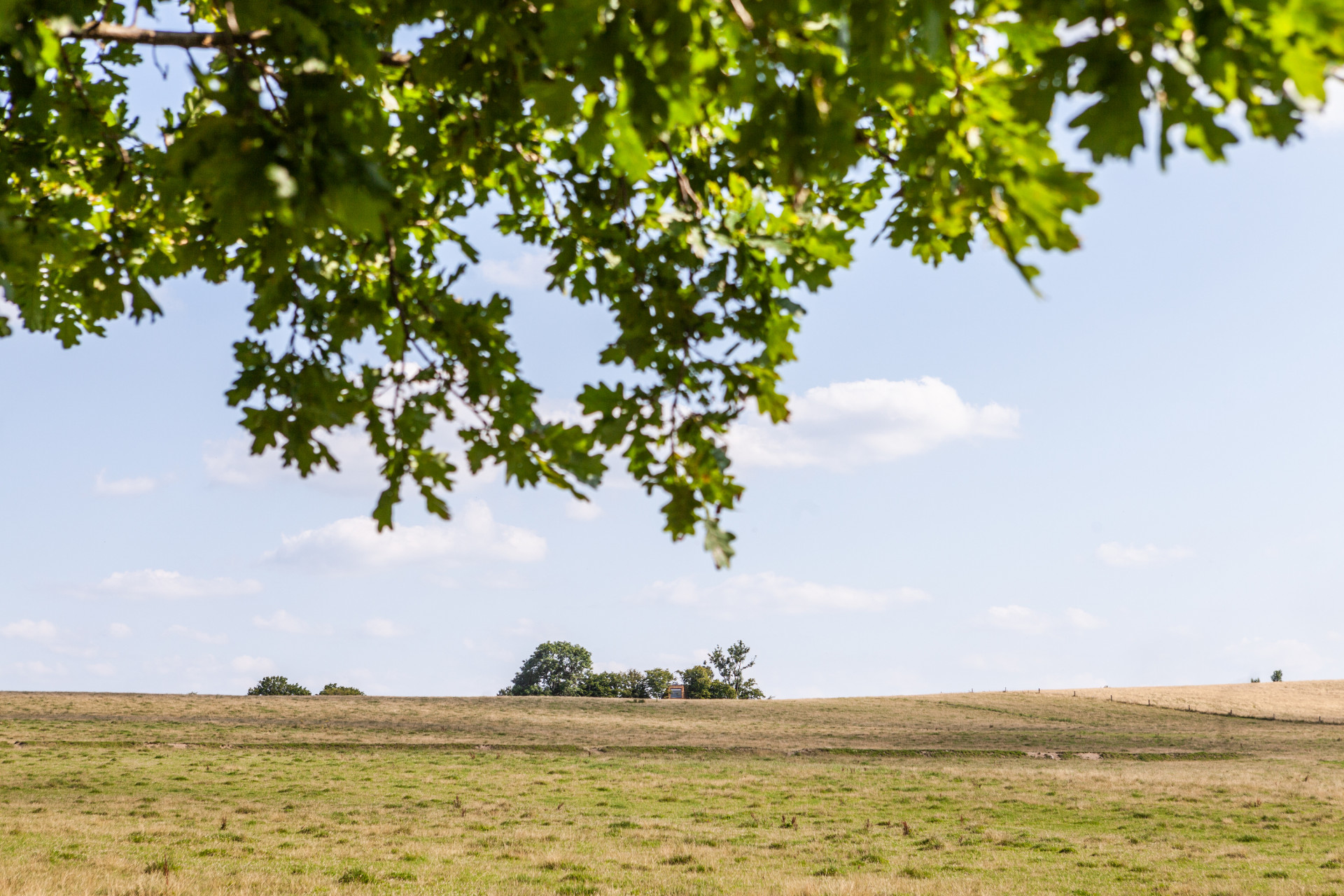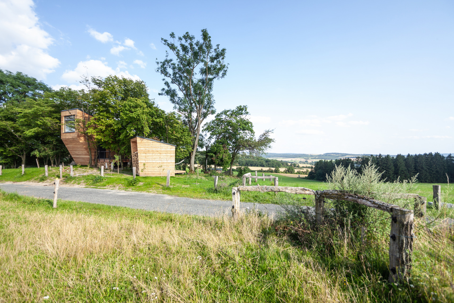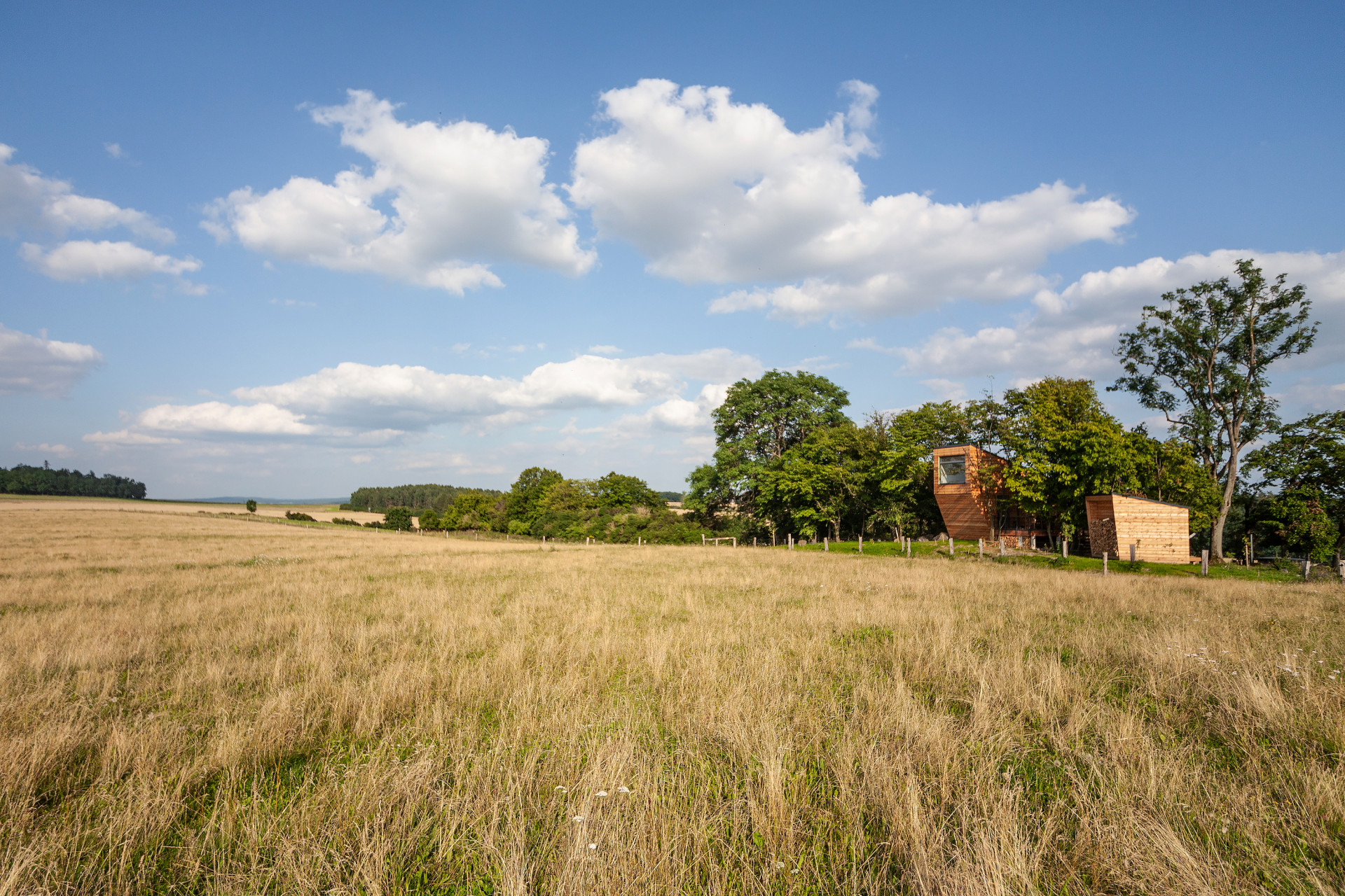 Dřevěná útulna usazená mezi pastvinami zastíněna stromy