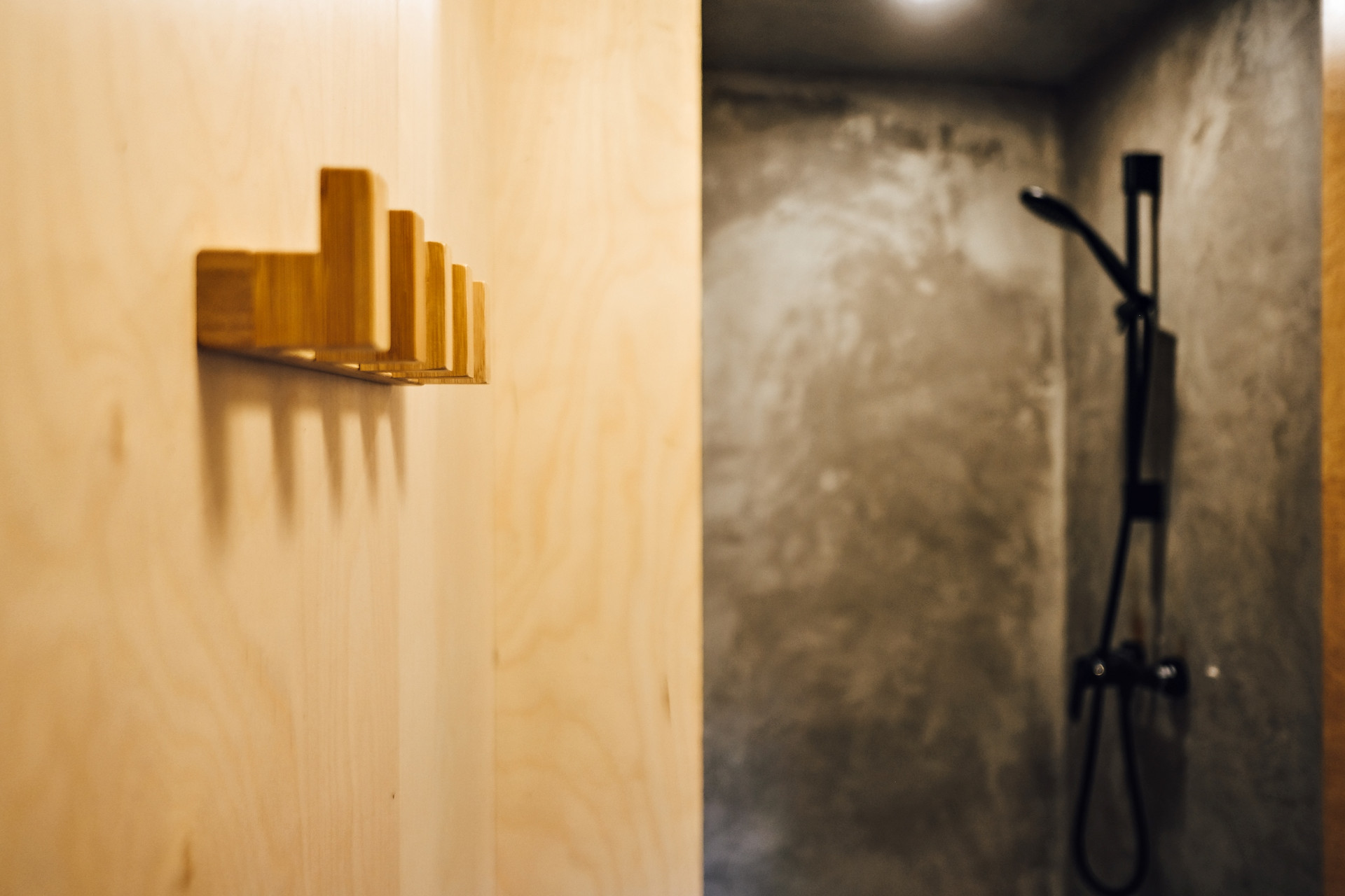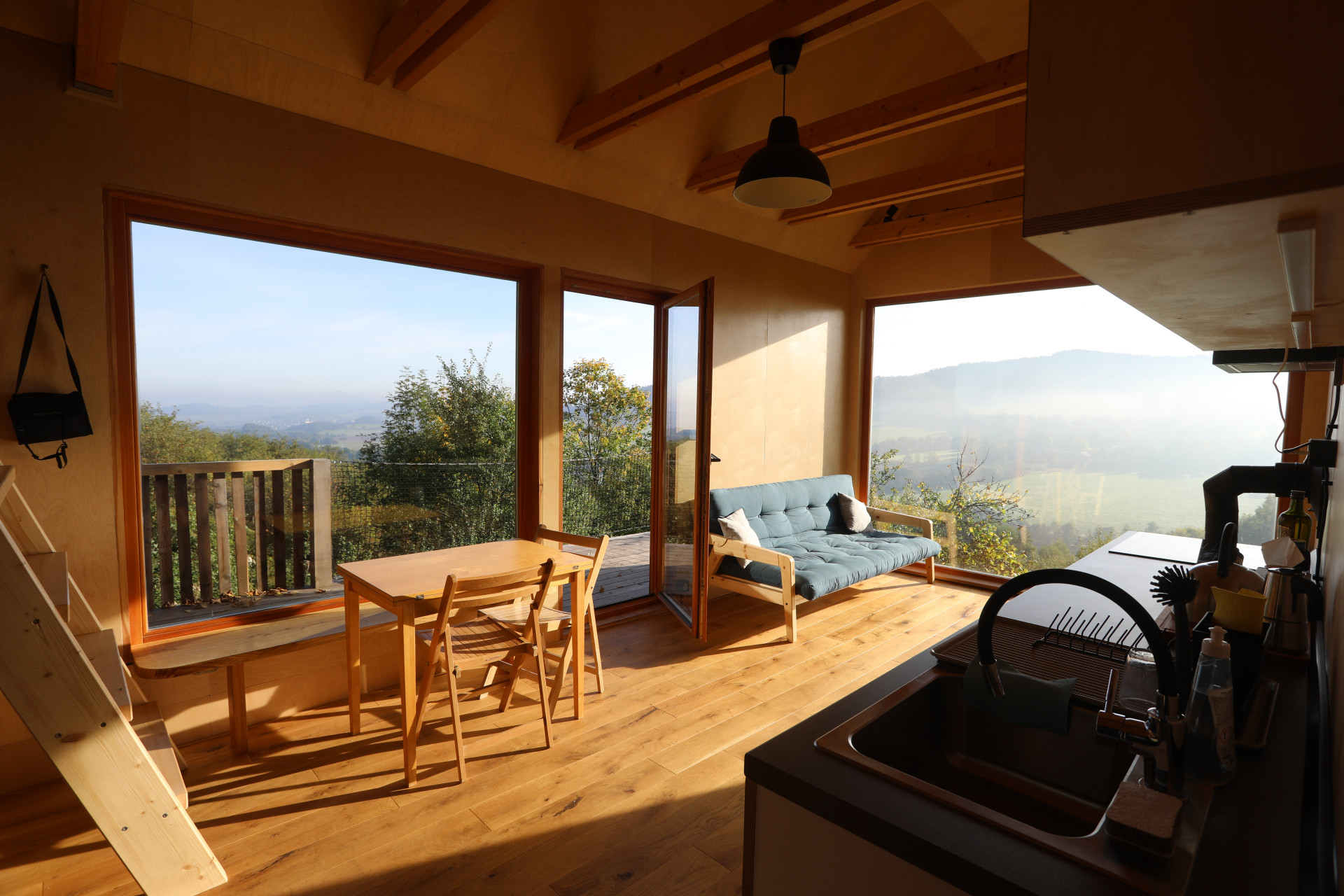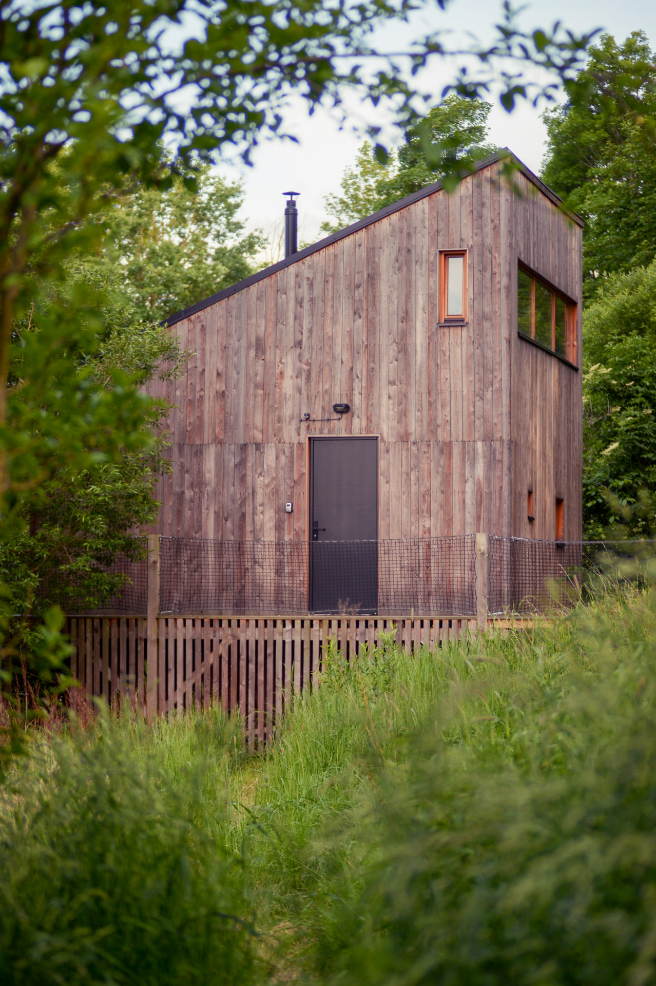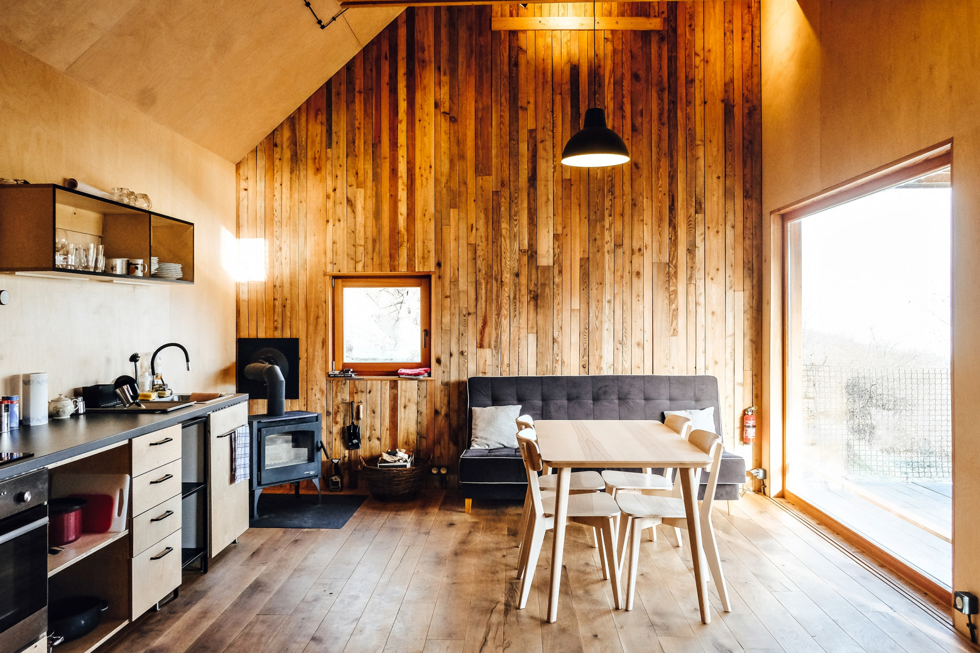 Dřevostavby jsou zabaleny do fasády z nehoblovaných modřínových prken, takže časem získají charakteristickou patinu. Spartánsky zařízené interiéry nabízí otevřené dispozice, kde se pohodlně ubytují až čtyři dospělí s dítětem. Prostor patra je oddělen pouze sítěmi. Pitná voda je zajištěna díky vlastní vrtané studni, domky jsou zároveň napojeny na domácí čistírnu odpadních vod.