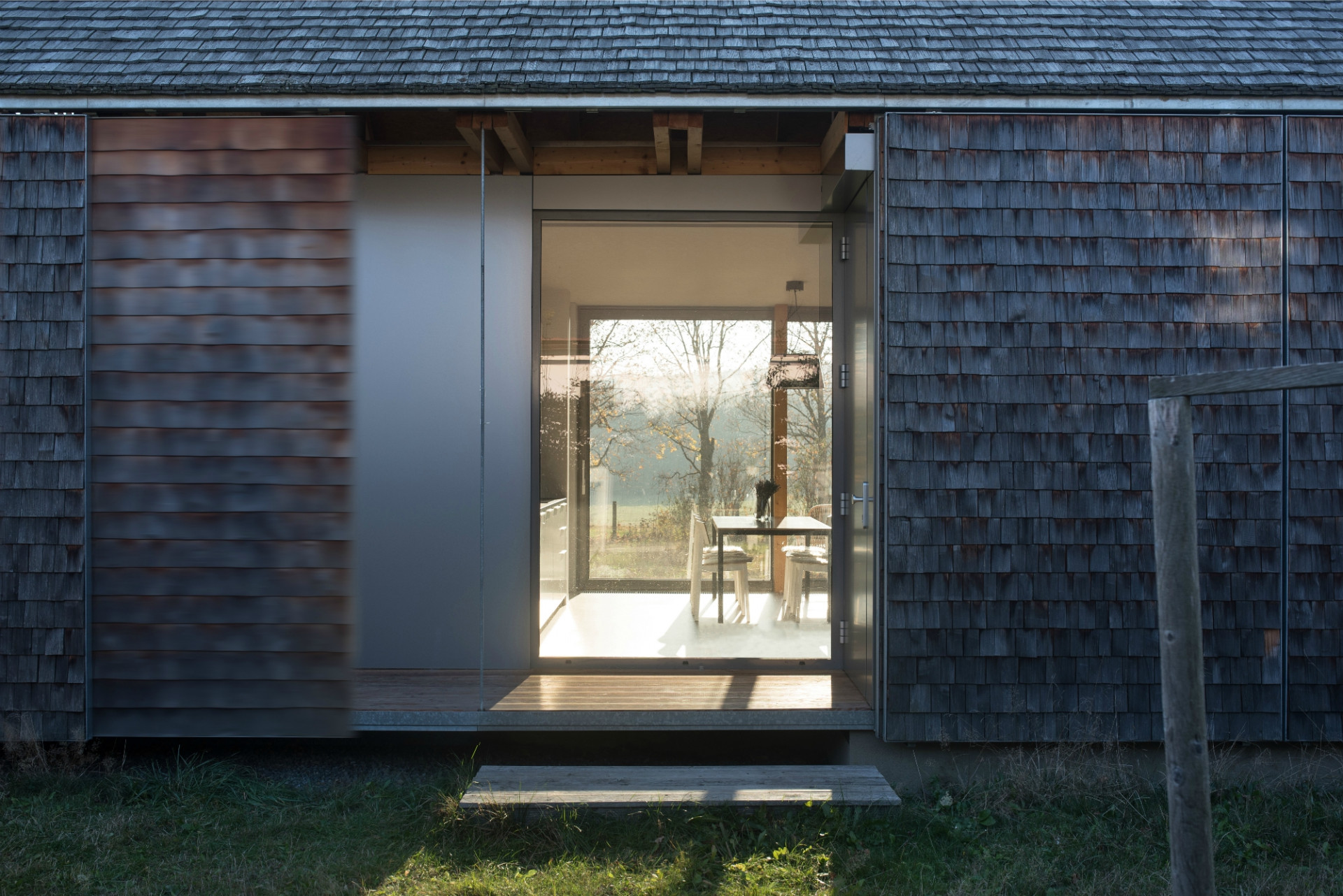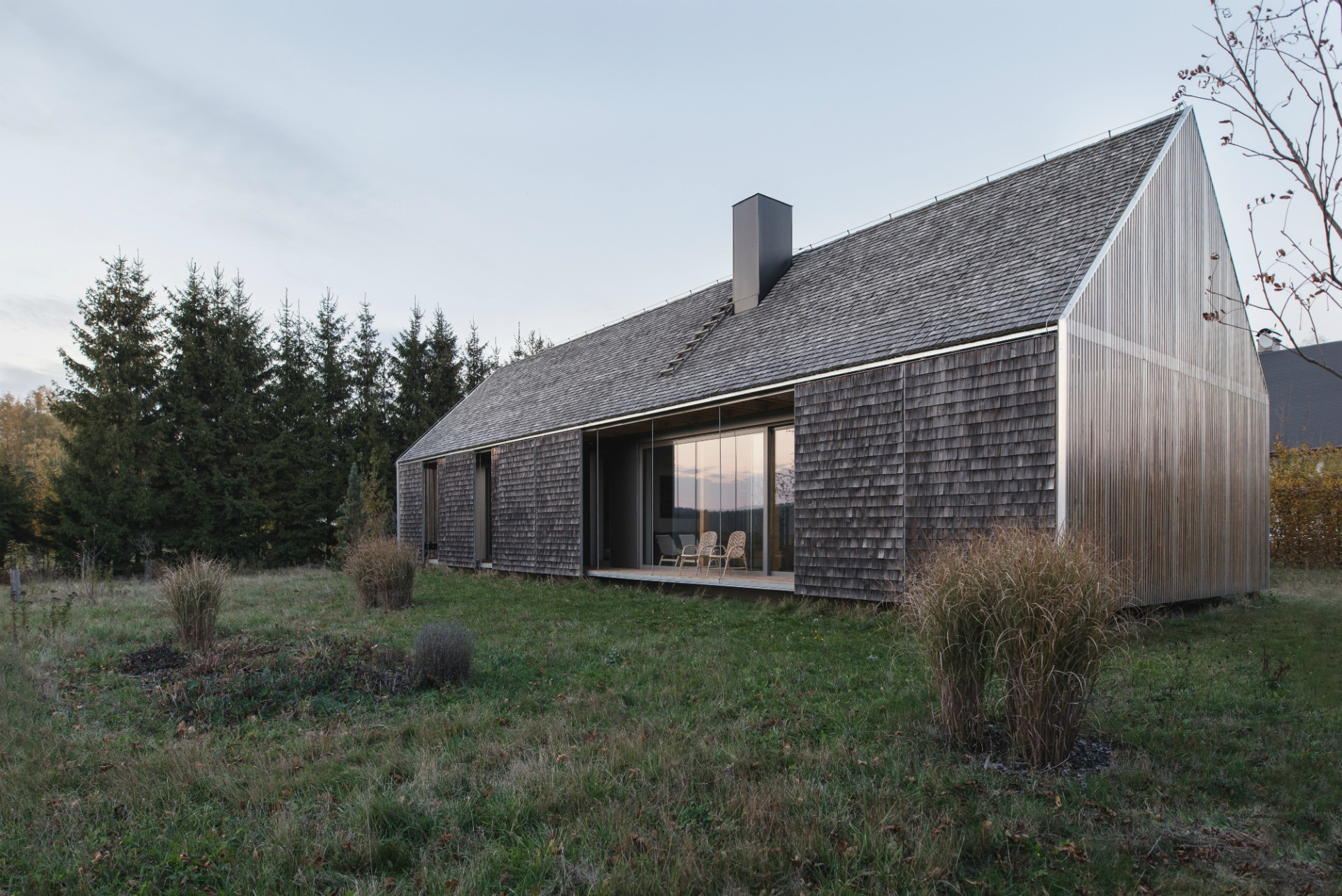 První návrhy rodinného domu v krajině Vysočiny u malé obce Křižánky vypracovali oceňovaní architekti Tomáš Pilař a Ladislav Kuba už v roce 2007. Projekt se ale po zahájení realizace na několik let pozastavil a jeho dokončení proběhlo před třemi lety. Návrh přízemního dřevěného domu založili autoři na principech místní lidové architektury, získal tak například zápraží, které lze po celém obvodu uzavřít posuvnými okenicemi. Dům musel navíc splňovat podmínky CHKO, které nařizovaly především sedlovou střechu, symetrický štít a obdélníkový půdorys. Splynutí domu s krajinou napomáhá také plášť domu ze štípaného šindele.