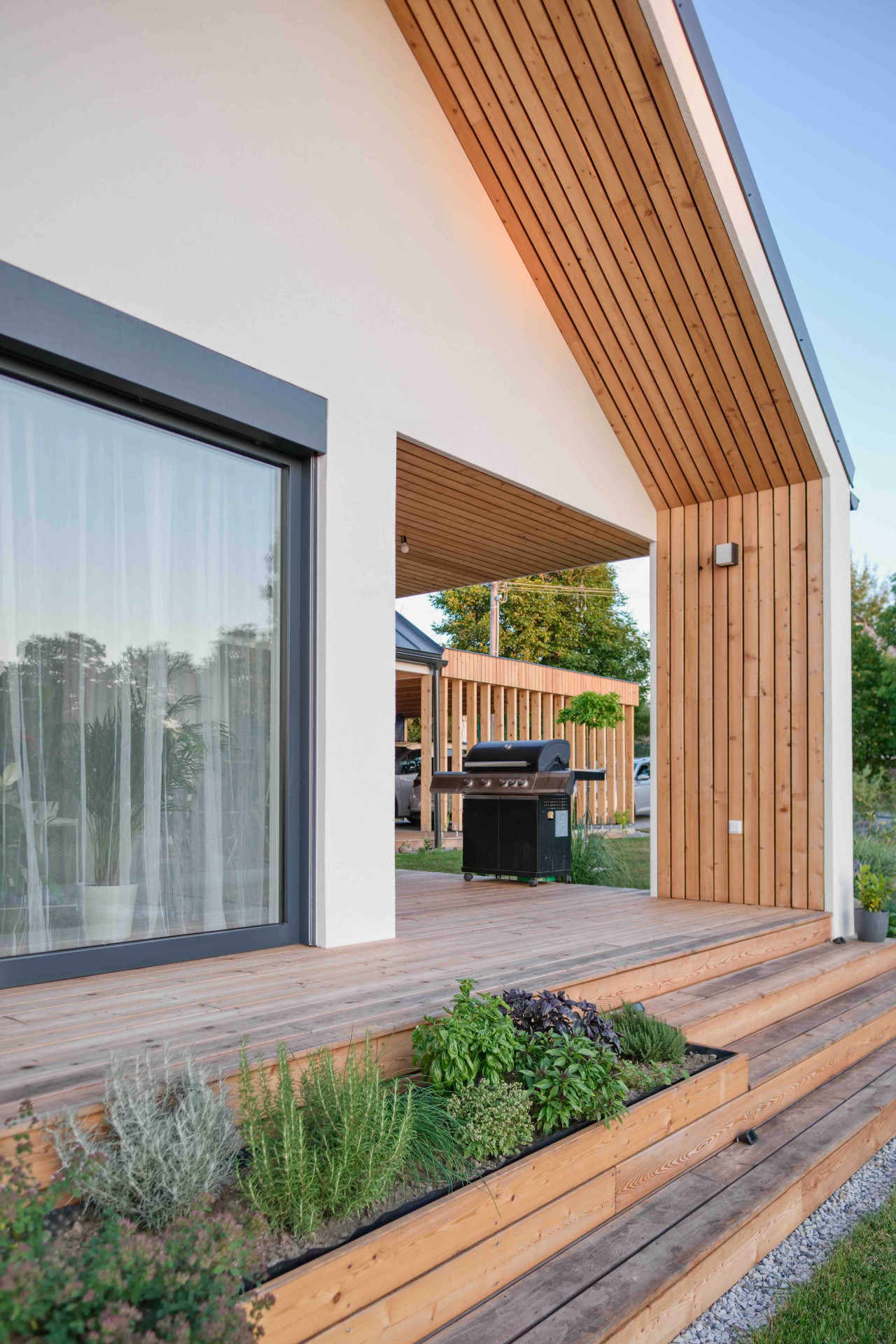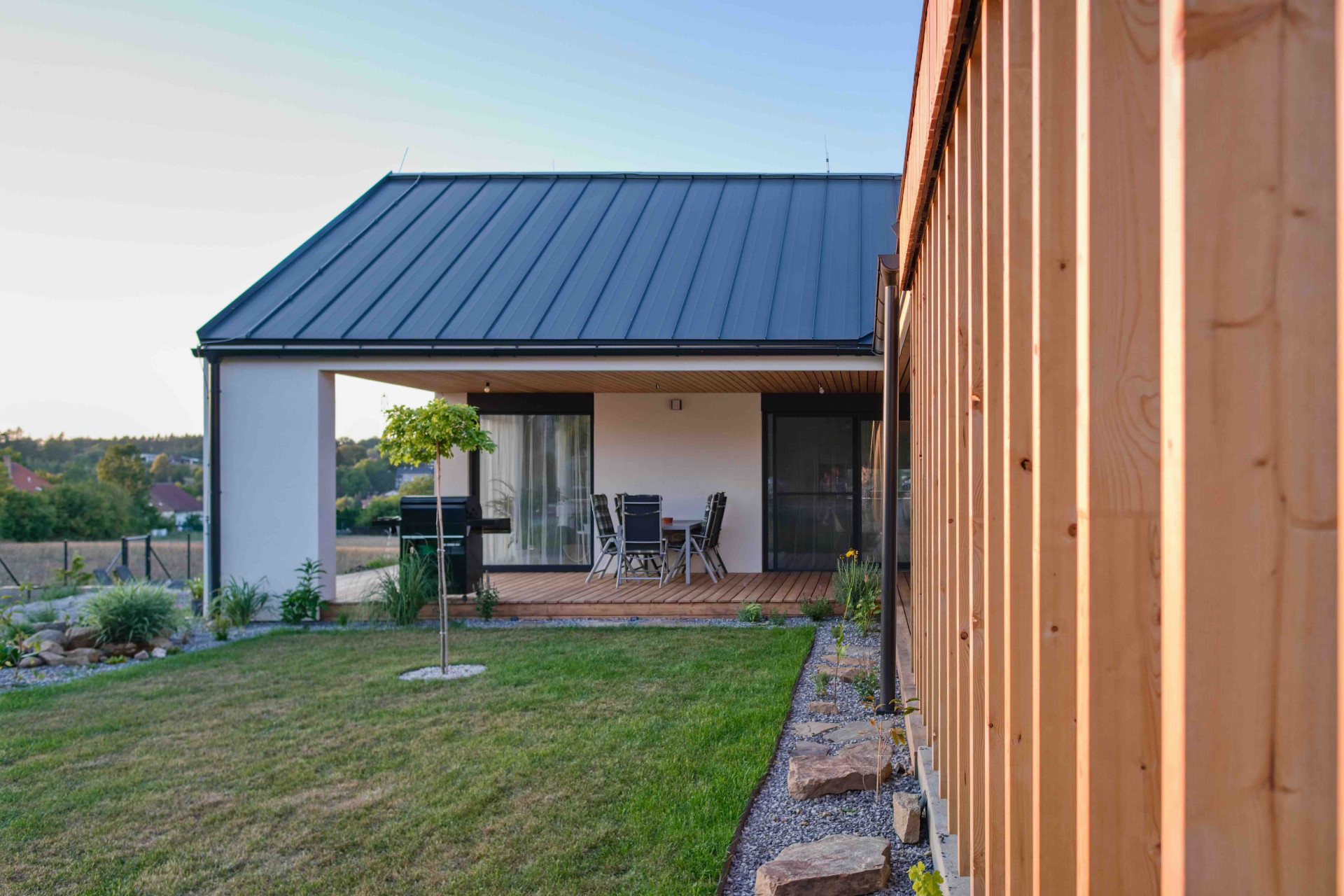 Na obývací prostor navazuje krytá terasa s posezením a grilem, kde rodina tráví mnoho společných chvil. Jedním z jejich nejoblíbenějších rituálů je ranní káva na slunci s výhledem do zahrady, která se postupně mění podle jejich představ. Momentálně pracují na jejím vylepšení, což jim přináší radost a naplnění.