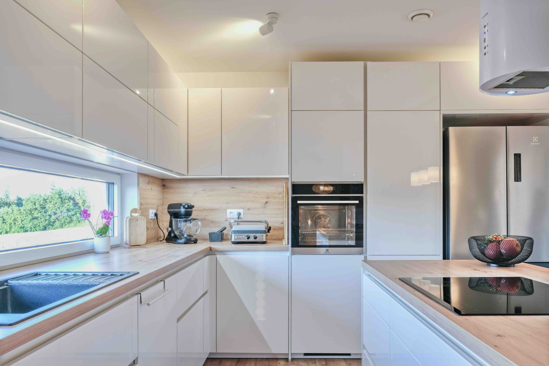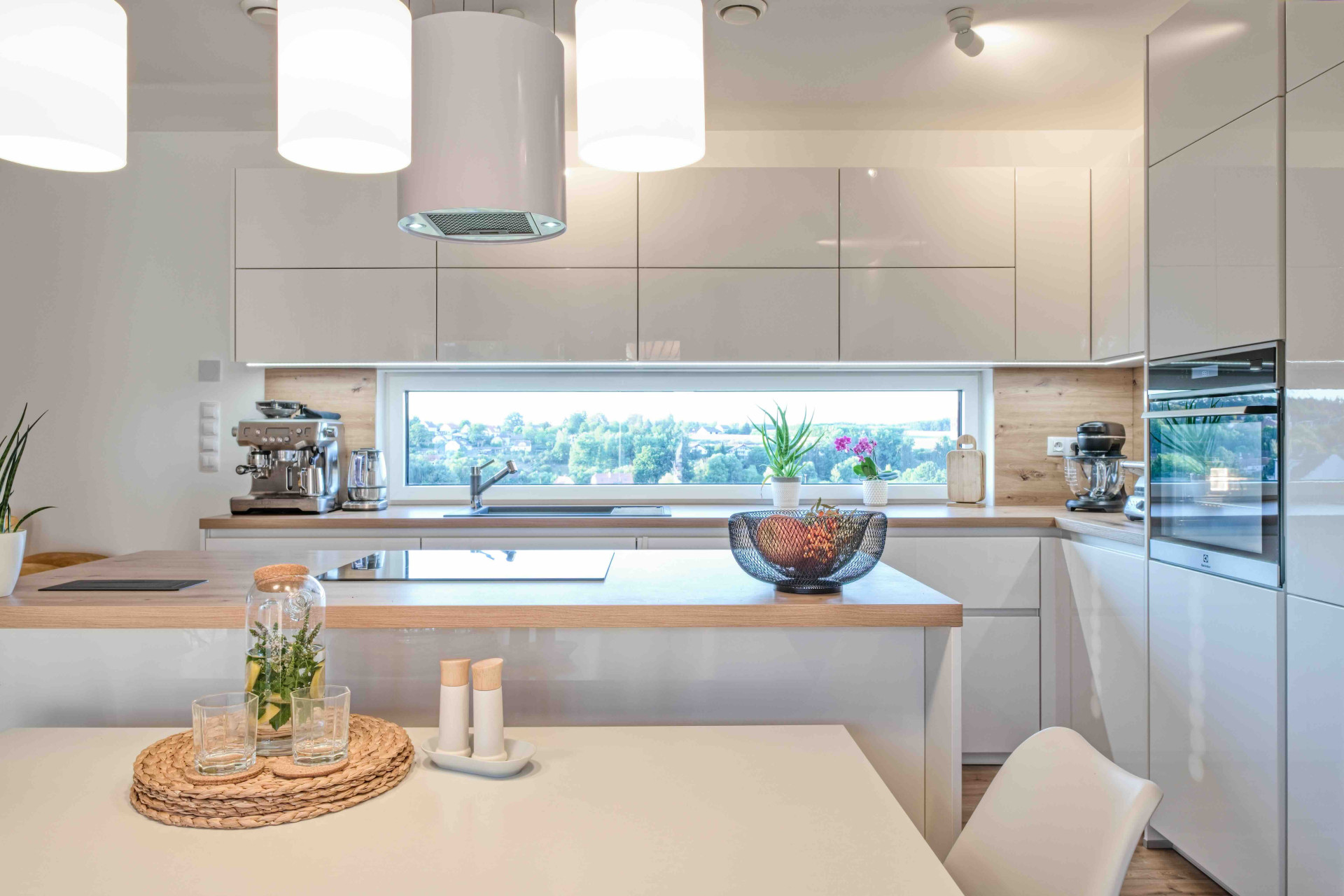 Centrem domu je velký obývací prostor s kuchyní, kde rodina tráví společný čas. Kuchyňská část je navržena v minimalistickém stylu – dominuje jí světlá barva, přírodní dřevo a velkorysé podélné okno, které přivádí nejen světlo, ale i kus okolní přírody přímo do interiéru.