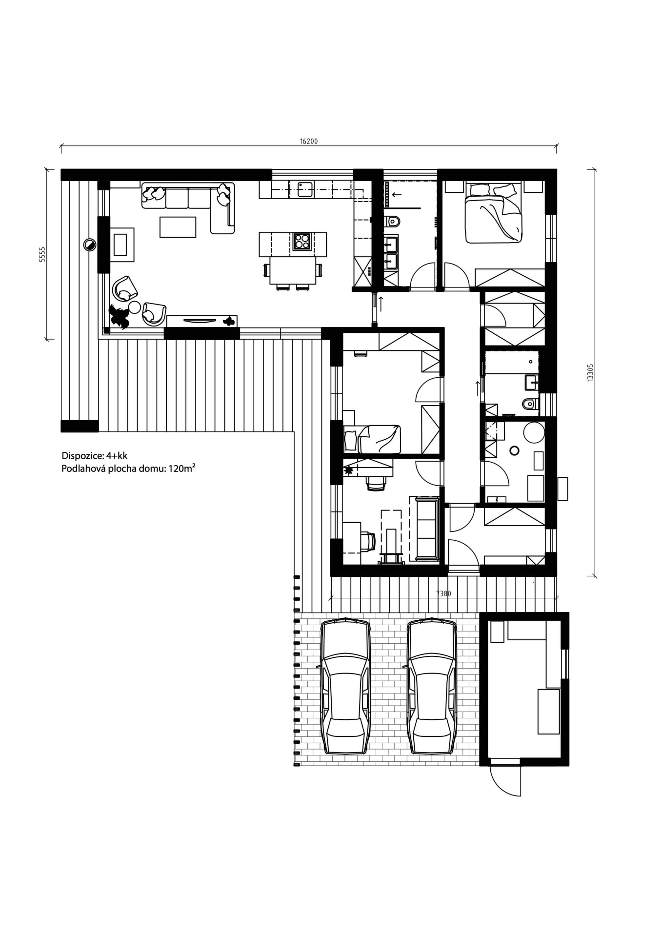 Před domem se nachází kryté parkovací stání s přilehlou kůlnou na zahradní nářadí, která ladí s celkovým konceptem domu.
