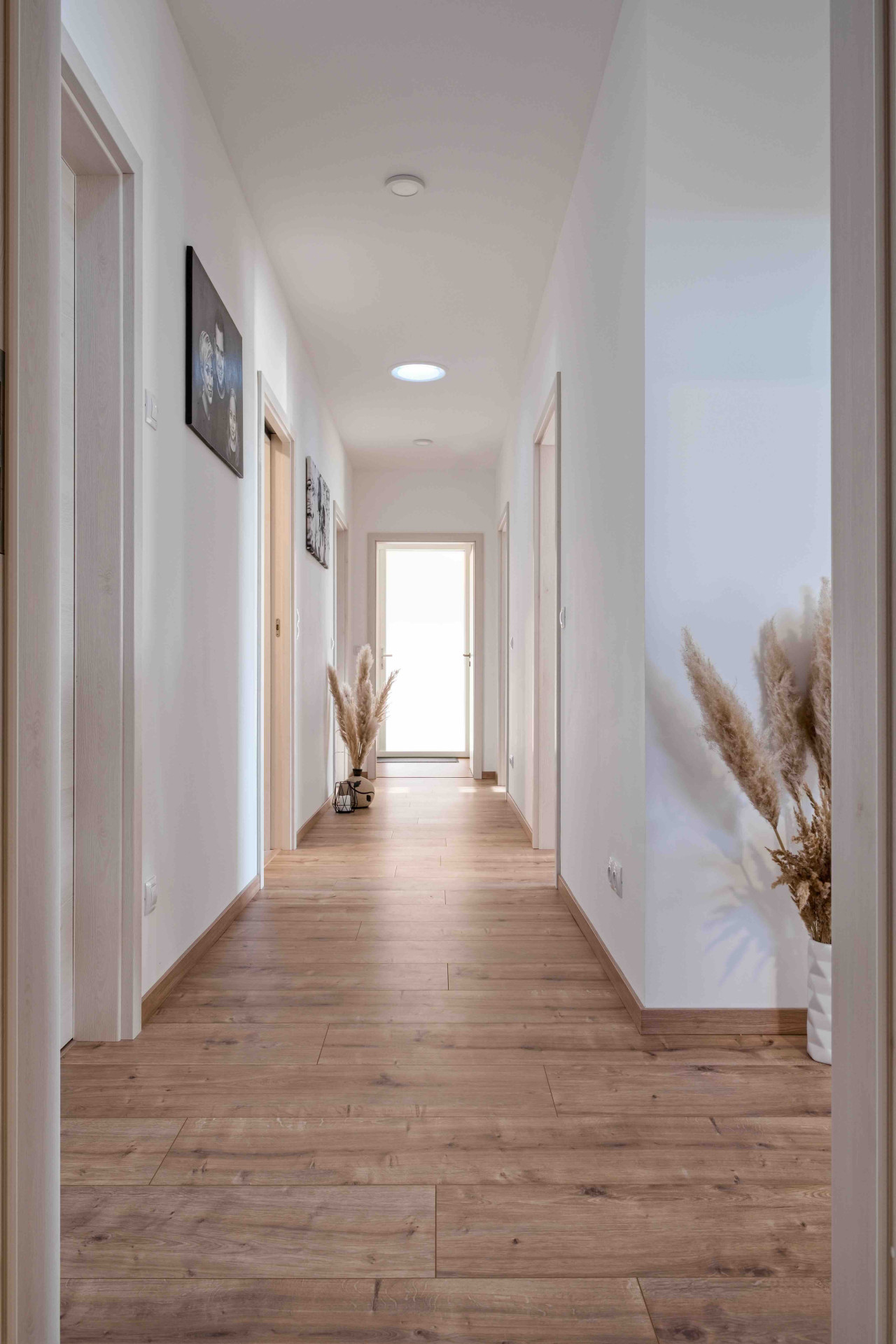 Bungalov o velikosti 120 m² byl navržen na půdorysu písmene L, což umožňuje velmi efektivní využití prostoru. Ze zádveří se vstupuje do dlouhé chodby, kterou prosvětlují dva stropní světlíky, přivádějící do interiéru přirozené denní světlo. Po pravé straně se nachází technická místnost obsahující veškeré technologie domu včetně pračky a sušičky. Naproti je multifunkční pokoj, který slouží jako pracovna, prostor pro cvičení a příležitostné přespání návštěv. Dále se zde nachází dětský pokoj, umístěný v blízkosti koupelny. Následuje ložnice rodičů, která sousedí s prostornou šatnou a vlastní koupelnou, využívanou také hosty.