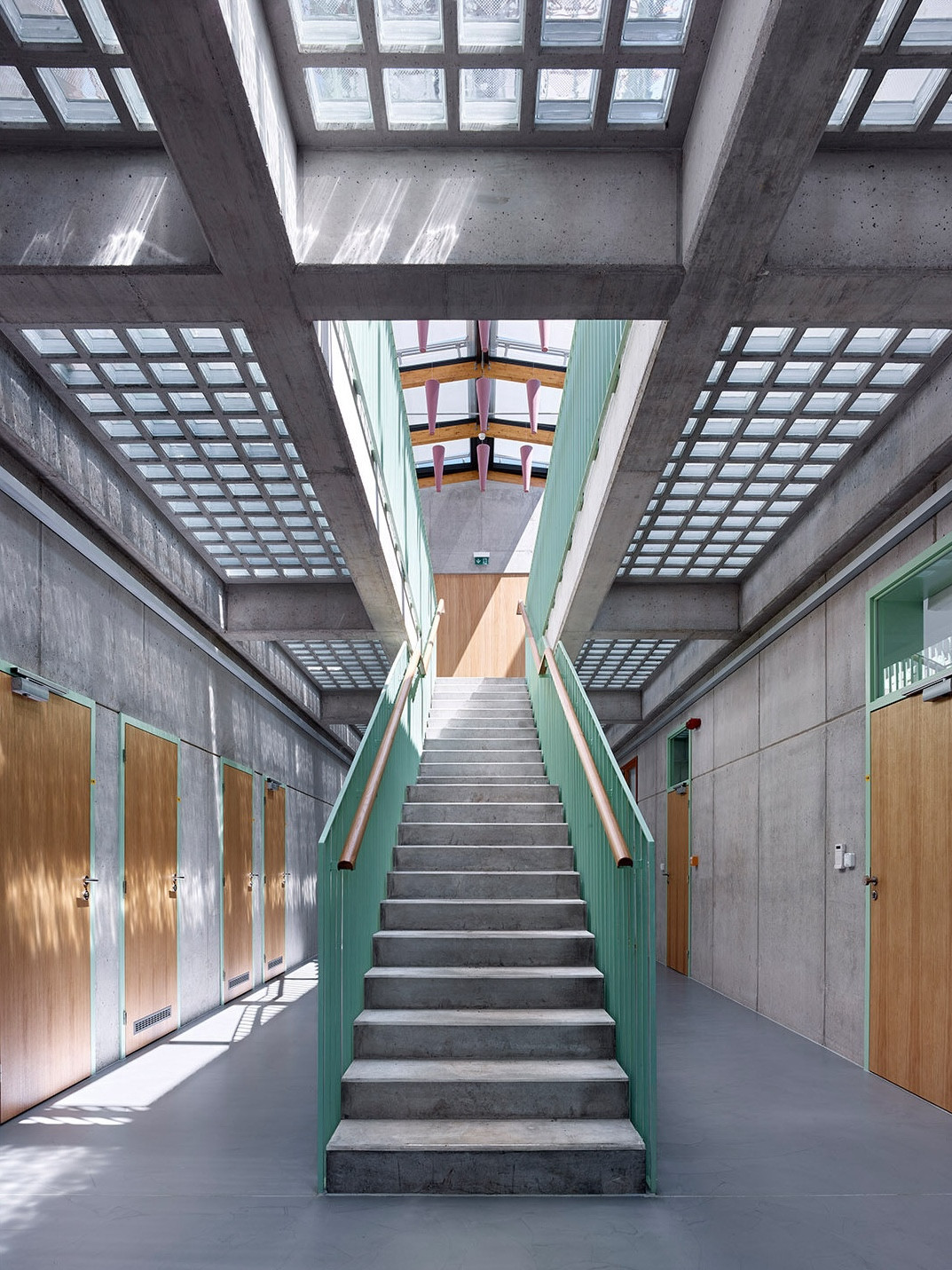 Budovy s technickým zázemím jsou pojaty utilitárně, byť se zajímavými architektonickými detaily, jako jsou dřevěné střešní nosníky. Administrativní část má o poznání výtvarnější prvky. Dvoupodlažní budova s kancelářemi a zázemím pro zaměstnance je umístěna přímo u vjezdu do areálu a od dálnice je odcloněna budovou garáží. Interiéru dominuje pohledový beton a dřevo v kombinaci s barevnými kovovými zárubněmi a zábradlím. “Jejím jádrem je komunikační hala, jejíž sklobetonová podlaha a střešní světlík zajišťují interiéru dostatek přirozeného světla.” doplňuje Petr Pelčák. A právě lomené světlo, dopadající skrz sklobeton na plochy haly, dodává hladkým povrchům další, proměnlivou strukturu.