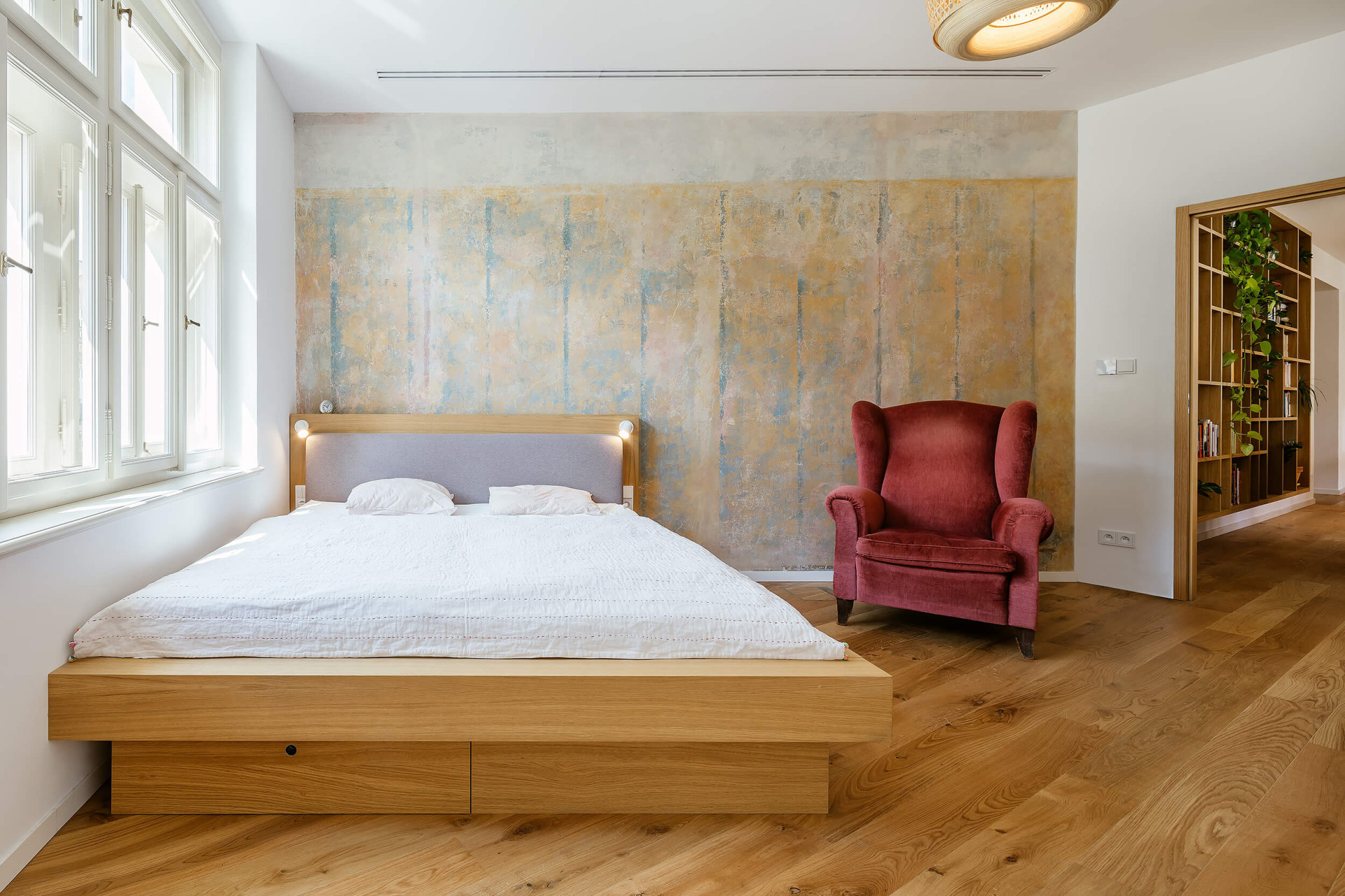 Sousední ložnici dominuje zrestaurovaná hrubě proškrabovaná omítka, která svými teplými odstíny ladí s dřevěnou postelí a podlahou, která sem pokračuje z obývacího pokoje. Nábytek ze stejného materiálu prostupuje celým bytem, je z něj knihovna v pracovně, stoly, i vestavěné skříně na chodbě.