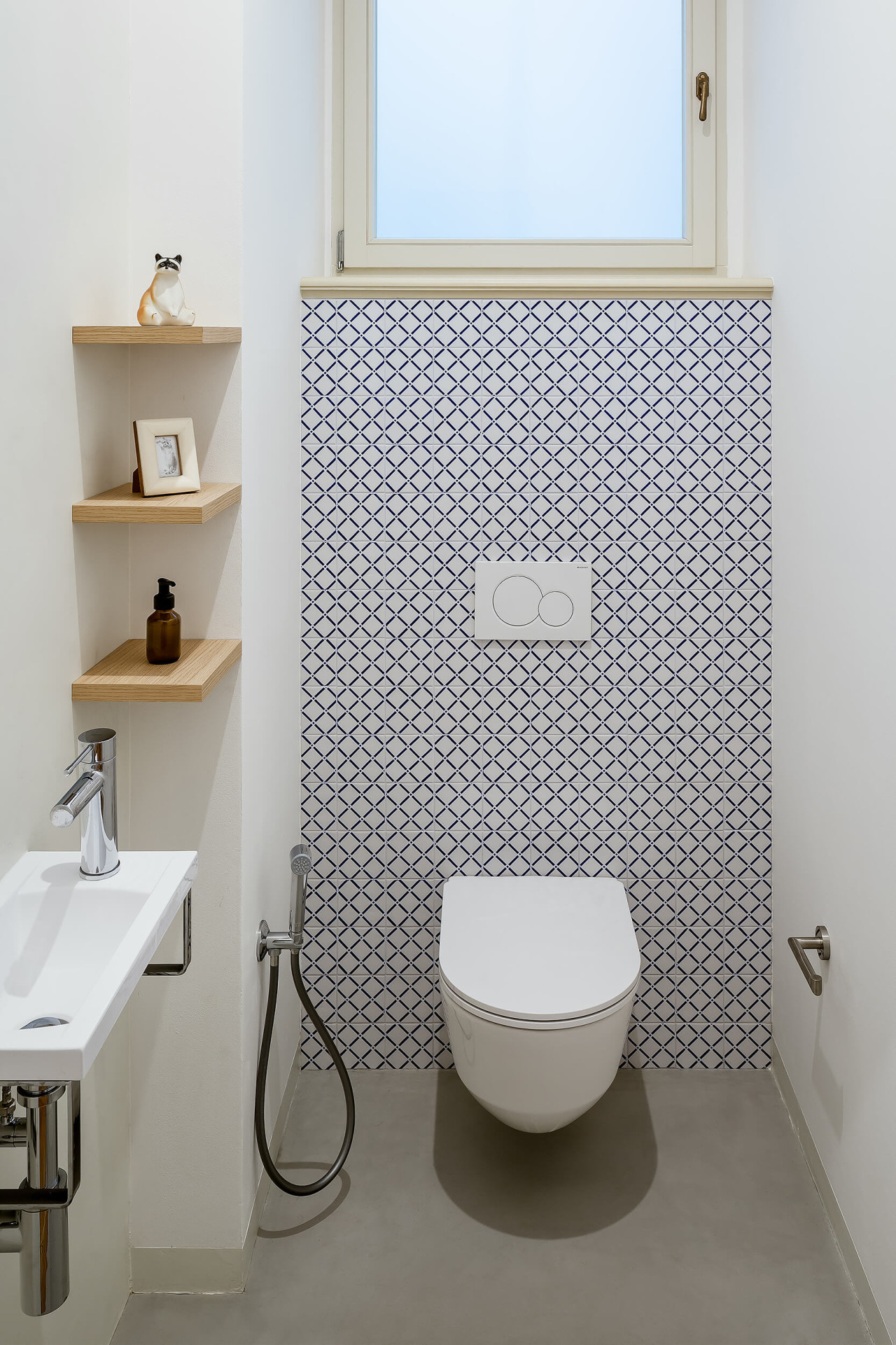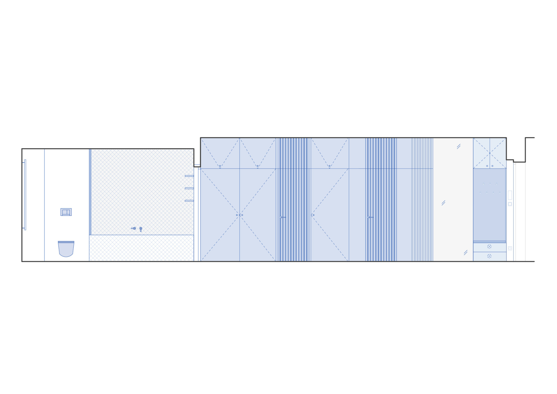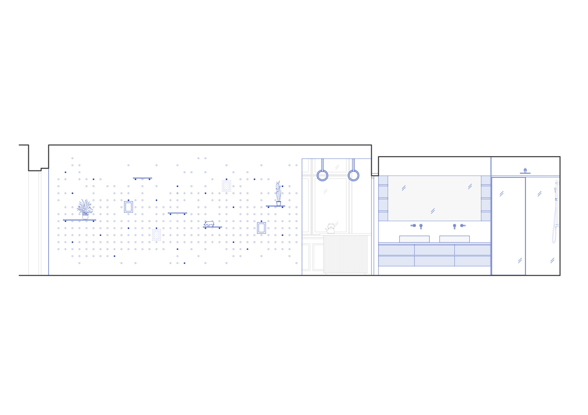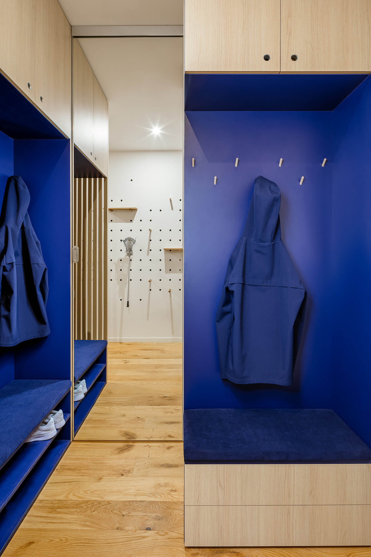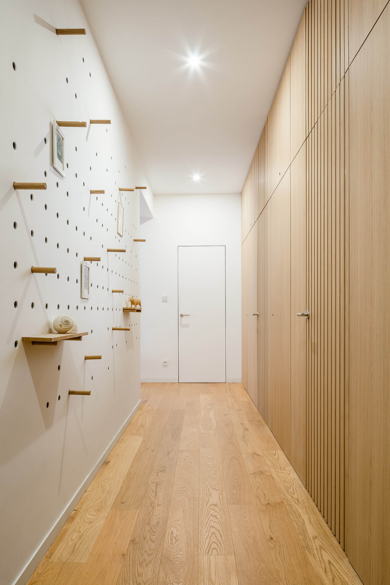 Vzhledem k dispozičnímu řešení bytu bylo potřeba dobře pracovat s chodbou, která je dlouhá a zpřístupňuje několik místností – konkrétně šatnu, WC, technickou místnost, prádelnu a koupelnu. Pozornost v ní na sebe strhává adaptibilní stěna, po které je možné různě posunovat dřevěné kolíky a poličky.