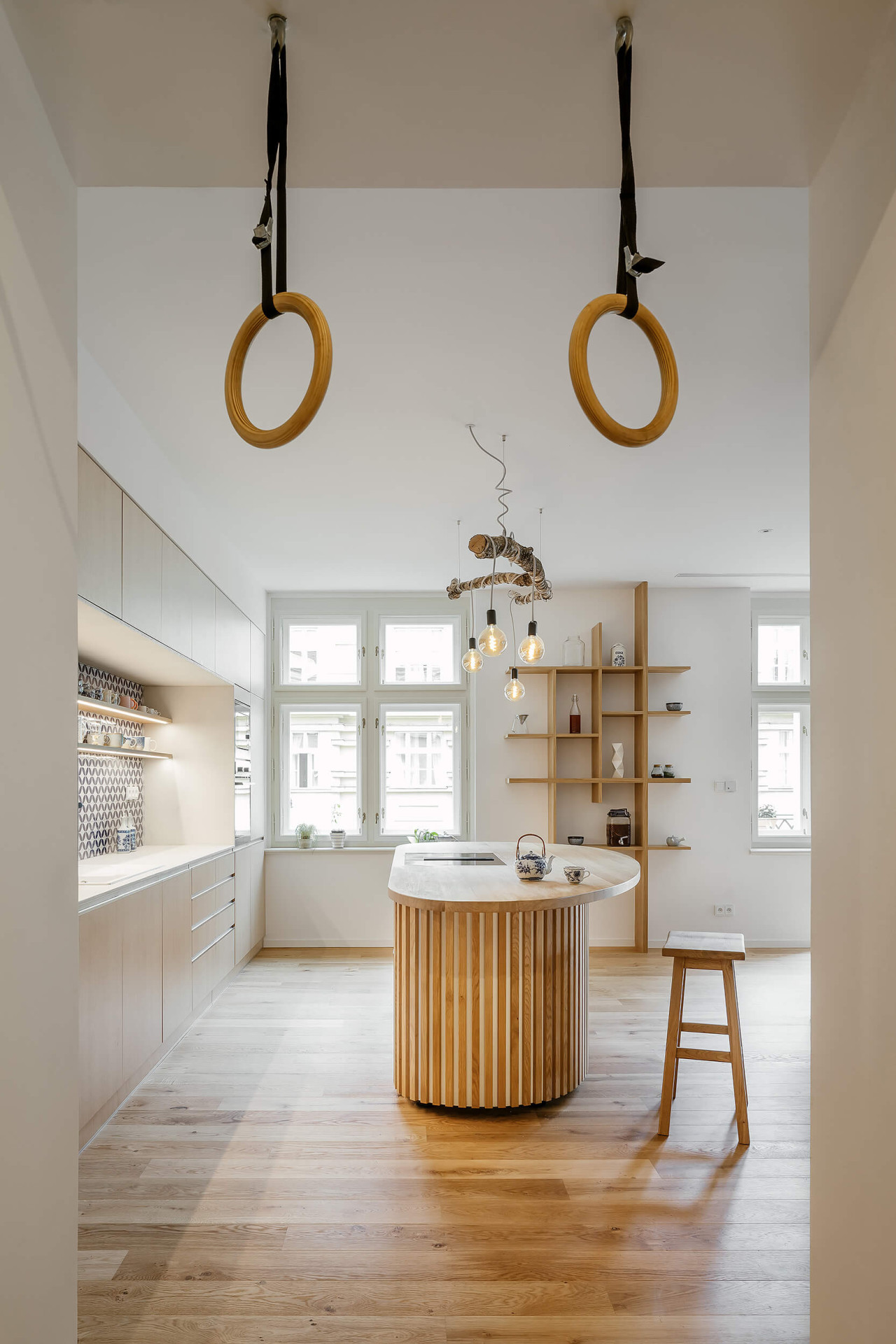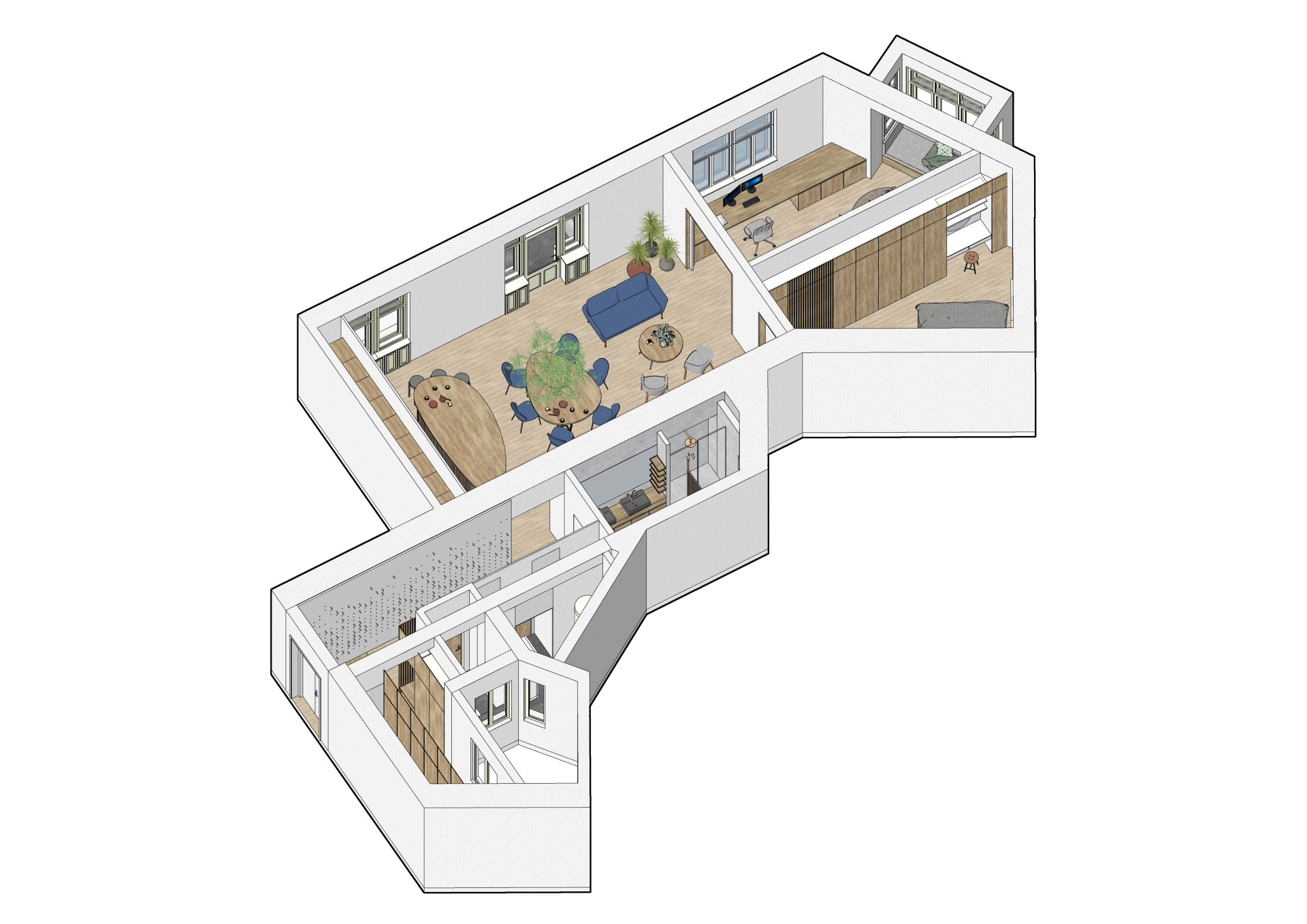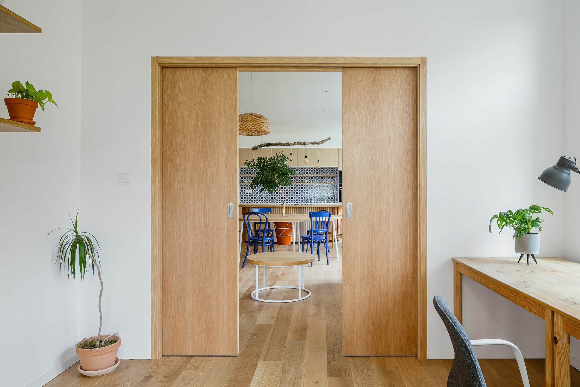 Ústředním prostorem bytu je hlavní obytný pokoj, obsahuje kuchyň, jídelnu i obývací pokoj, vše je propojené a maximálně otevřené. Zaoblený nábytek, nejčastěji ze dřeva, zde porůstají ,nebo jím přímo prorůstají, rostliny. Místnost je velkorysá, má 52 metrů čtverečních, dá se ale ještě o něco zvětšit. Navazuje na ni totiž pracovna, kterou je možné oddělit posuvnými dveřmi. „Pracovna je připravena na adaptaci na funkci dětského pokoje a v prostoru fasádního arkýře je doplněna o vestavěnou pohovku, která slouží zároveň jako úložný prostor a návštěvnická postel,“ vysvětlují architekti.