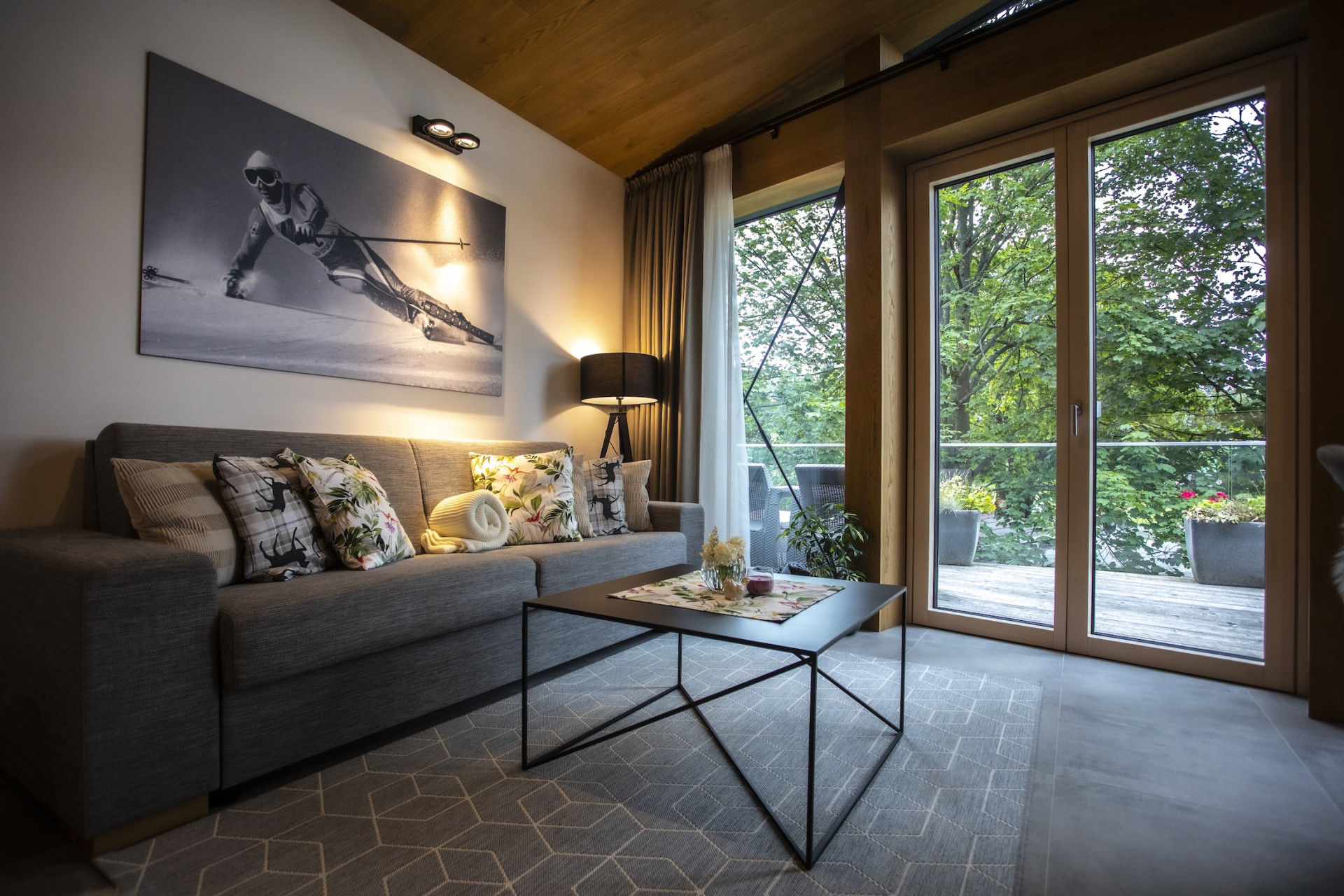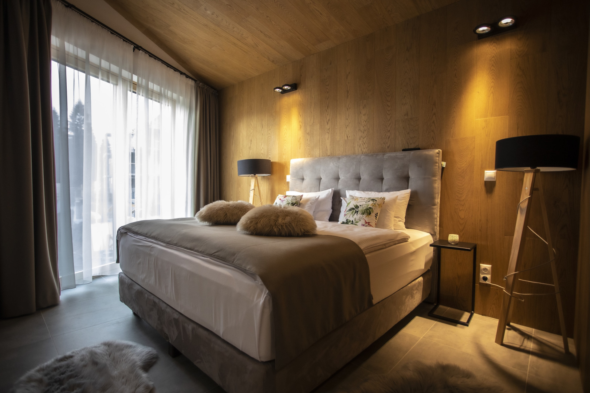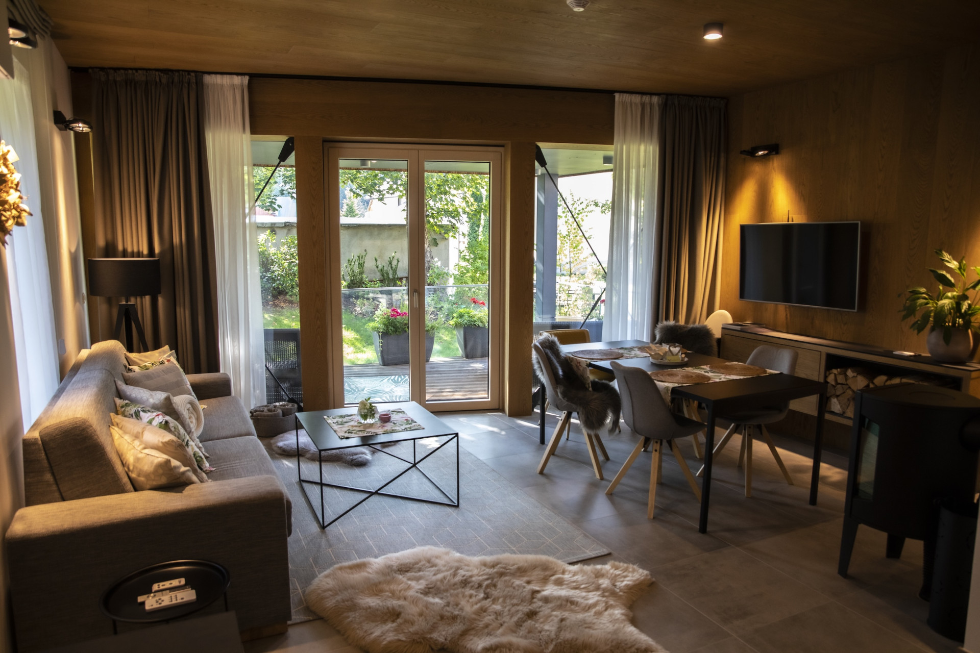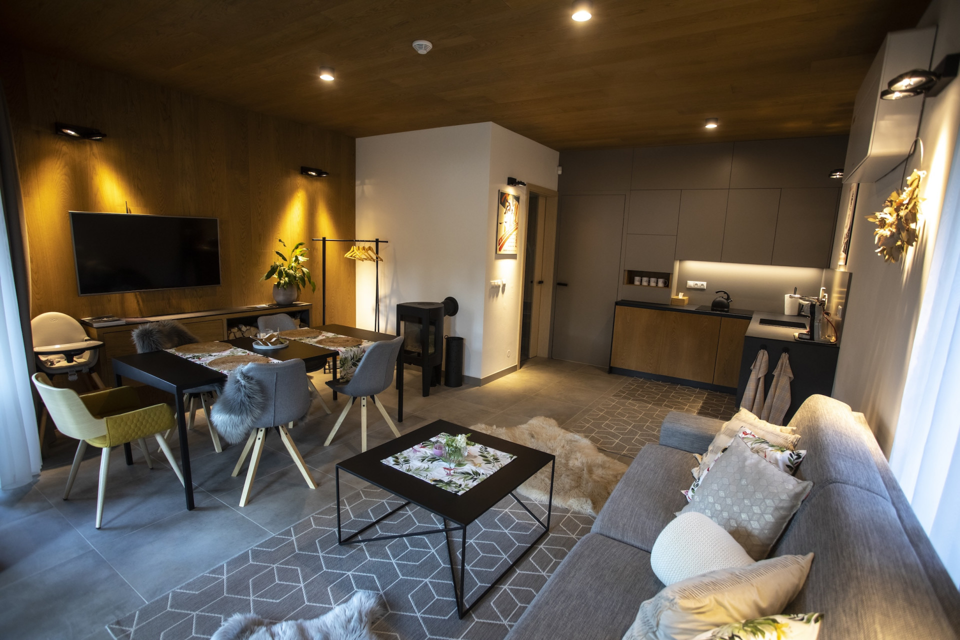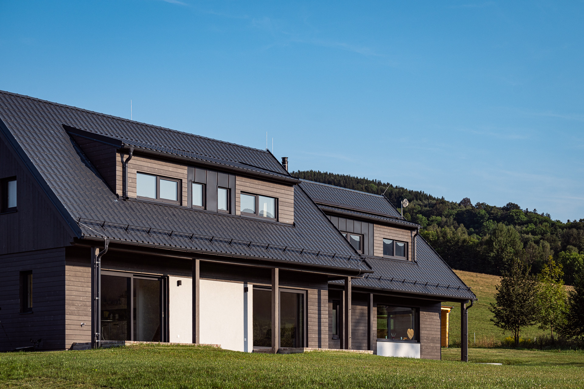 Fasáda kombinuje tmavý dřevěný obklad s minerální omítkou – výsledkem je harmonický celek, který nepůsobí ani příliš rustikálně, ani moderně. Pohledové trámy, a dřevěné stropy evokují tradiční horskou chalupu – to vše s komfortem, který moderní host očekává. Střecha je osazena fotovoltaikou, což částečně pokrývá náklady na provoz.