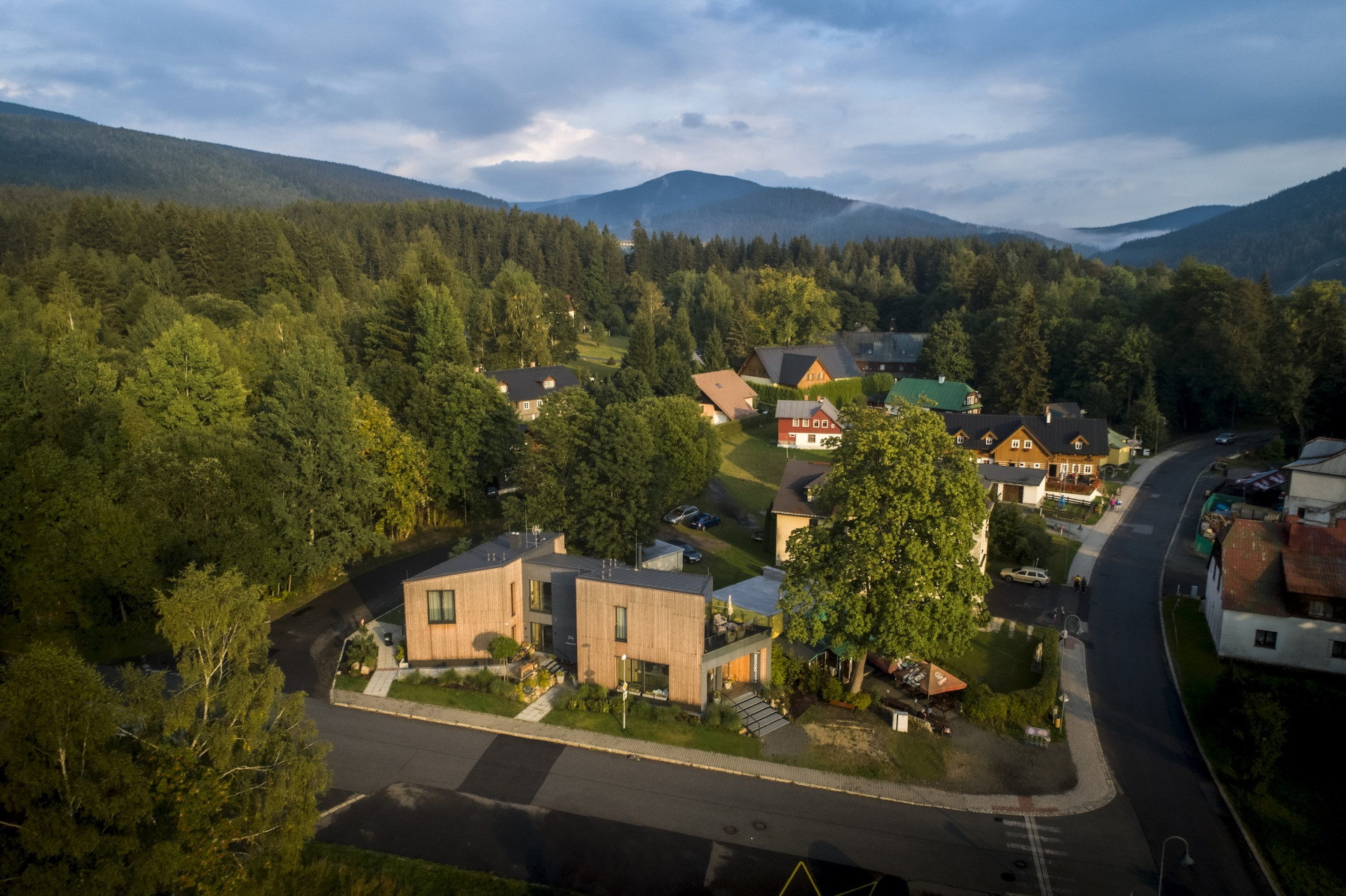Harrachov je jedno z nejznámějších horských středisek v Čechách. Turistická konkurence je tu silná a nároky hostů vysoké. Přesto – nebo možná právě proto – se investor rozhodl vsadit na dřevostavbu.