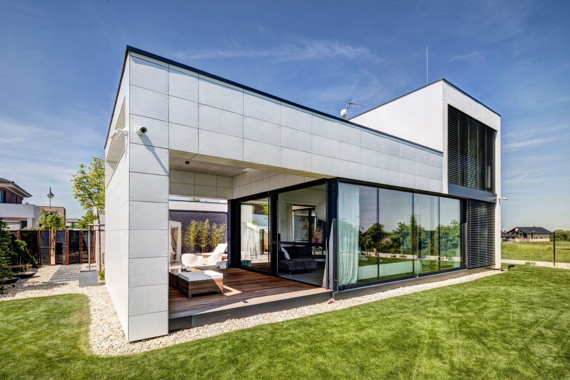 Dřevostavba rodinného domu otevírá své interiéry do klidného dvora lemovaného terasami
