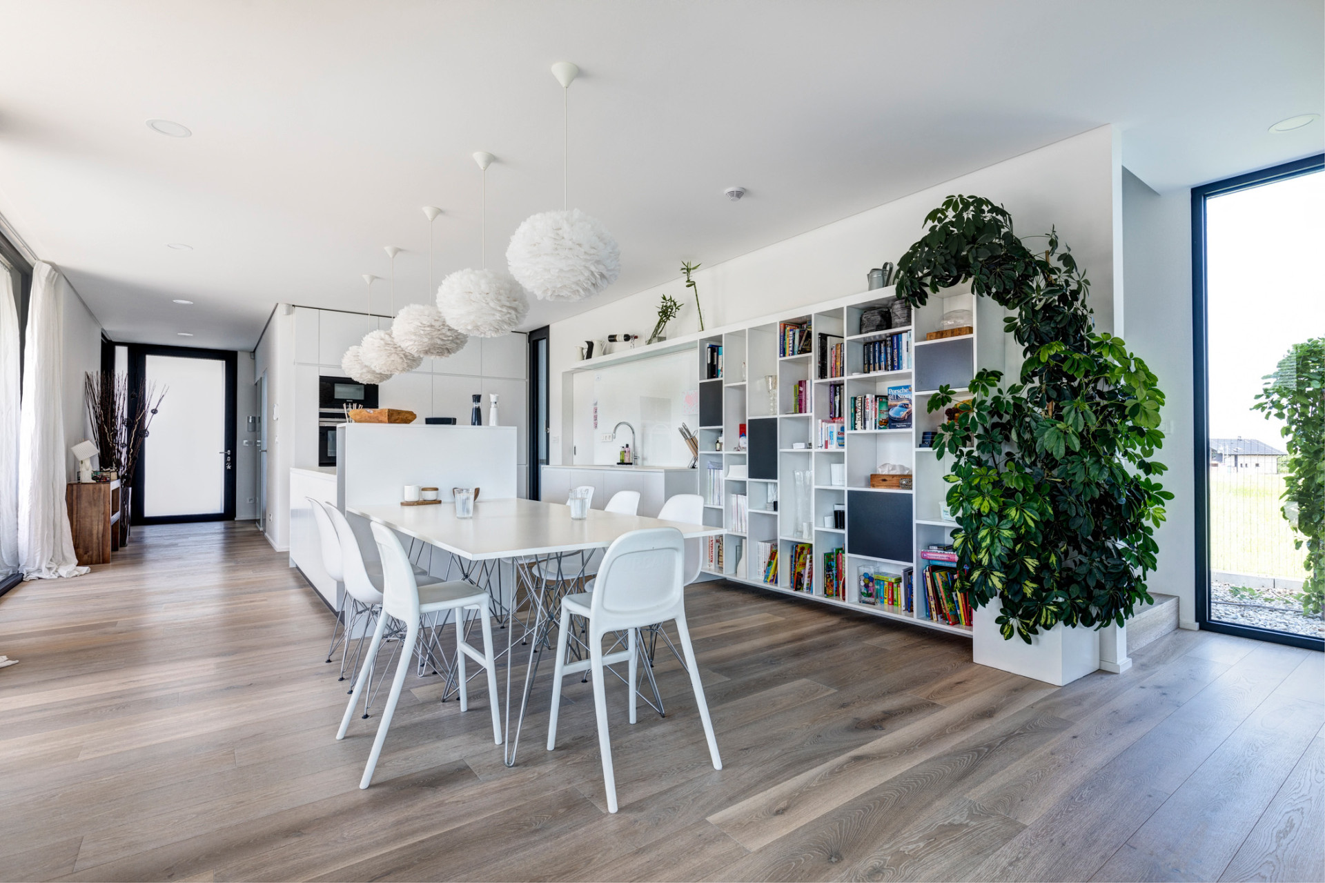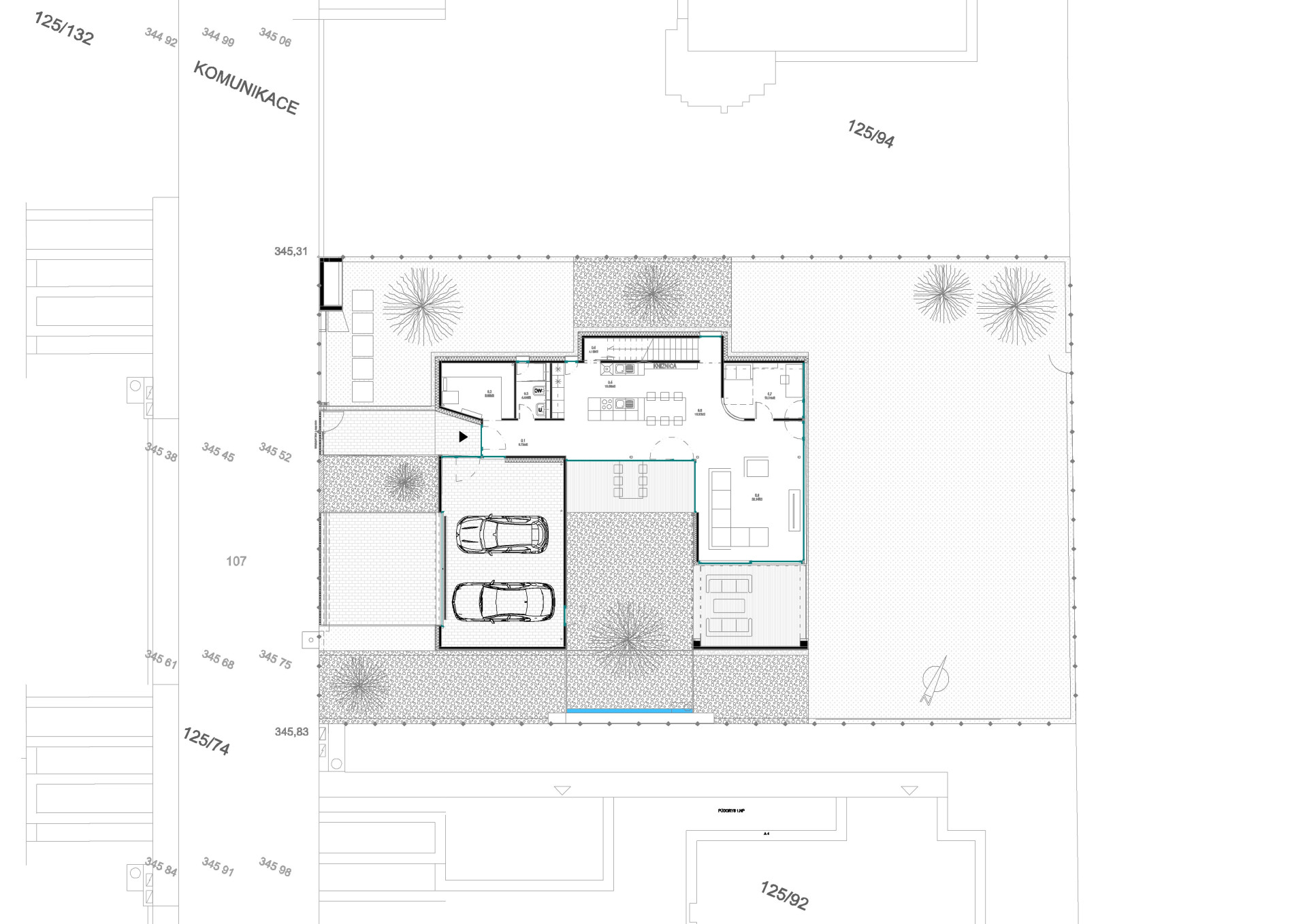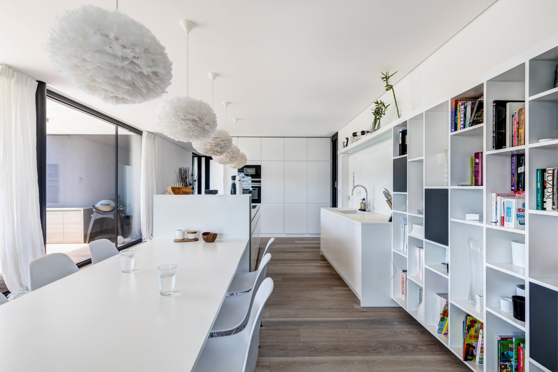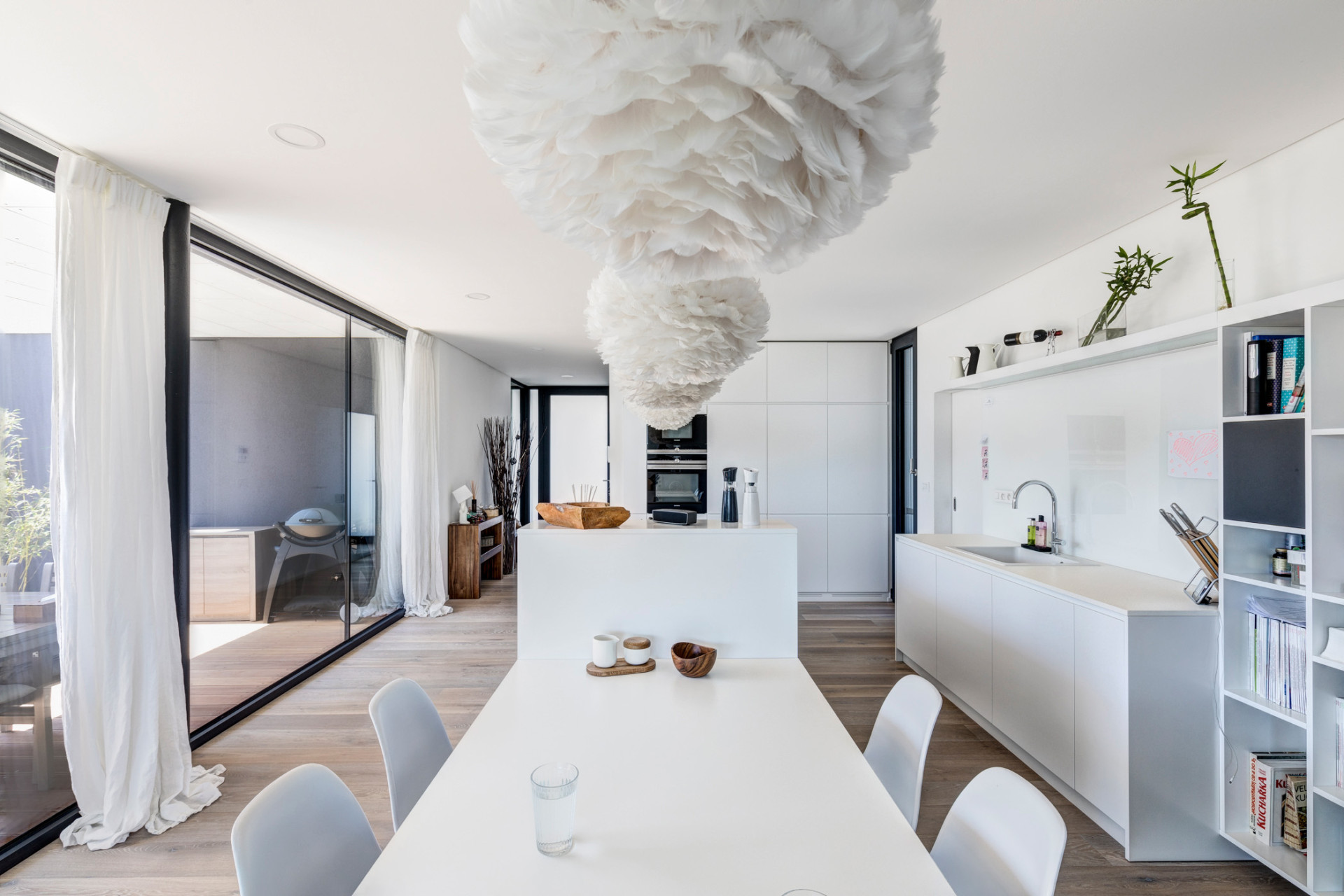 Prostorný hlavní obytný prostor tvořený kuchyní, jídelnou a obývacím pokojem se nachází v přízemí. Jeho plochu dále rozšiřují kryté terasy umístěné ve vnitřním dvoře. Jedna je koncipována jako venkovní jídelna, druhá jako prostor k odpočinku.
