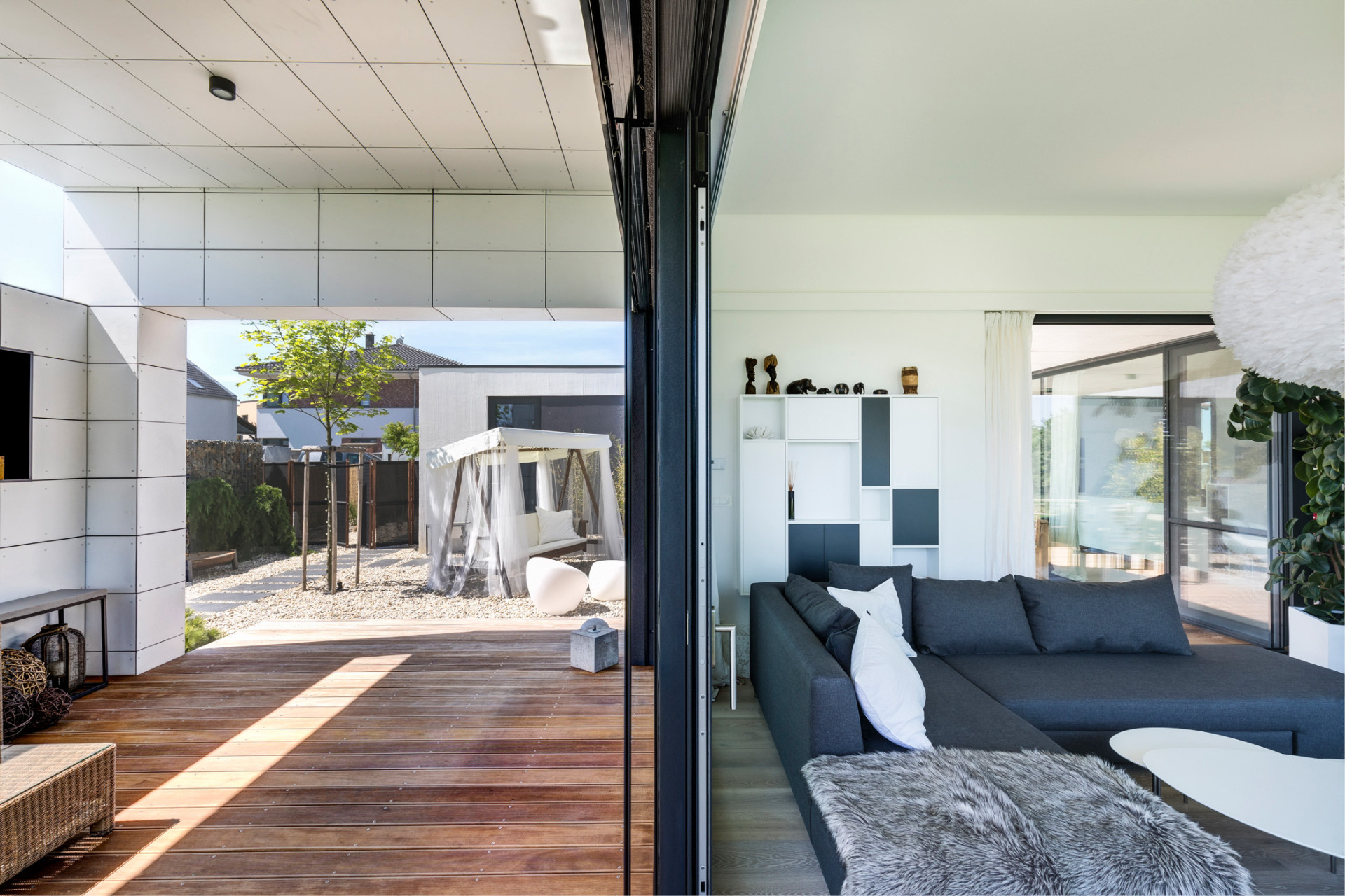 Čtyřčlenná rodina může ve svém domě od slovenského ateliéru MOLNÁR-PERÁČEK trávit slunečné dny na pobytové střeše i dřevěných terasách. Jedním z hlavních požadavků investorů bylo propojení interiéru se exteriérem.