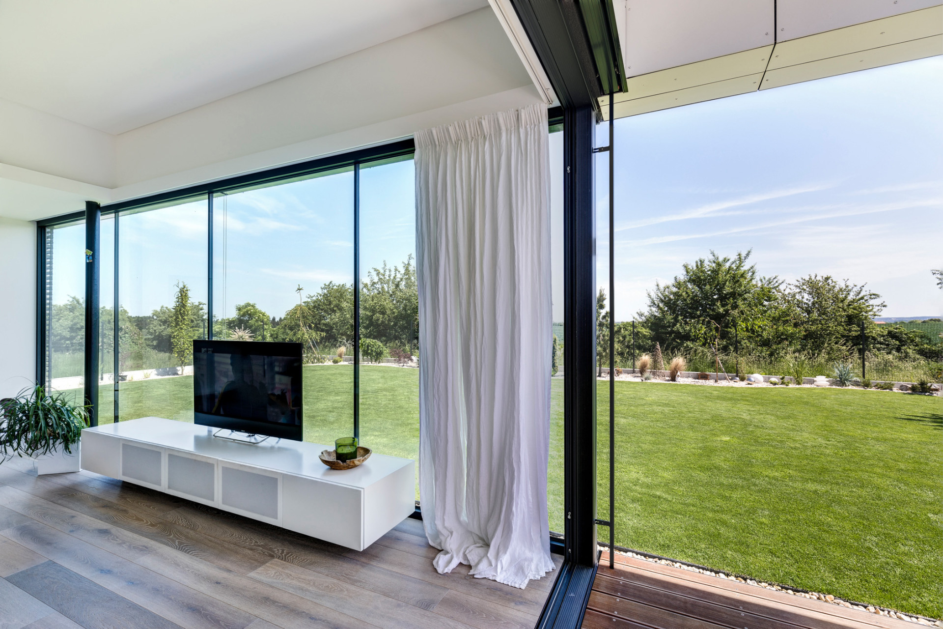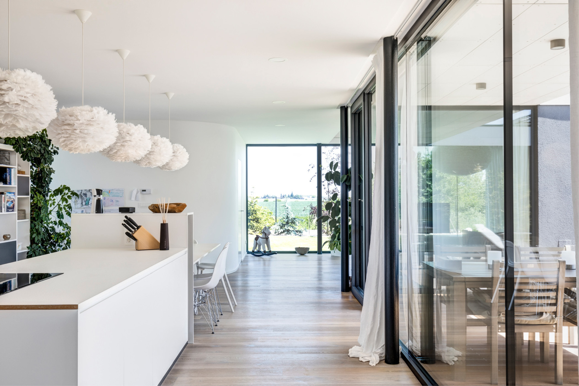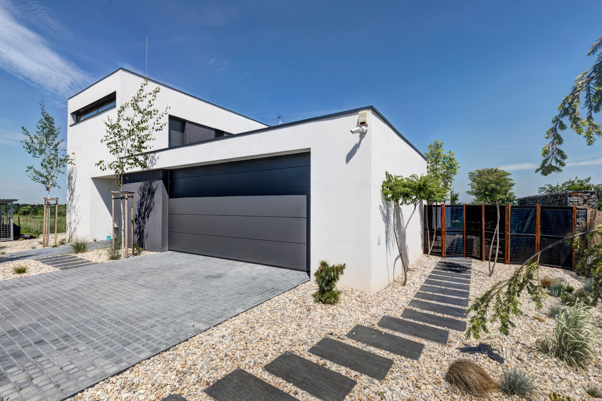 Interiéry domu jsou zařízeny střídmě, vybavení, ale i celková forma stavby, v náznaku přebírá vybrané prvky a principy z funkcionalistické architektury. „Měkký oblouk pokoje pro hosty oživuje interiér a odkazuje na funkcionalismus, se kterým majitelka domu sympatizuje,“ dodávají architekti. Pro fasády domu byly nakonec zvoleny bílé cementovláknité desky CEMBRIT Express (Cembrit aktuálně nabízí desky malého formátu v řadě Small Module), které kontrastují s tmavými rámy velkoformátových oken. Propojení interiérů s exteriérem se v domě za Prahou od architektů z ateliéru MOLNÁR-PERÁČEK odehrává na všech podlažích.