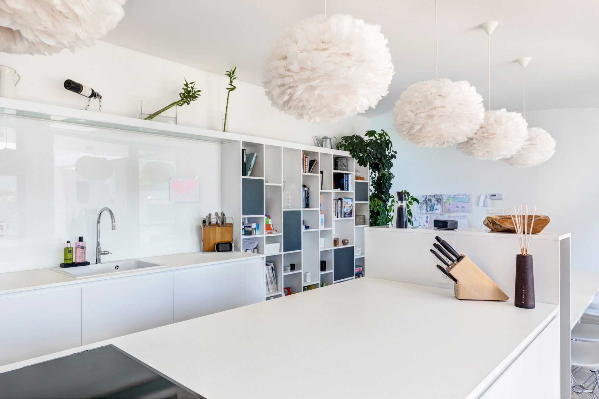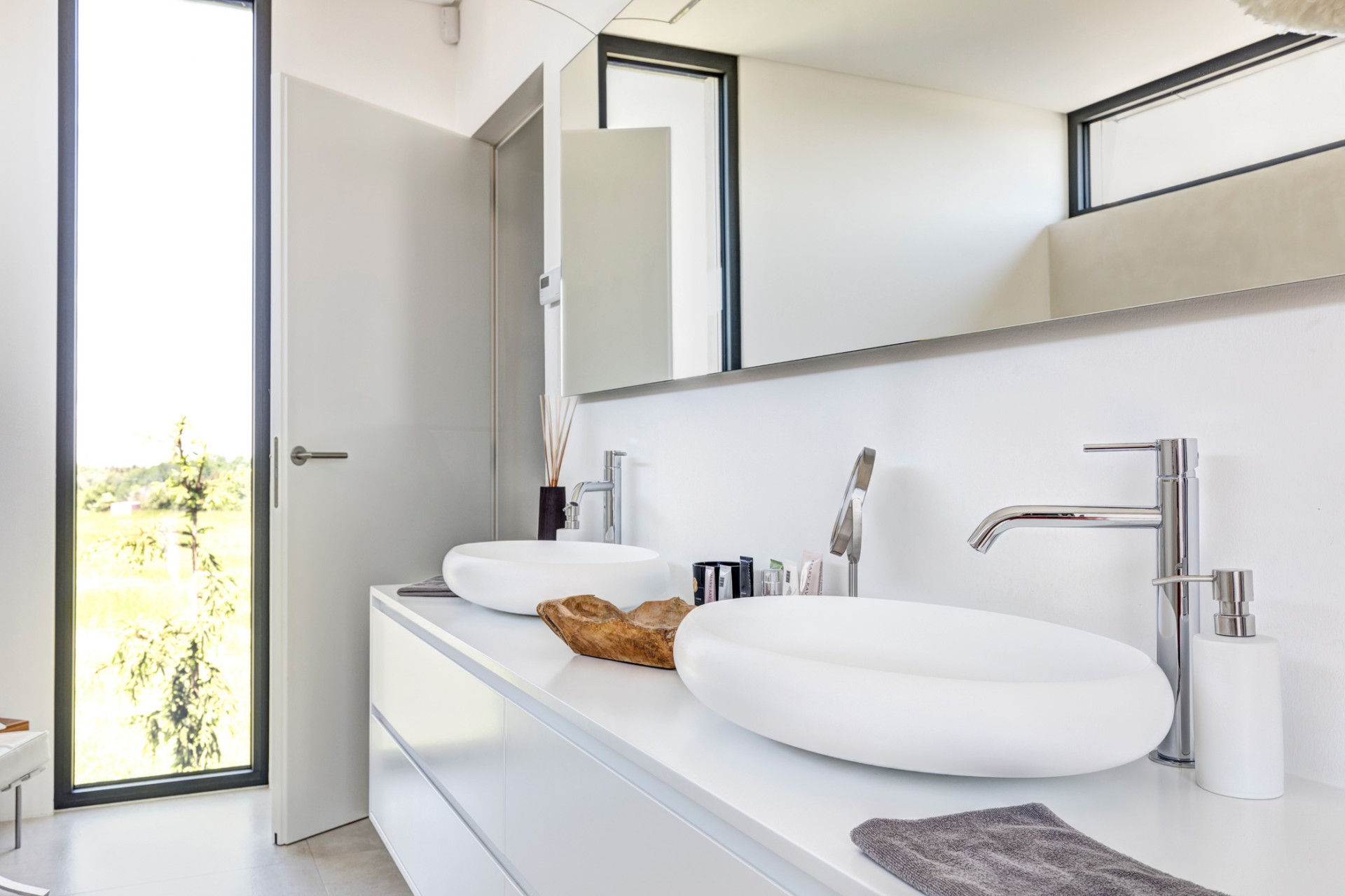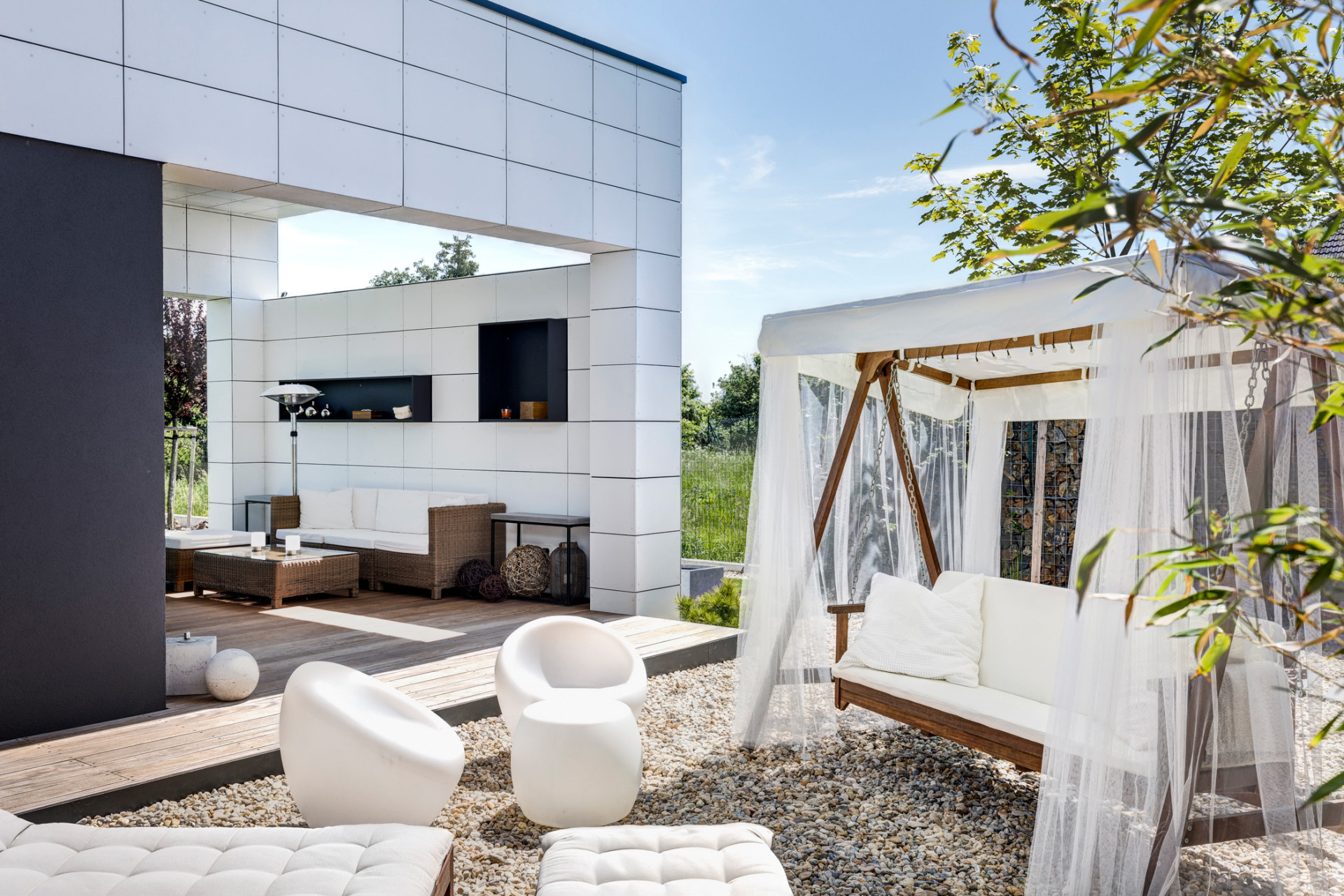 Interiéry domu jsou zařízeny střídmě, vybavení, ale i celková forma stavby, v náznaku přebírá vybrané prvky a principy z funkcionalistické architektury. „Měkký oblouk pokoje pro hosty oživuje interiér a odkazuje na funkcionalismus, se kterým majitelka domu sympatizuje,“ dodávají architekti. Pro fasády domu byly nakonec zvoleny bílé cementovláknité desky CEMBRIT Express (Cembrit aktuálně nabízí desky malého formátu v řadě Small Module), které kontrastují s tmavými rámy velkoformátových oken. Propojení interiérů s exteriérem se v domě za Prahou od architektů z ateliéru MOLNÁR-PERÁČEK odehrává na všech podlažích.