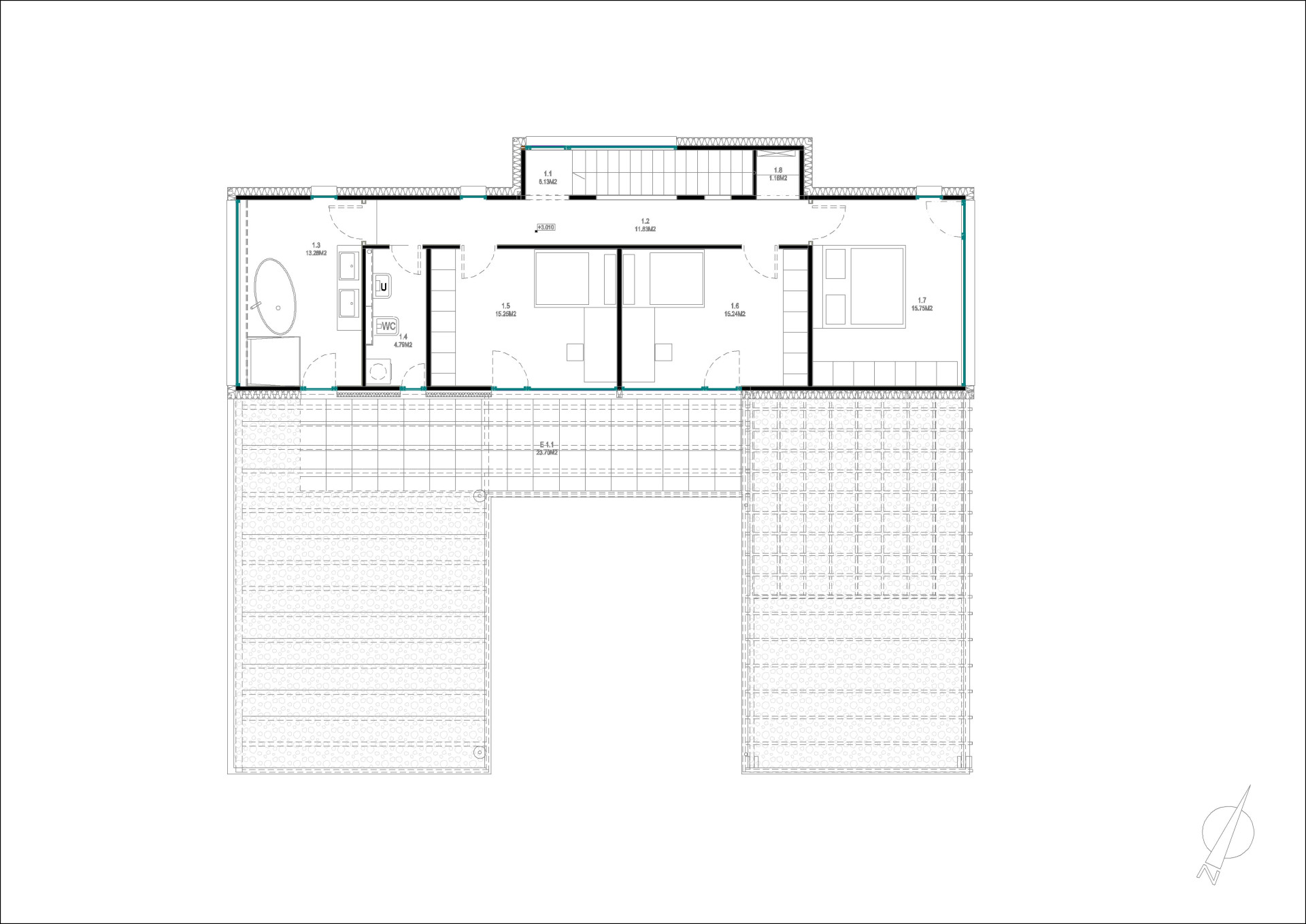 Technické a skladové prostory jsou společně s garáží situované také do přízemí. „Rozsáhlá dvojgaráž plynule přechází do skladu a ústí do krytého závětří vstupu domu,“ upřesňují architekti. Klidová část se třemi ložnicemi se nachází v patře. Zdejší pokoje taktéž těží z výhledu do zahrady, vystoupit se z nich navíc dá na rozlehlou pobytovou terasu.
