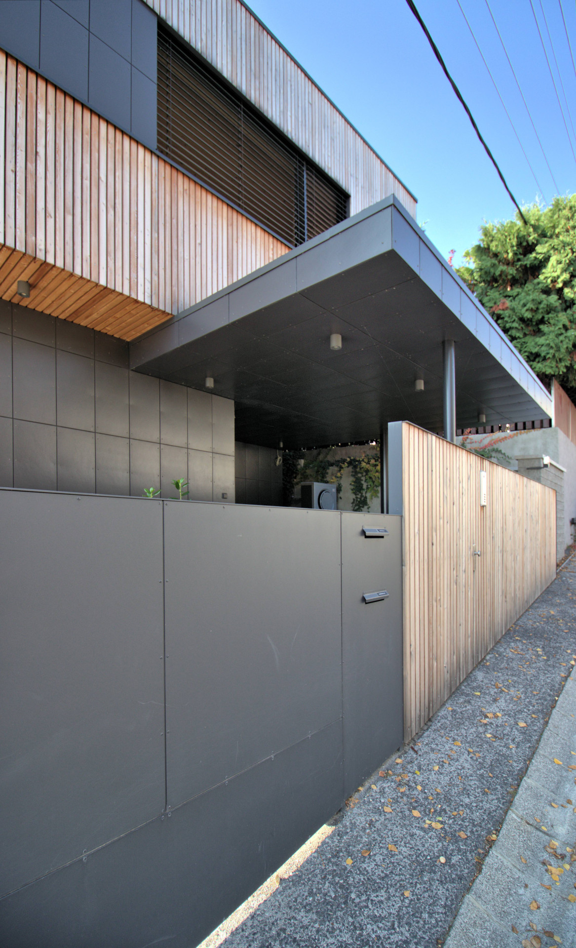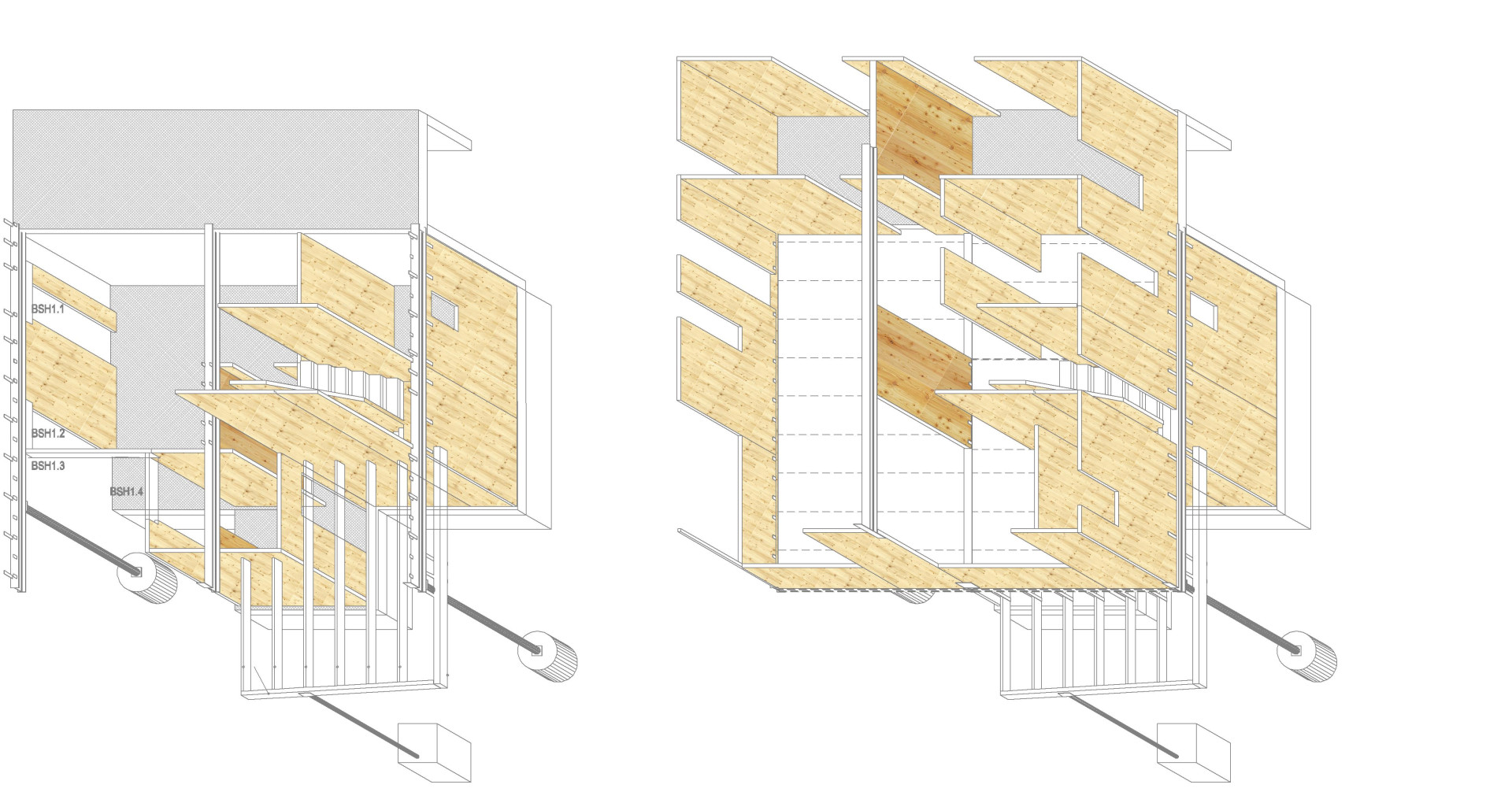 Nová dřevostavba nasedla do svažitého terénu. Přízemí se nachází na úrovni příjezdové cesty, ve stejné úrovni pak stojí i samostatná garáž. Malý apartmán, navržený především pro návštěvy majitelů, pak má k dispozici ještě krytou terasu. Druhá se nachází v patře. Horní podlaží se skrze ni navíc propojuje s podestou venkovního schodiště vedoucím k sousednímu rodinnému domu.