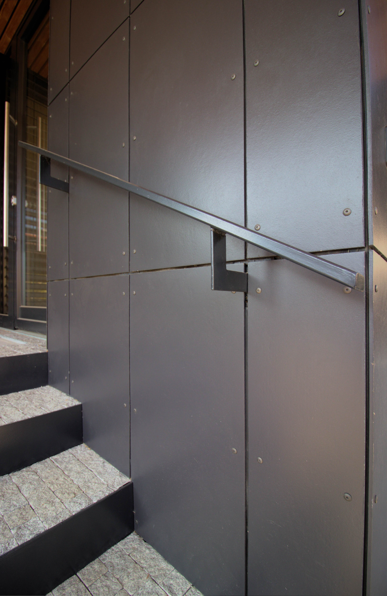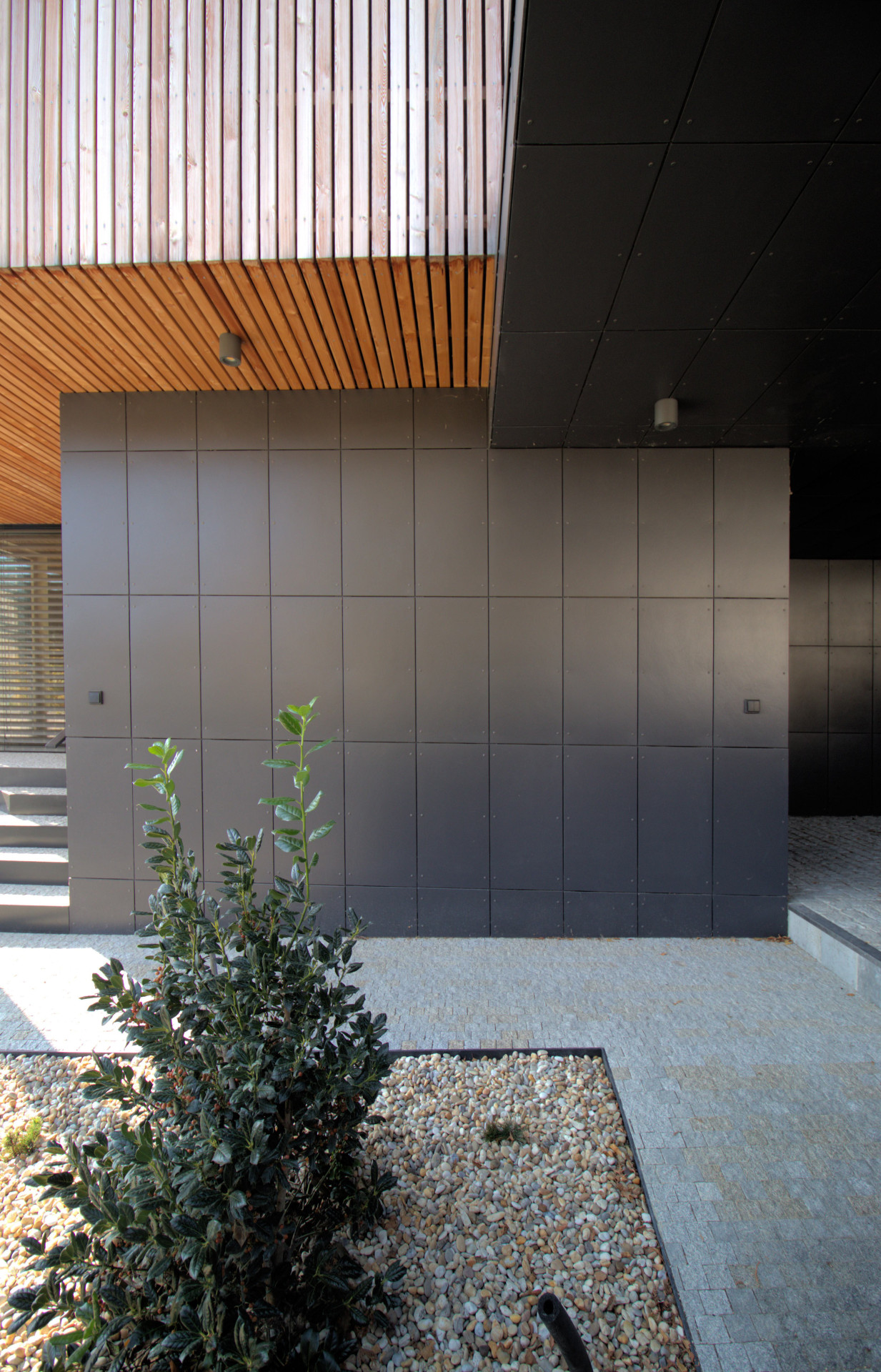 Celá stavba byla sestavena za použití CLT panelů, které zůstaly záměrně přiznané i v interiéru. Fasádu pak architekti navrhli obložit dřevem a také cemetovláknitými deskami CEMBRIT Express (Cembrit aktuálně nabízí desky malého formátu v řadě Small Module). S tmavě šedou barvou desek pak na domě korespondují i rámy oken nebo žaluzie a další detaily. „Celá fasáda je řešena jako provětrávaná, střecha je realizována jako dvouplášťová provětrávaná, tepelné izolace jsou téměř v plné míře přírodní na bázi dřevovlákna,“ dodávají architekti z ateliéru MOLNÁR-PERÁČEK.