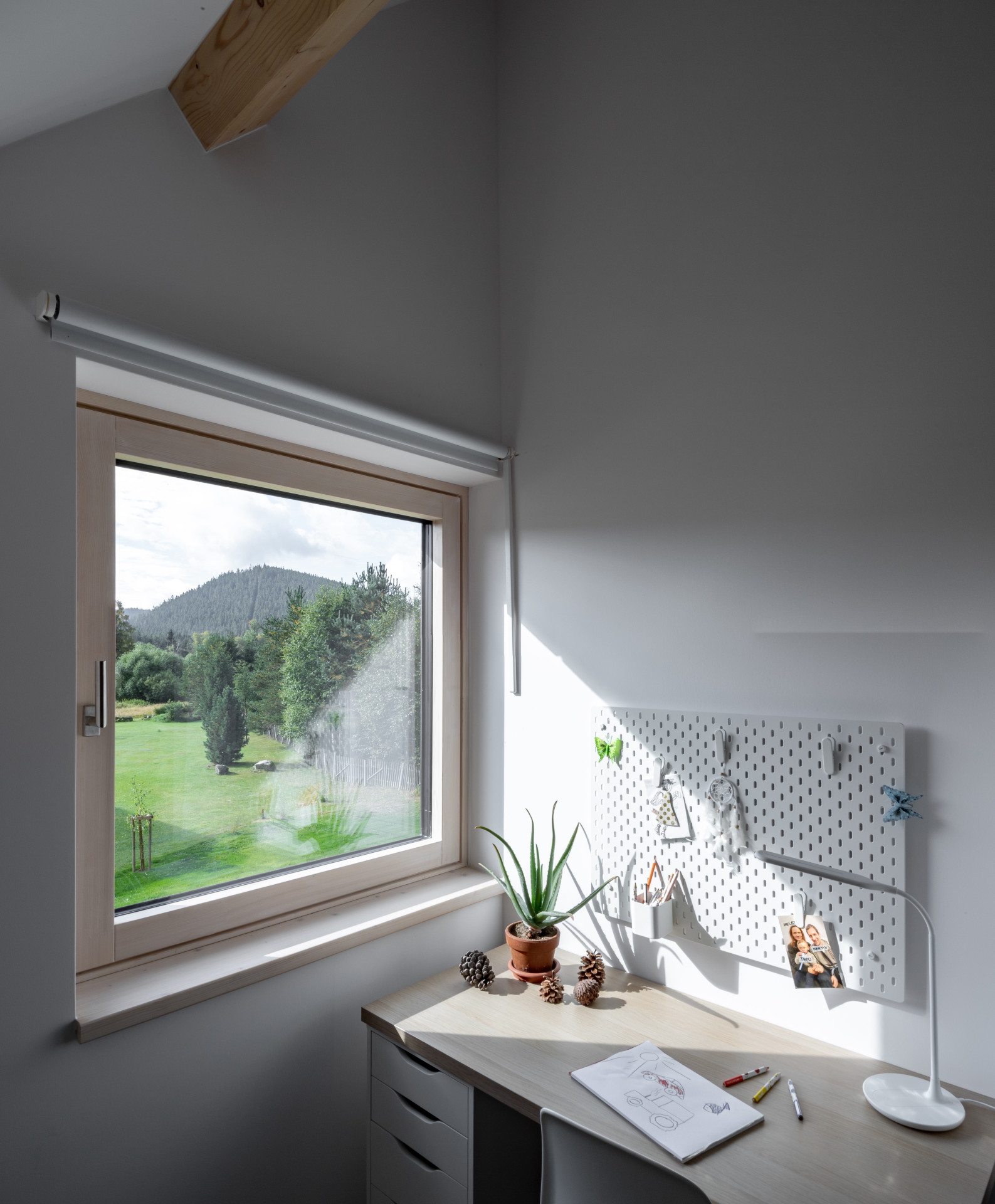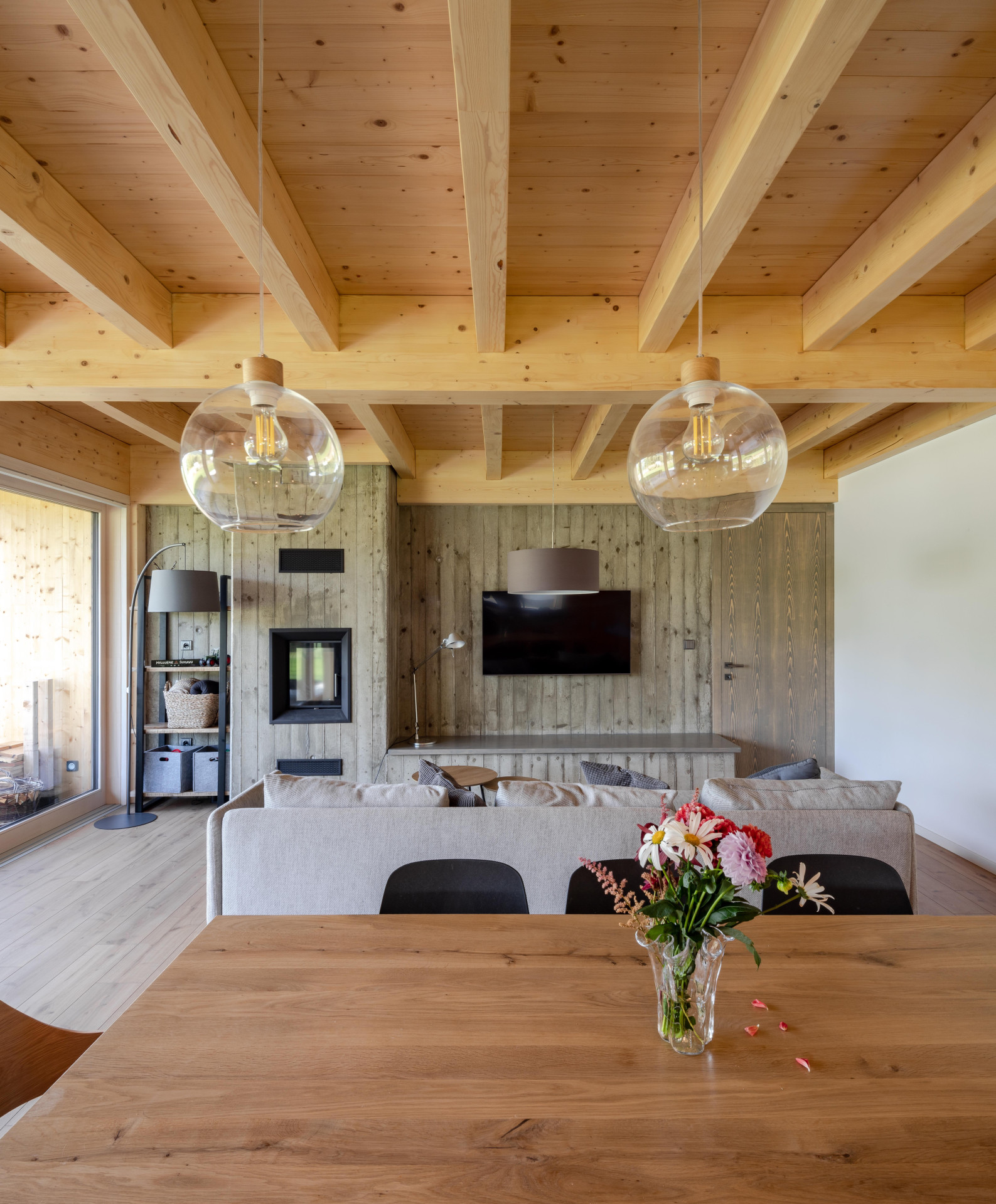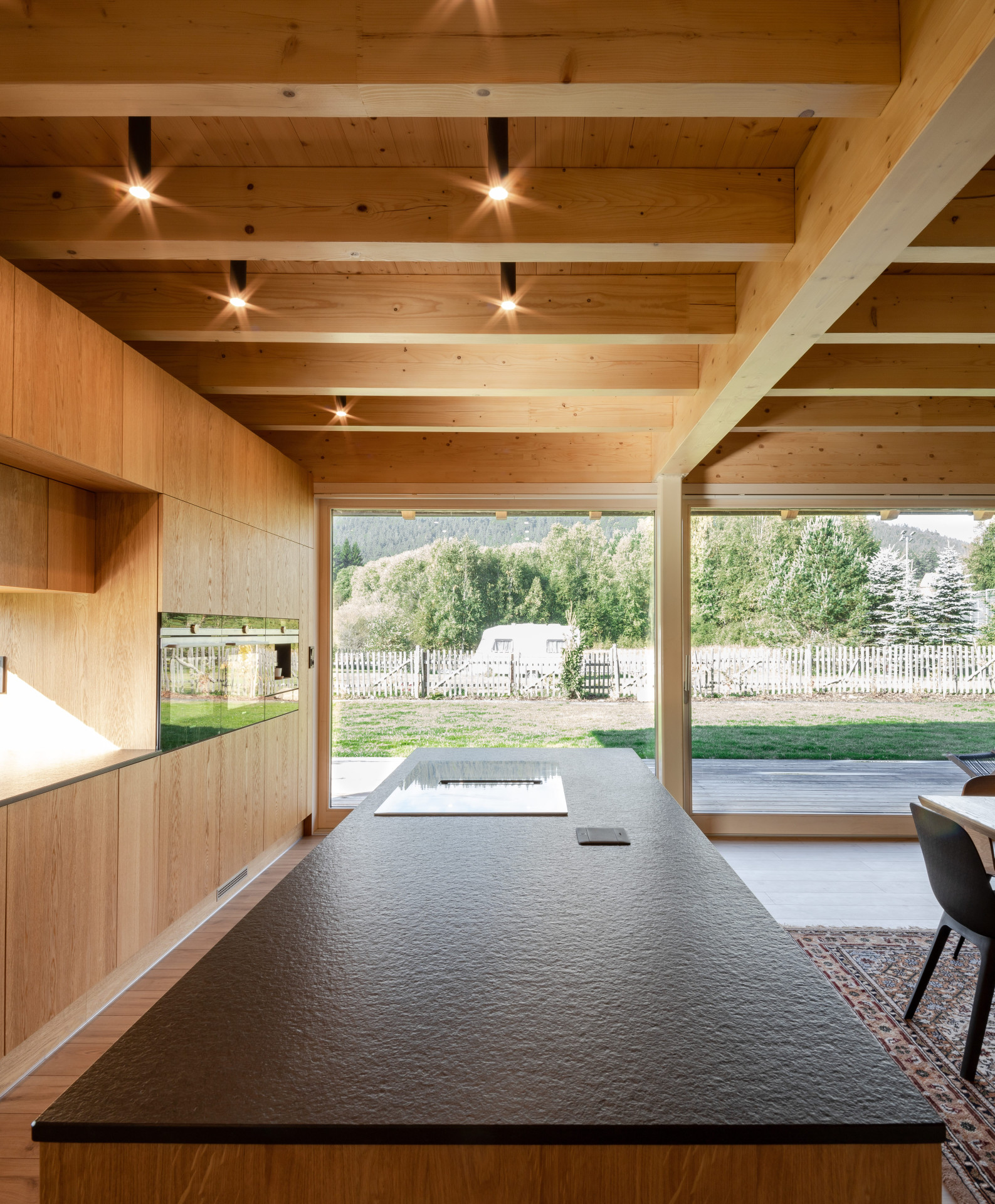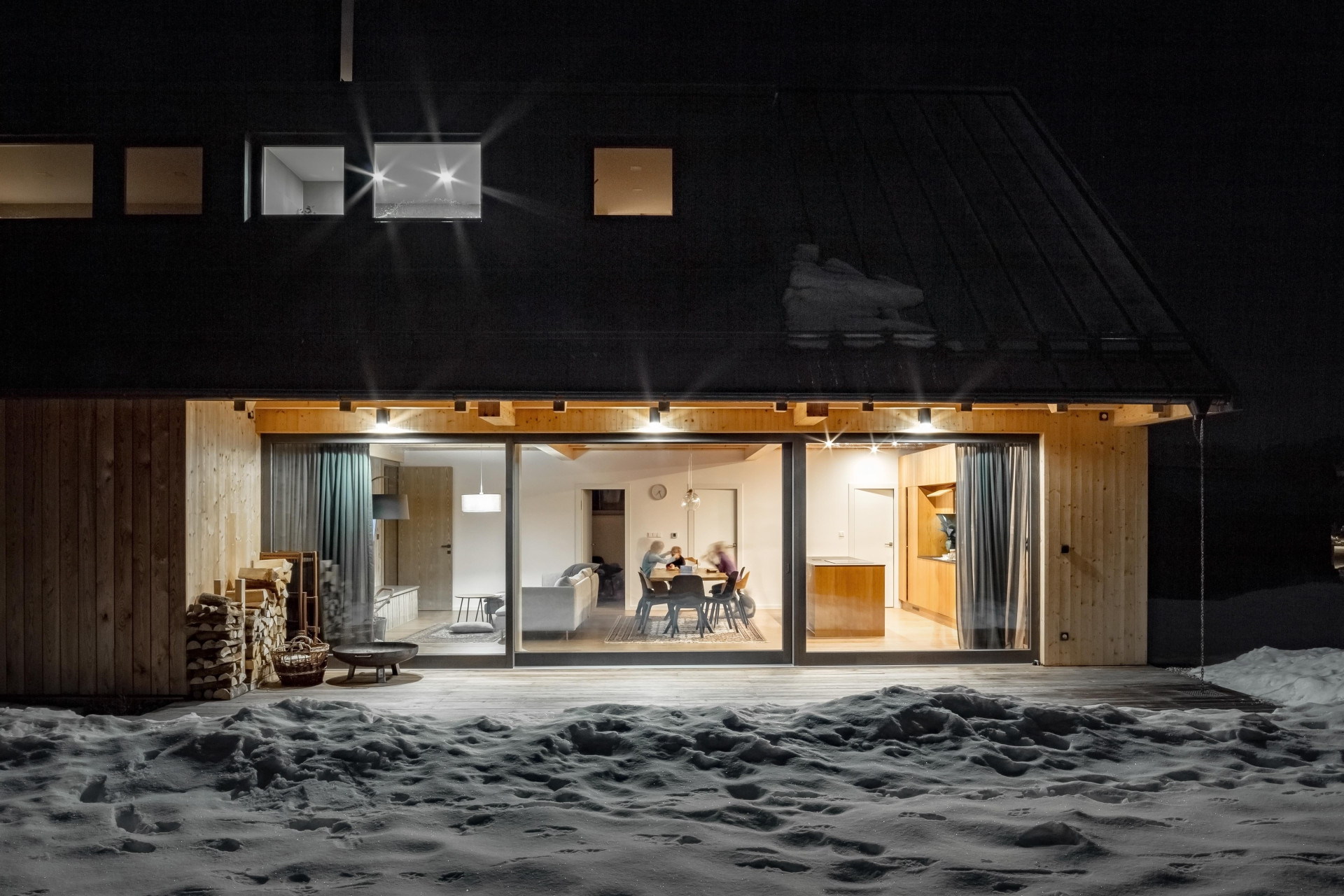 Také z těchto důvodů nechal autor návrhu vyznít hlavní uplatněné materiály, ať už jde o dřevo nebo pohledový beton tepelně-akumulačního jádra, do kterého je také v místě obytného prostoru integrován krb. Primárně je dům vytápěn tepelným čerpadlem.