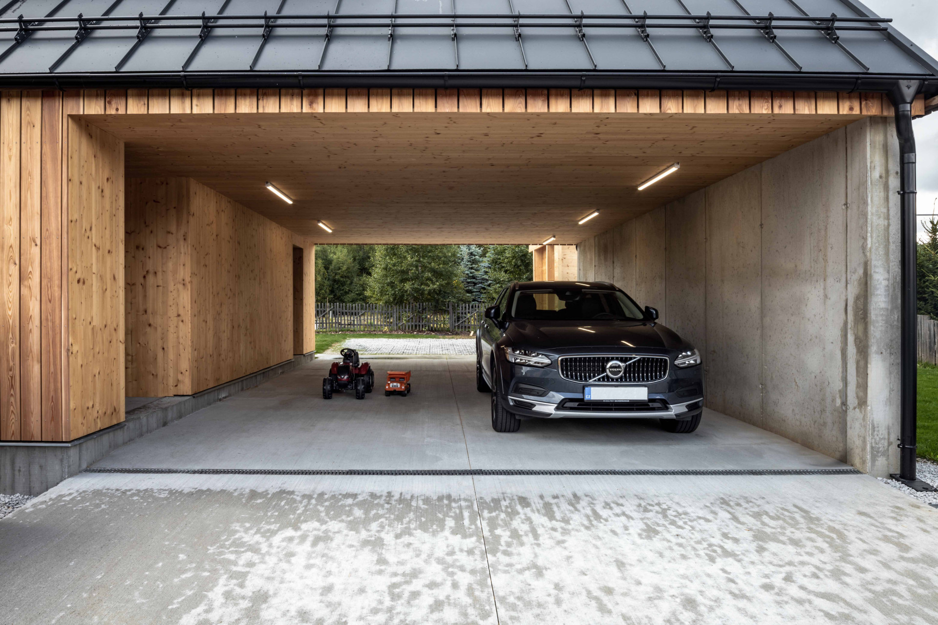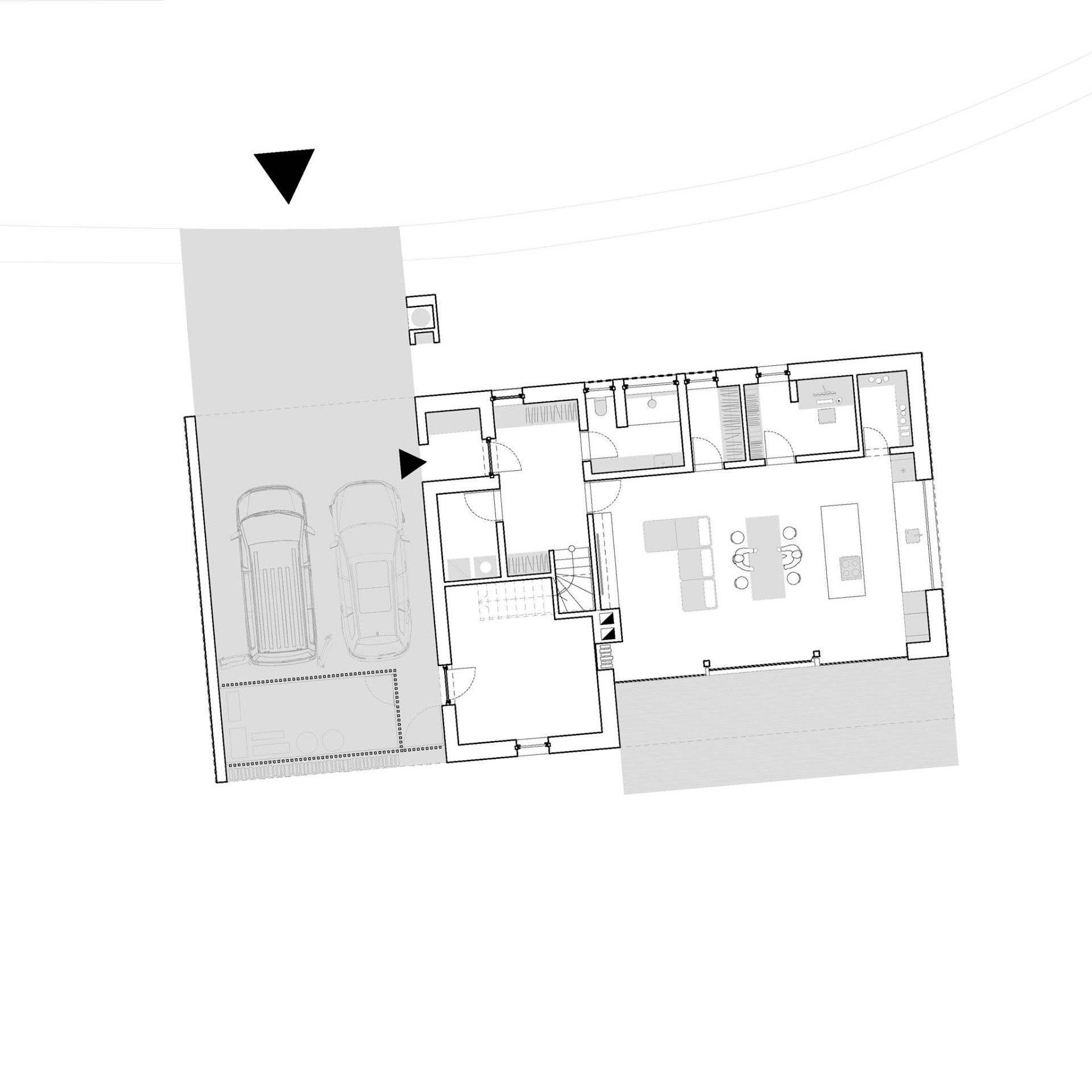 Zatímco směrem do ulice má dům malá okna, z opačné strany se do zahrady otevírá prosklenou stěnou propojující hlavní obývací prostor se zahradou. Do domu se vstupuje přes kryté parkovací stání začleněné přímo do hmoty domu. Soukromé pokoje pětičlenné rodiny najdeme v podkroví, každý má přitom vlastní šatnu, rodiče a děti pak mají k dispozici dvě samostatné koupelny.
