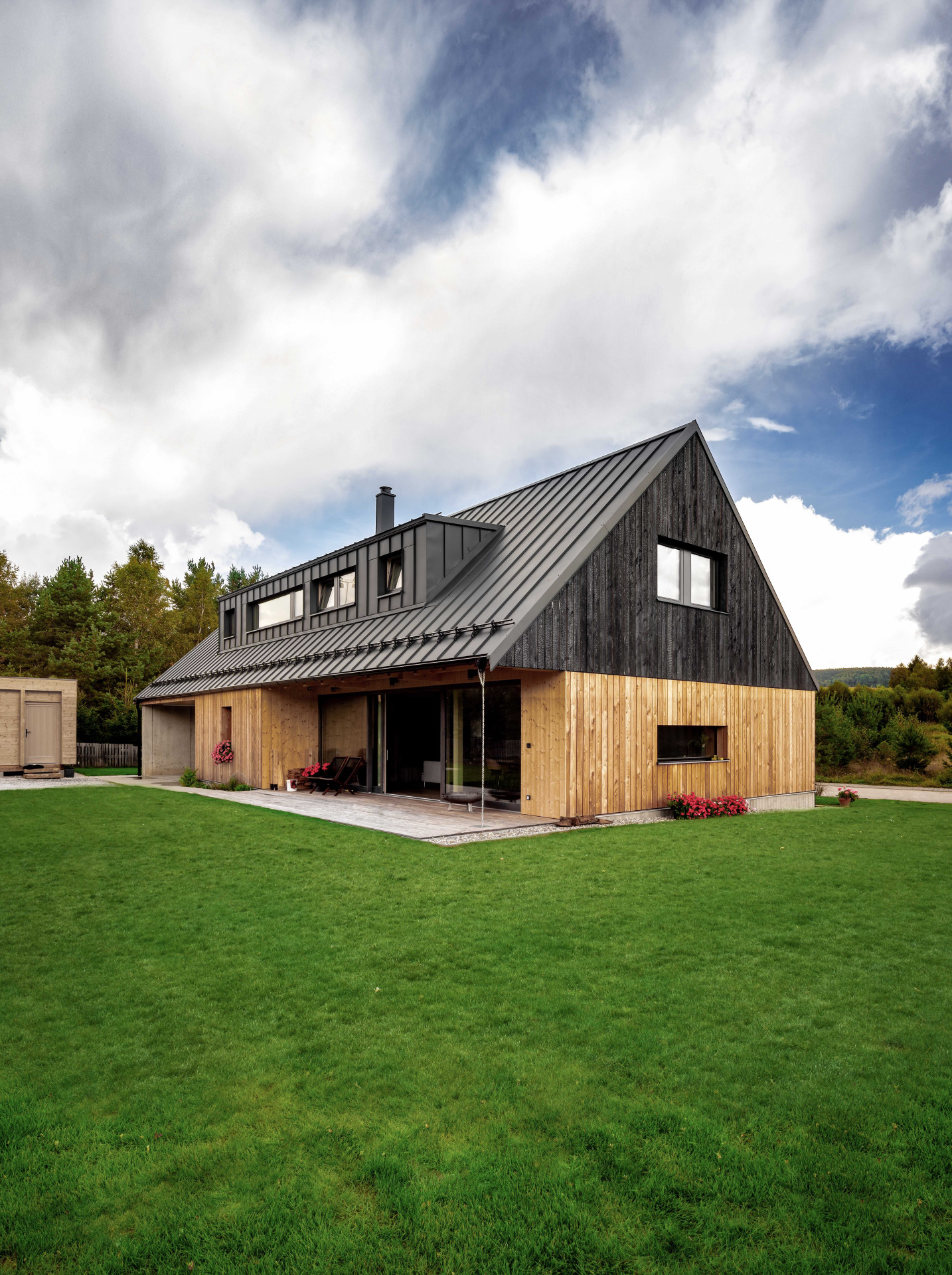 Protože se dům nachází v obci Borová Lada ležící přímo na hranicích Národního parku Šumava, musel autor návrhu zohlednit také jeho regulativy. Při pohledu zvenčí dům zaujme především kontrastně pojatou fasádou z modřínových prken – pro štíty bylo použité opalované modřínové dřevo, zbylé části fasád pak pokrývají prkna bez povrchové úpravy, takže časem získají charakteristickou šedou patinu.