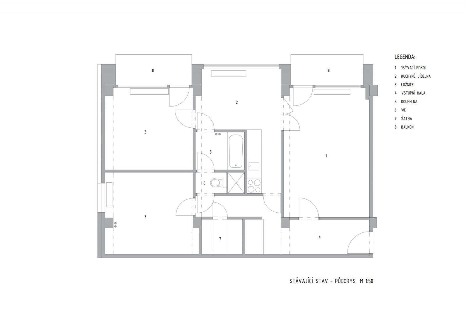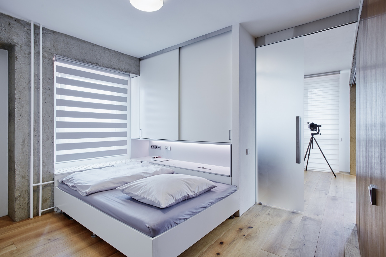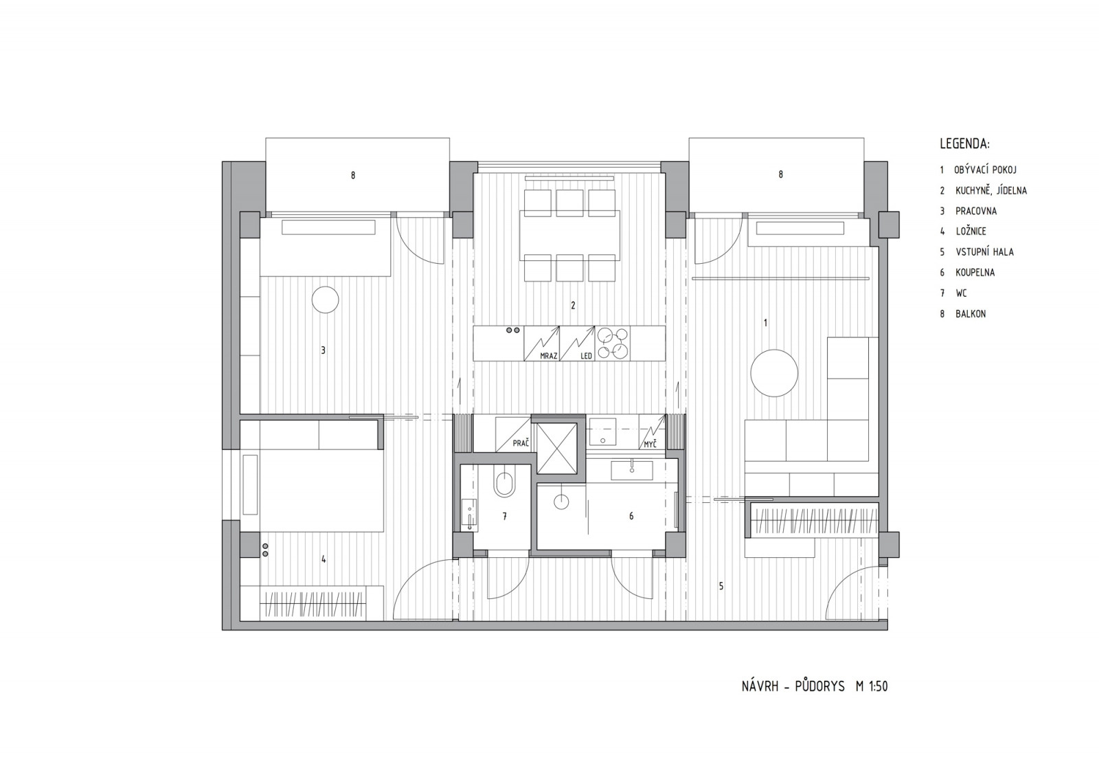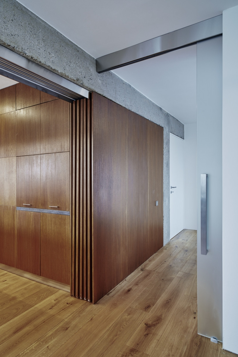 Hlavním komunikačním uzlem bytu se stala vstupní hala, která se otevírá do obývacího pokoje a ložnice a zároveň se z ní vstupuje i do koupelny. Oddělení jednotlivých místností zajišťují subtilní příčky. „Klient kladl velký důraz na variabilitu prostoru, proto bylo nutné do objektu zakomponovat posuvné dřevěné stěny, jimiž je možné vytvořit oddělené místnosti. Současně však byt působí jako jeden velký obytný prostor neboli loft,“ popisuje záměr Klára Makovcová.